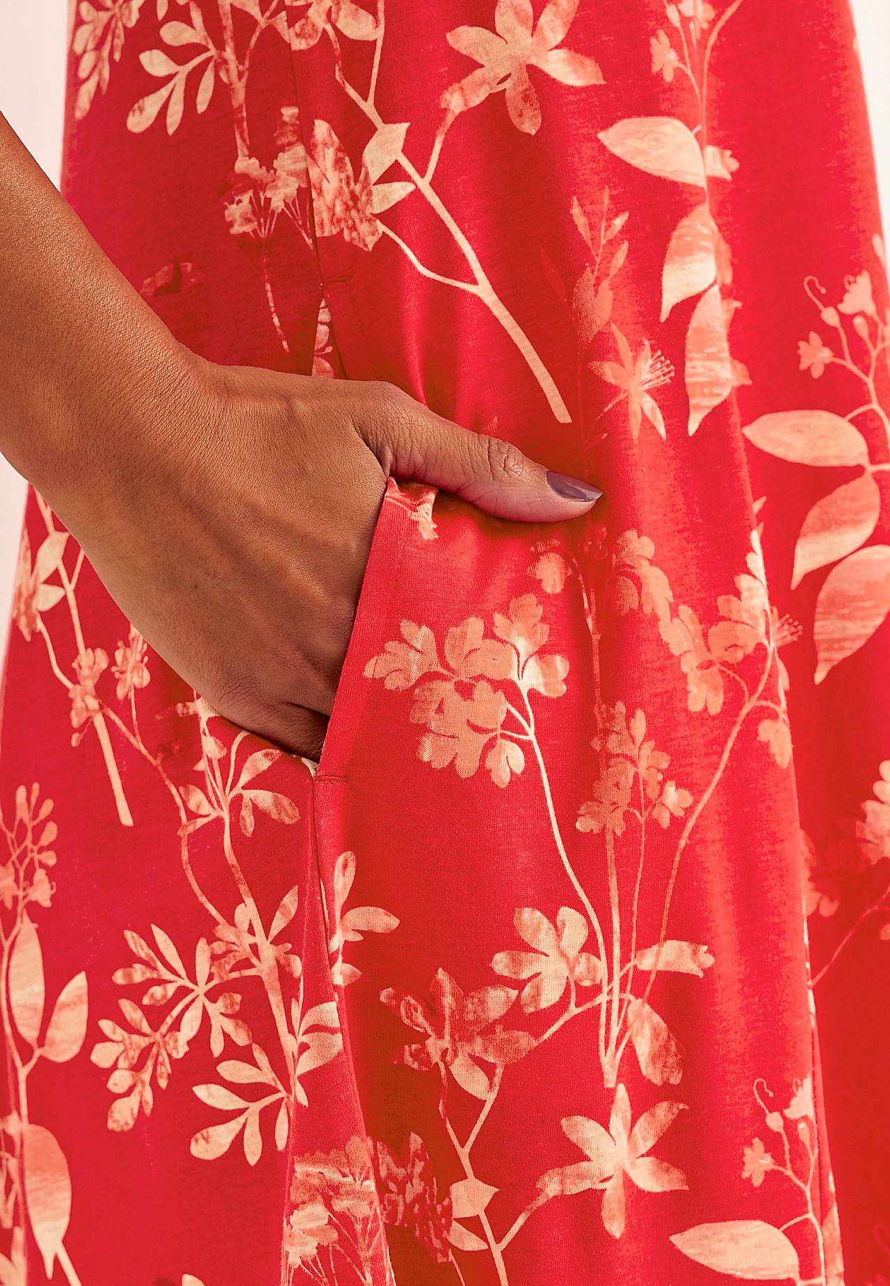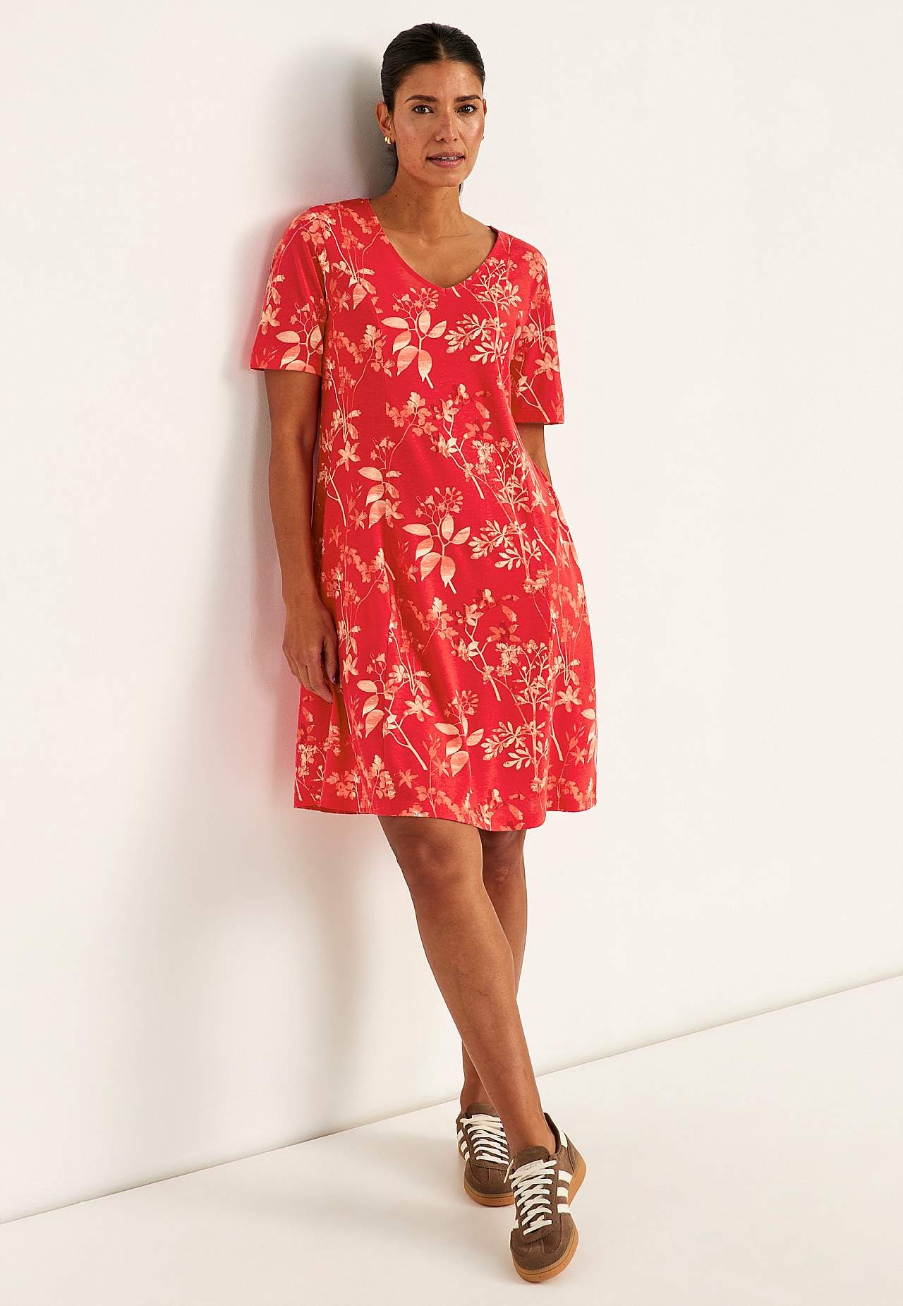 Pehmeä, mukava mekko puuvillaviskoosisekoitteesta. Vartaloa hieman myötäilevä, tiukka istuvuus rinnan yli. V-kaula-aukkoinen kaula-aukko. Levenevä alaosa ja koristesaumat sekä edessä ja takana. Lyhyet hihat. Mukavat sivutaskut. Suora alaosa. Takapituus koon mukaan n. 96-108 cm.