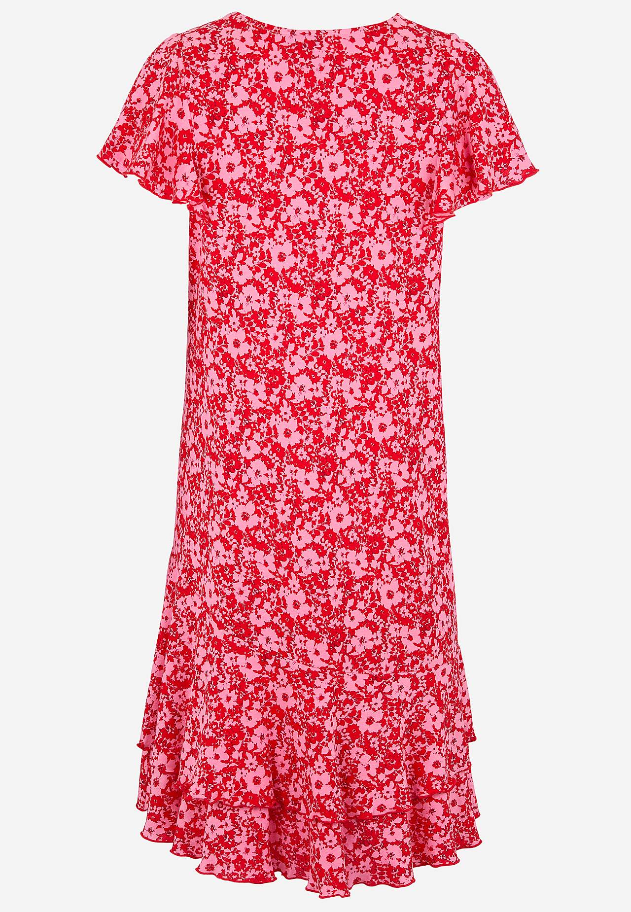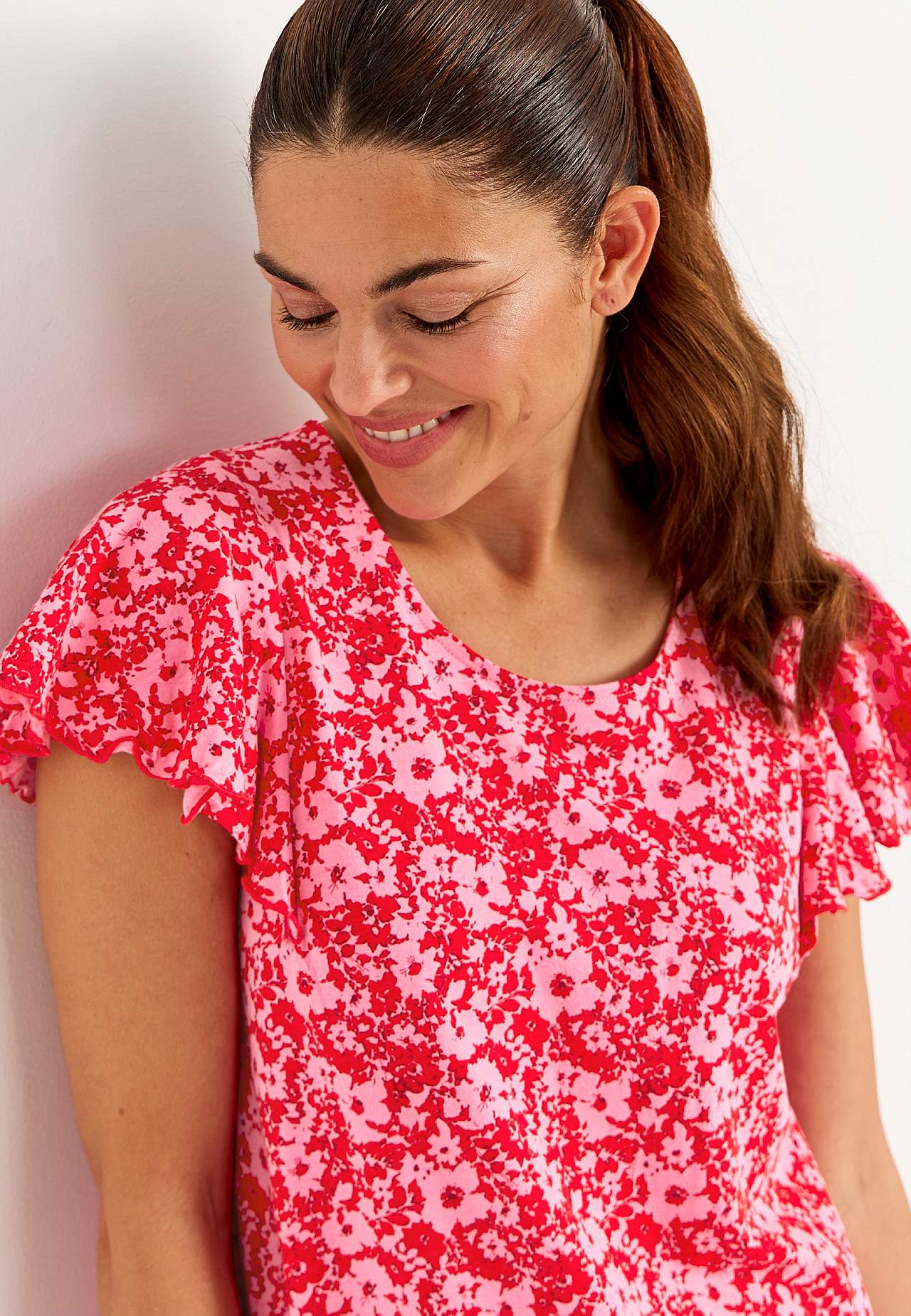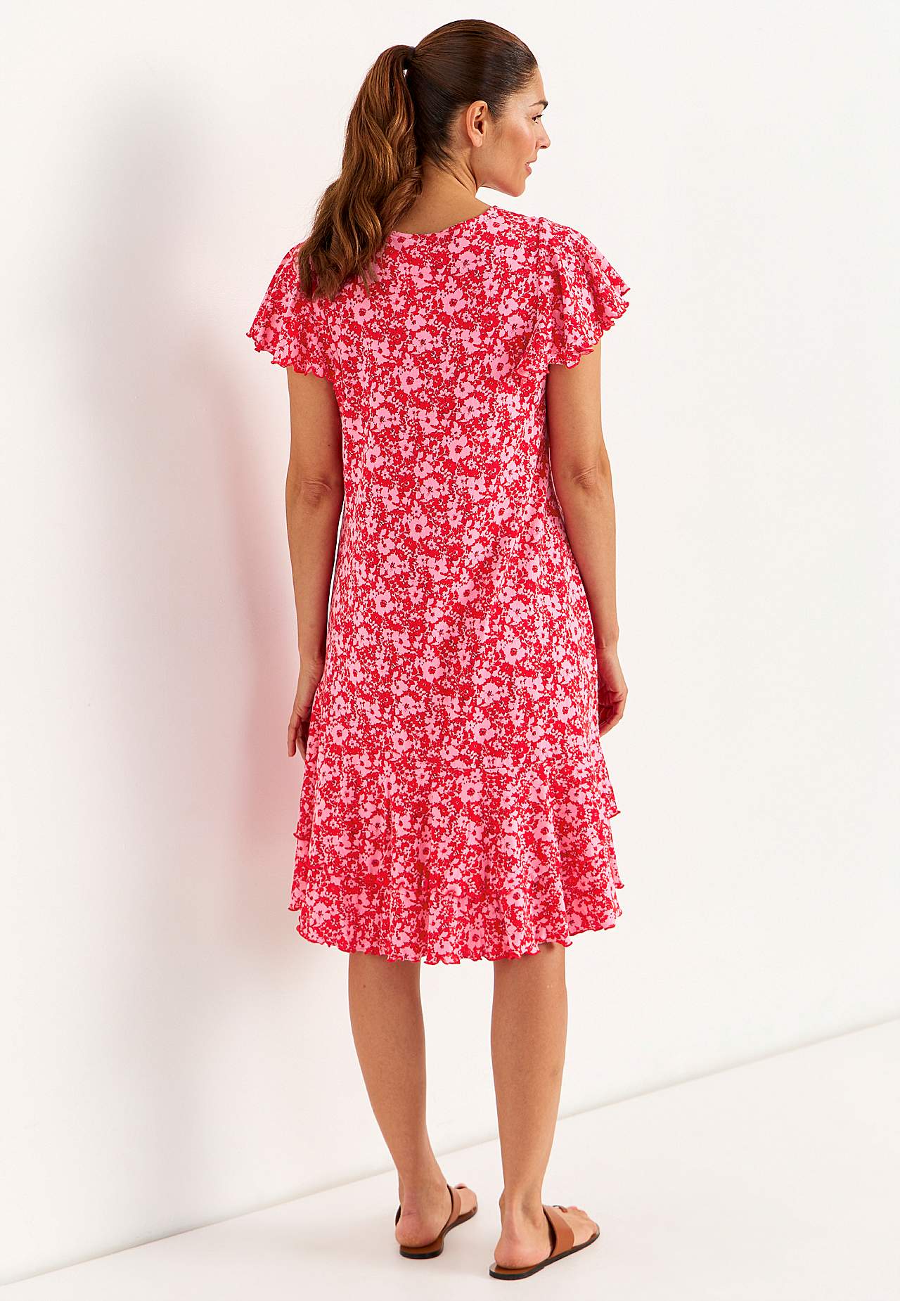 Mekko asymmetrisellä saumalla ja kaksinkertaisilla röyhelöillä alhaalla. Pehmeä trikoo puuvillaviskoosisekoitteesta. Vartalonmyötäinen istuvuus leveämmällä hameosalla. Pyöreä kaula-aukko. Lyhyet perhoshihat saumurilla huolitellulla, koristeellisella, aaltoilevalla reunalla. Rintamuotolaskos. Röyhelöt alhaalla saumurilla huo... Lue lisää