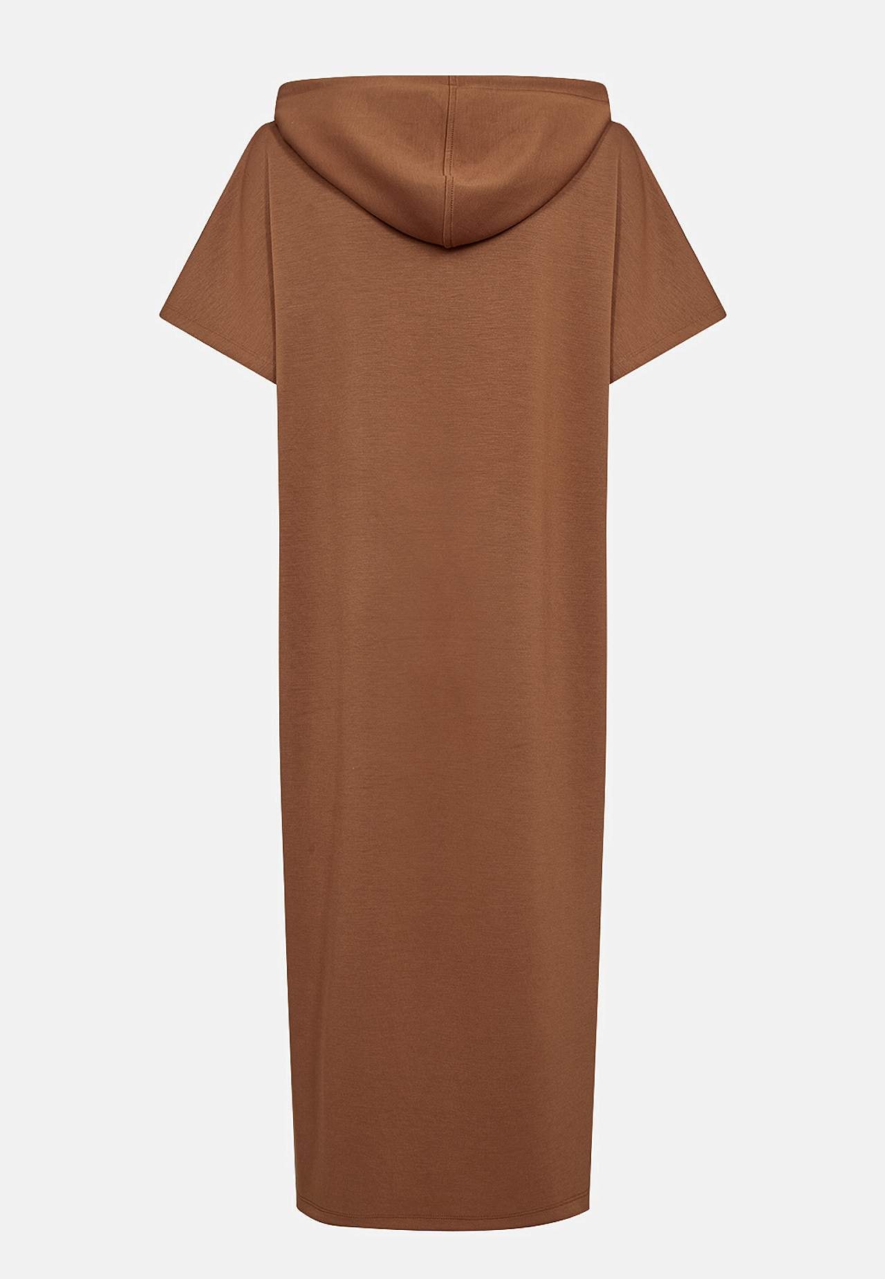 Mekko ihanan pehmeästä modaalisekoitteesta ja hieman paksummasta trikoosta. Suora istuvuus. Suuri huppu kiristysnyörillä. Tekstiprintti edessä. Kengurutasku edessä. Lyhyet hihat. Suora helma halkiolla sivuilla. Pituus olkapäästä n. 114 cm koossa S (38).