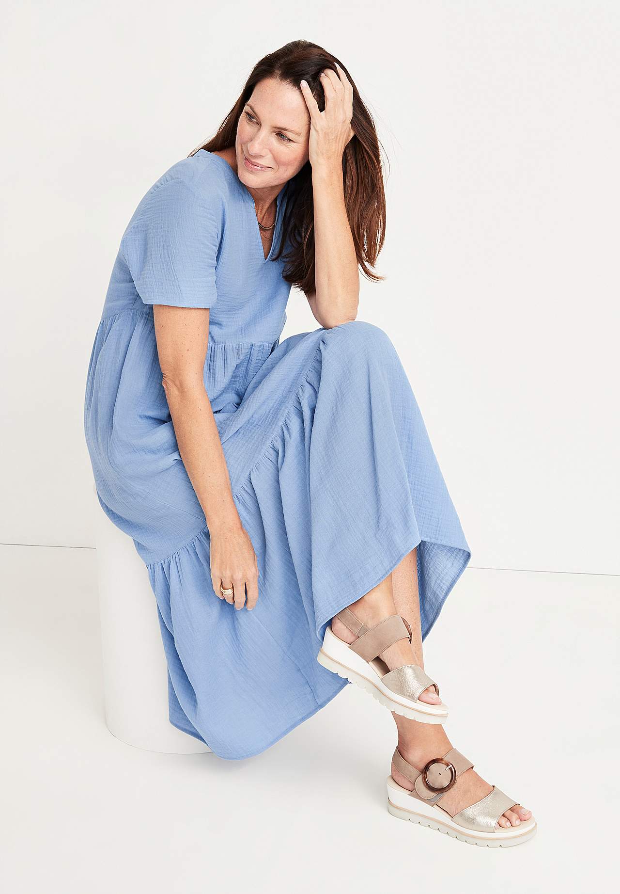 Pitkä, rypytetty puuvillamekko