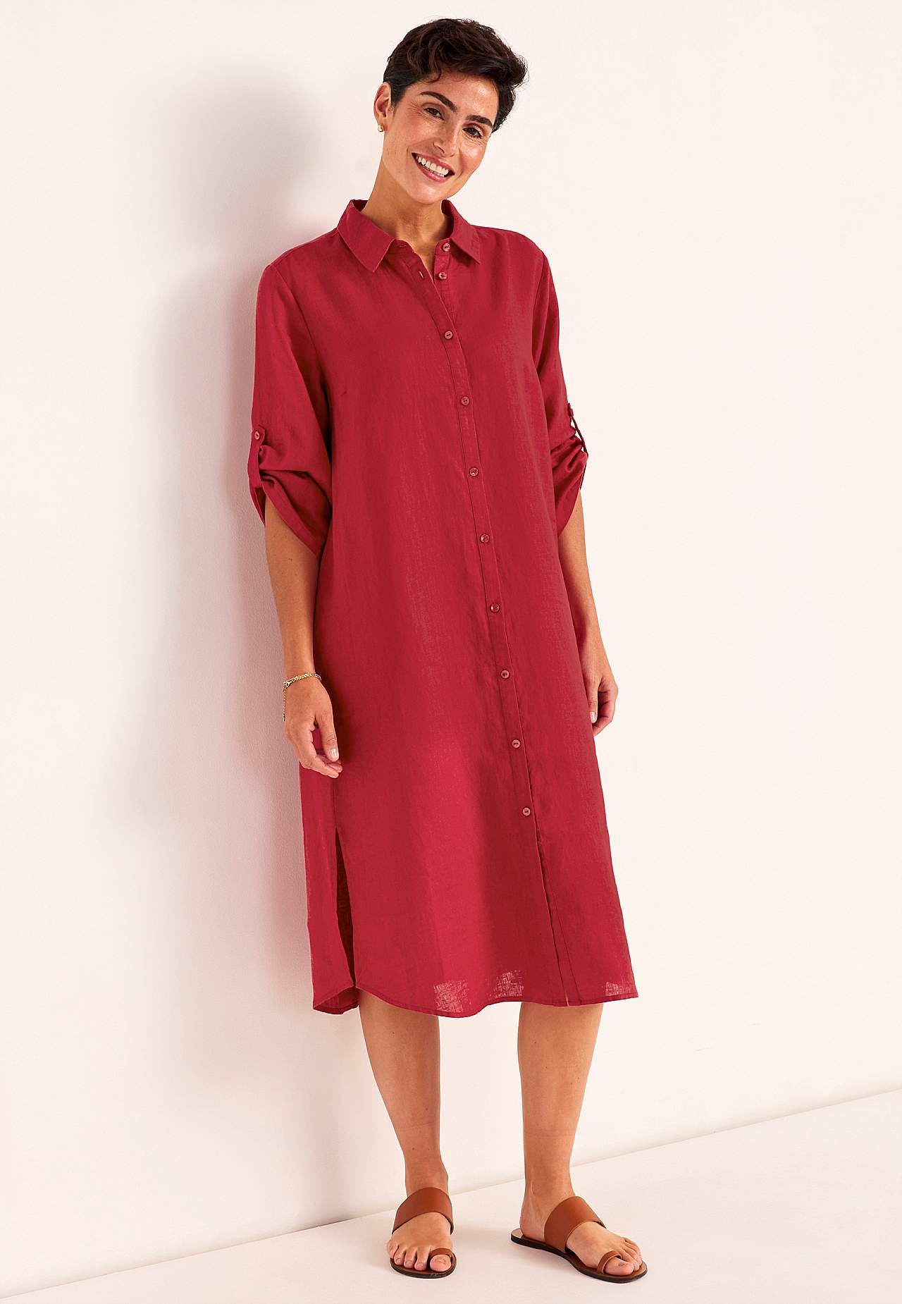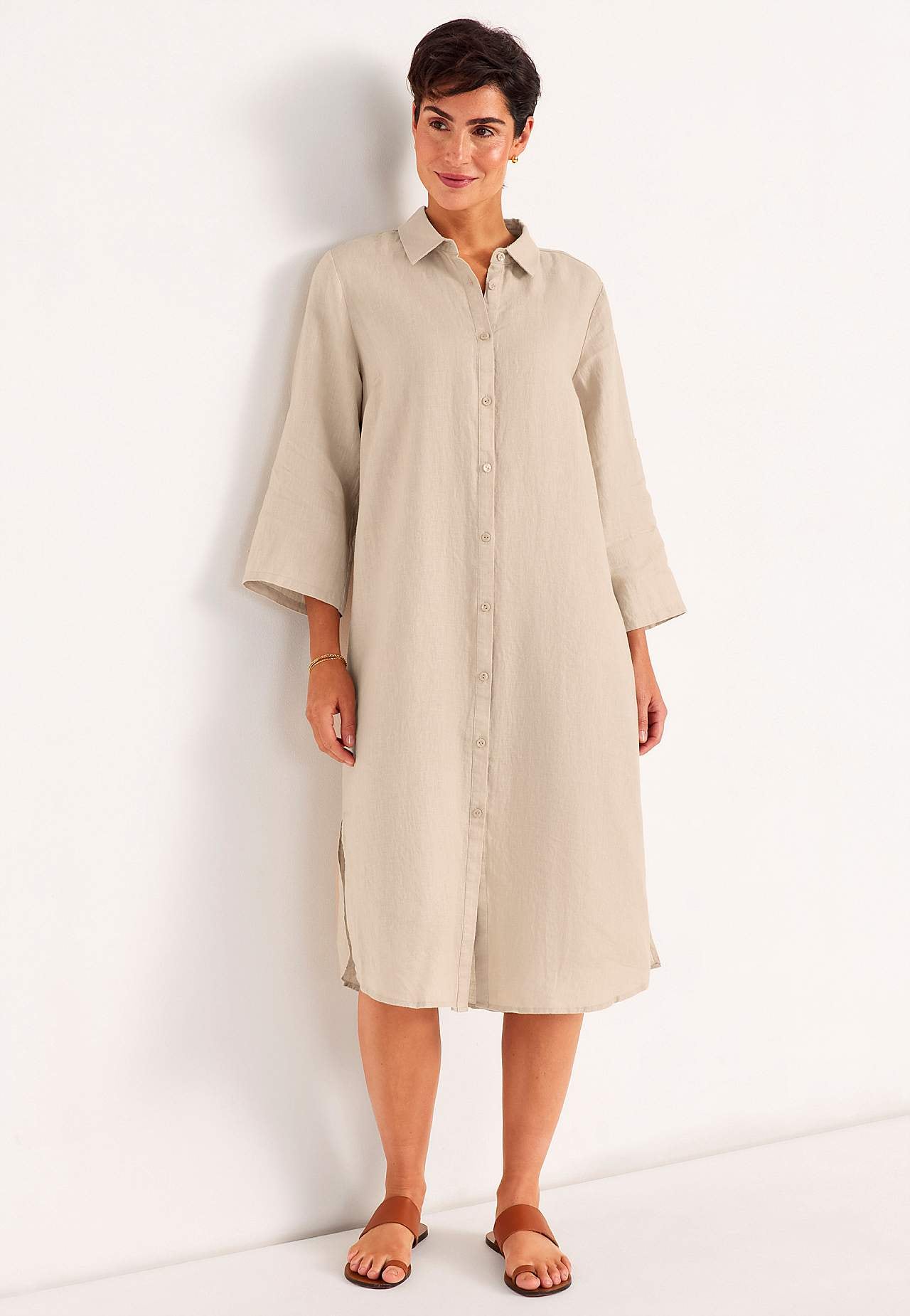 Paitamekko 100% pellavasta. Ilmava materiaali. Tilava, suoraan leikattu istuvuus. Nappilista ylhäältä alas. Taitettava pitkä hiha nappiyksityiskohdalla. Laskokset rintamuksessa parasta istuvuutta varten. Todellinen arkisuosikki. Pituus olkapäältä koon mukaan noin 116-124 cm.