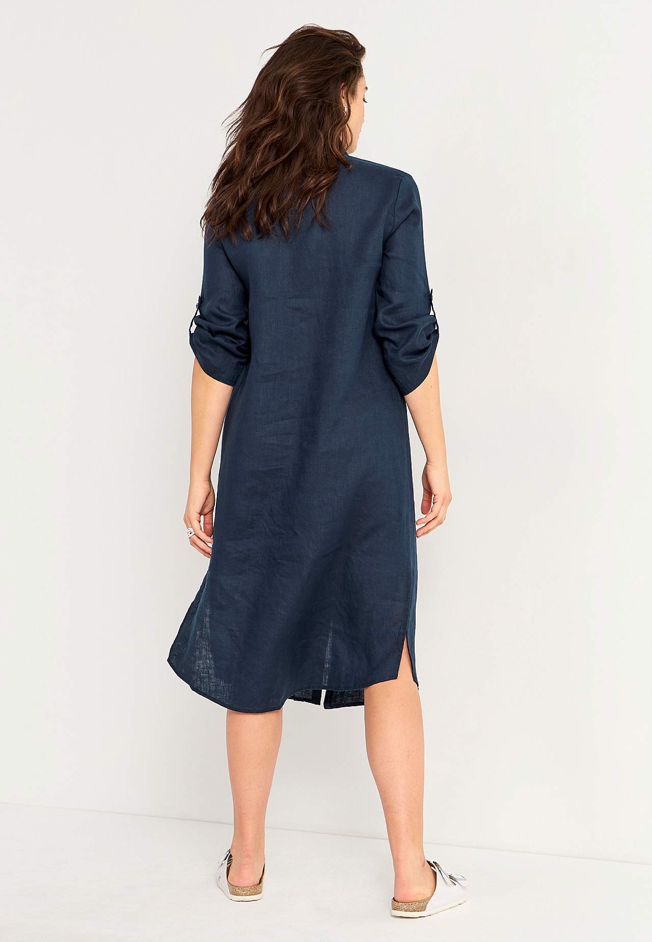 Paitamekko 100% pellavasta. Ilmava materiaali. Tilava, suoraan leikattu istuvuus. Nappilista ylhäältä alas. Taitettava pitkä hiha nappiyksityiskohdalla. Laskokset rintamuksessa parasta istuvuutta varten. Todellinen arkisuosikki. Pituus olkapäältä koon mukaan noin 116-124 cm.