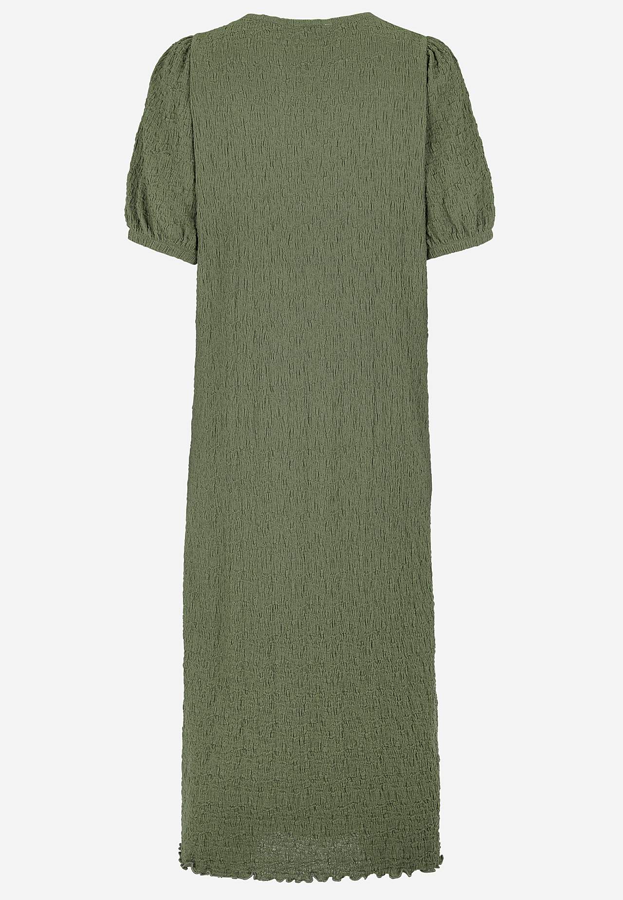Naisellinen mekko mukavasta puuvillasekoitteesta. Joustava materiaali sommitelmalla. Normaali istuvuus rennolla leveydellä alhaalla. Pyöreä pääntie. Rypytys olkapäissä. Lyhyet puhvihihat resorilla hihansuissa. Saumurilla huoliteltu, aaltoileva helma. Pituus olalta n. 122 cm kaikissa kooissa.