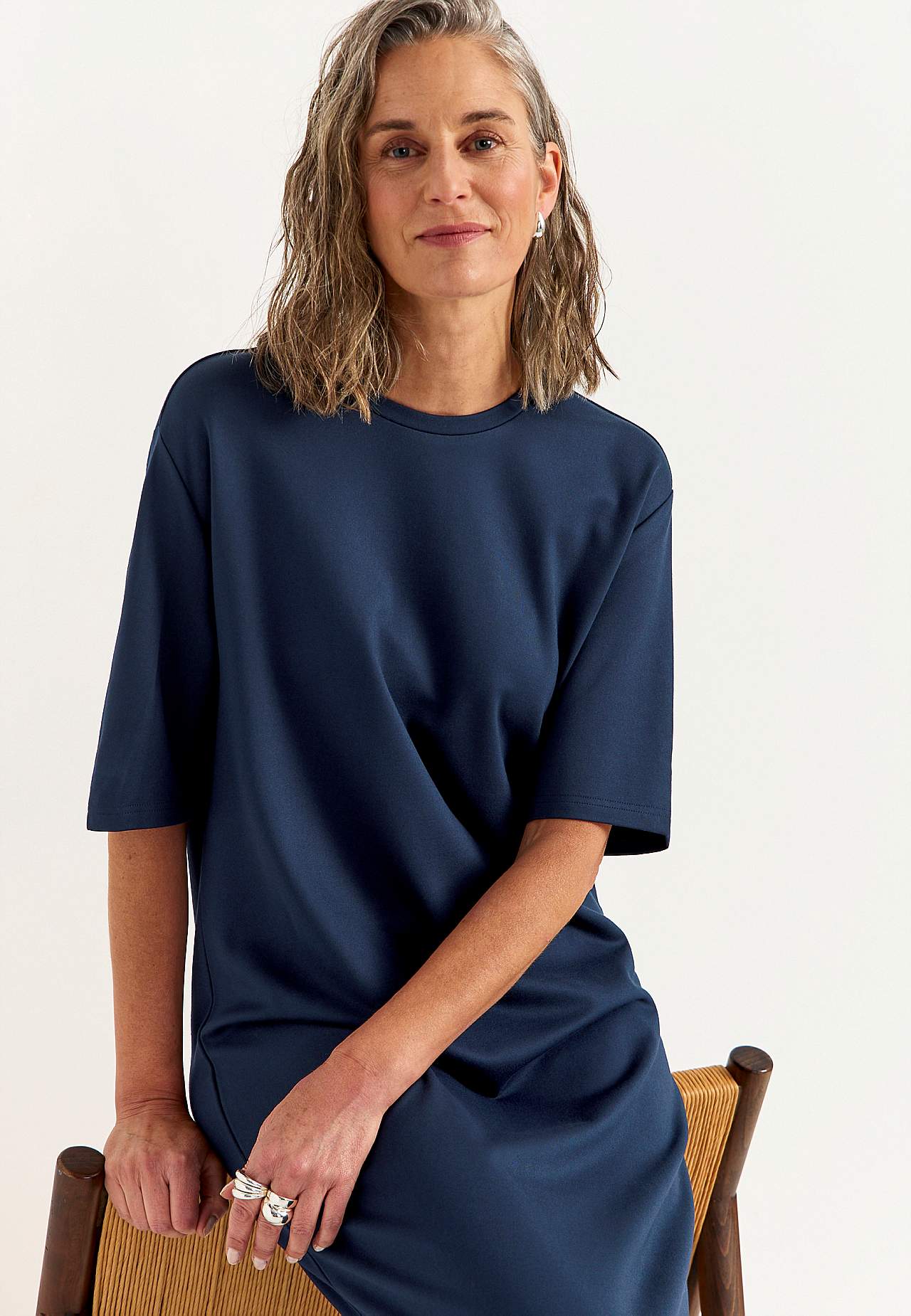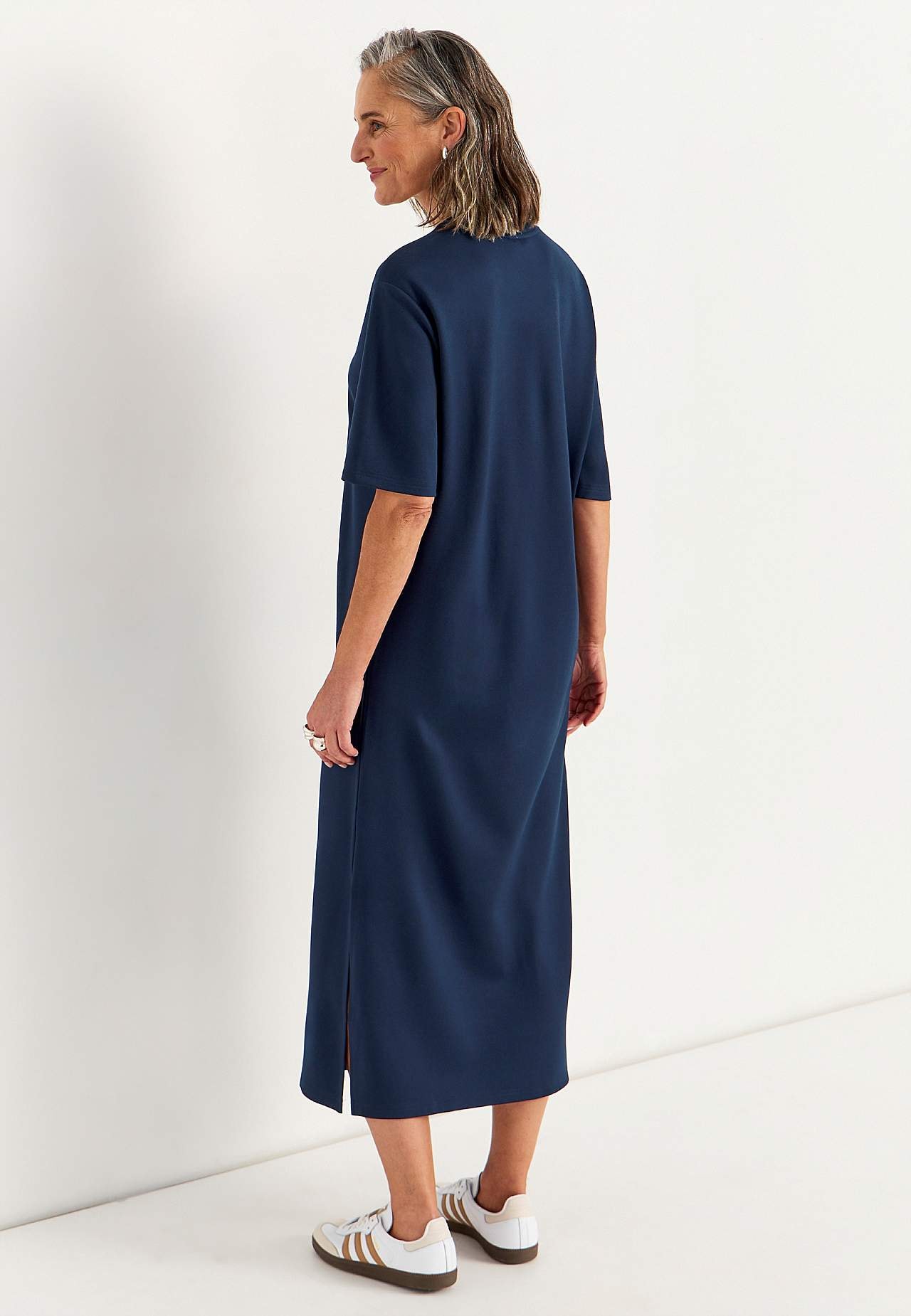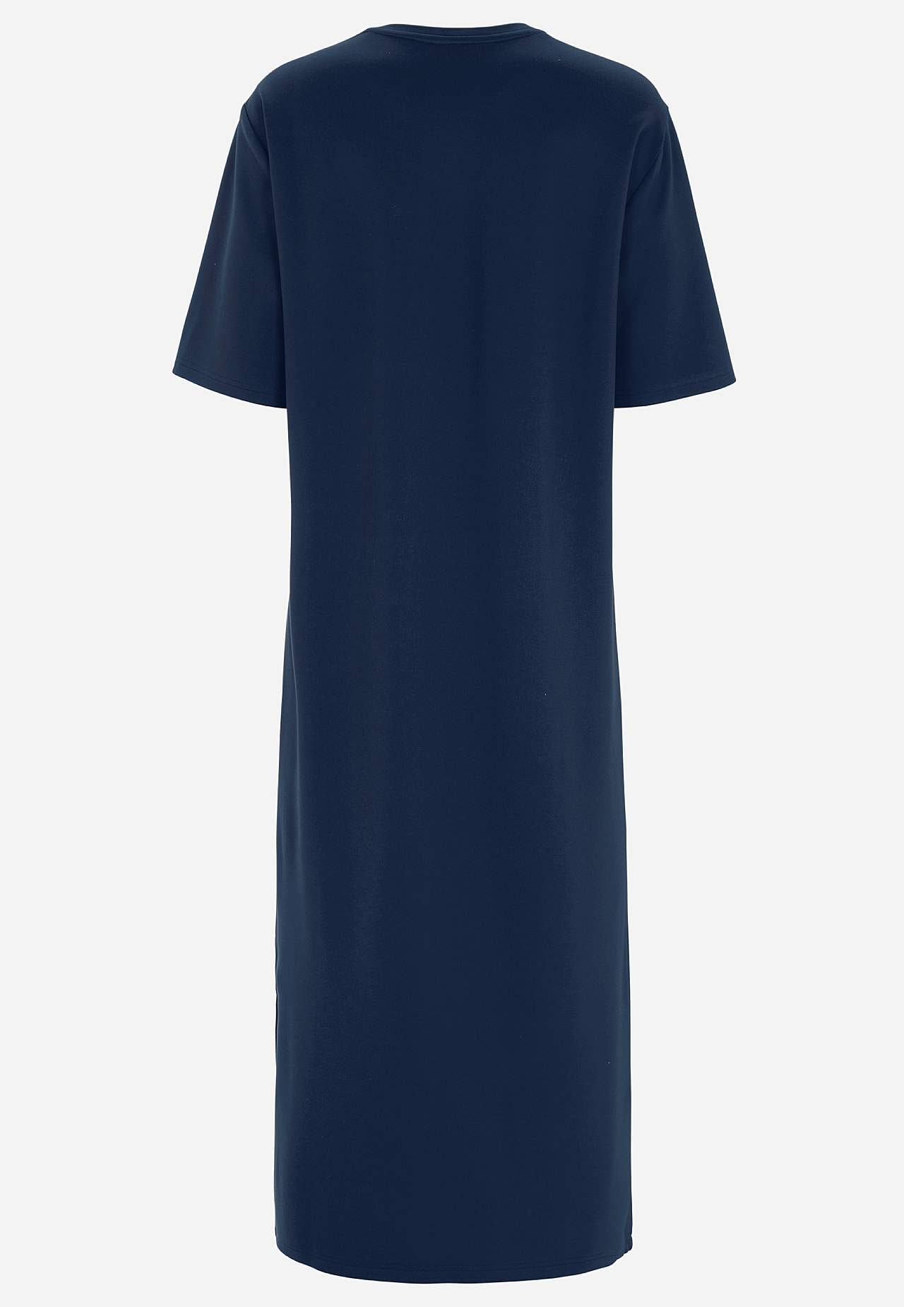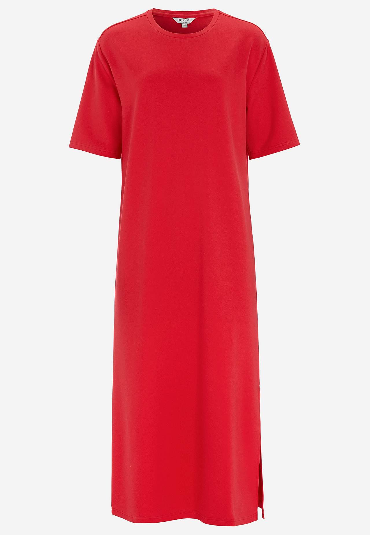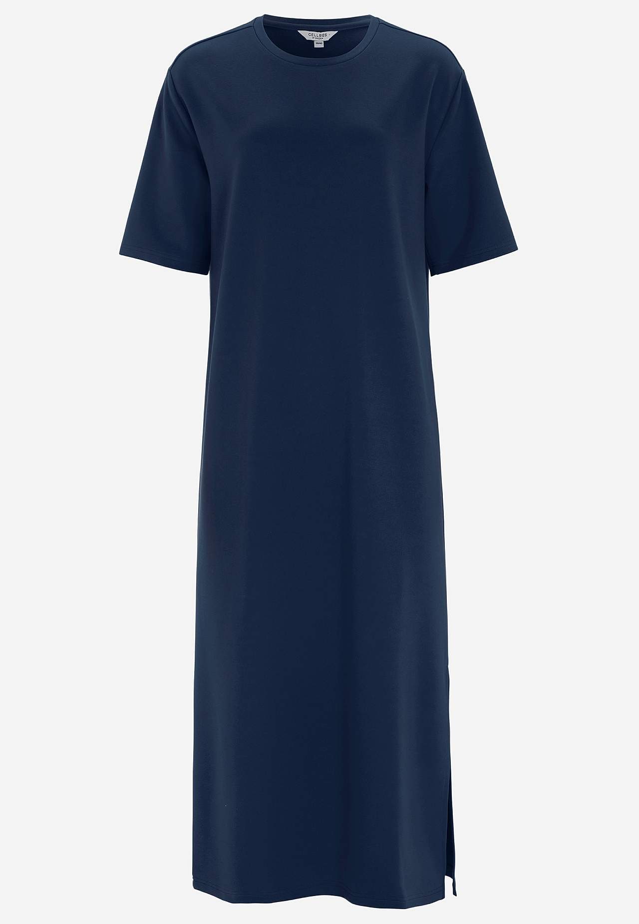Pehmeä mekko raskaasta trikoosta joustolla. Suora, löysä istuvuus. Pyöreä pääntie. Pudotettu olkapää. Lyhyet hihat. Suora helma korkealla halkiolla sivulla. Pituus olalta n. 121 cm kaikissa kooissa.