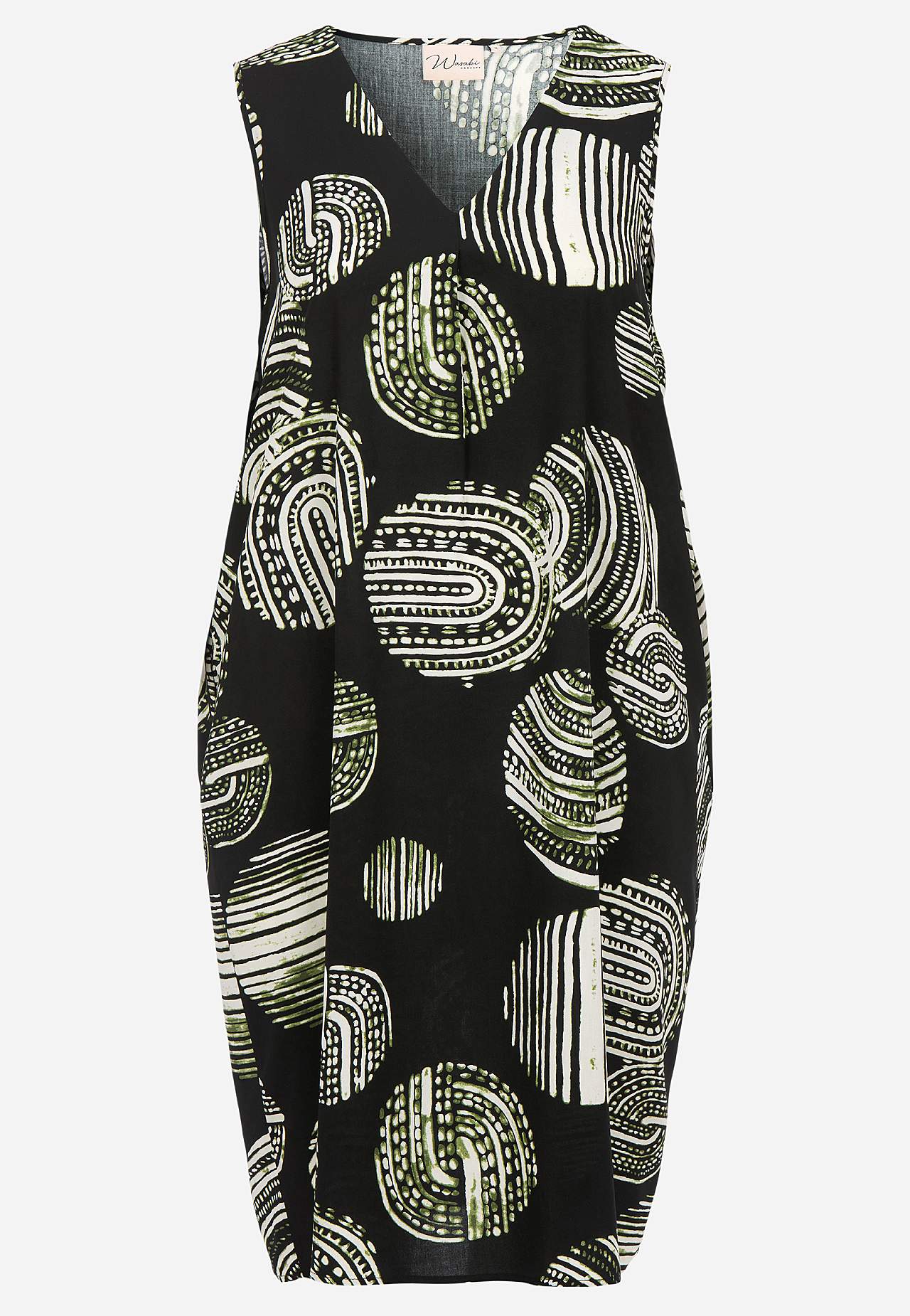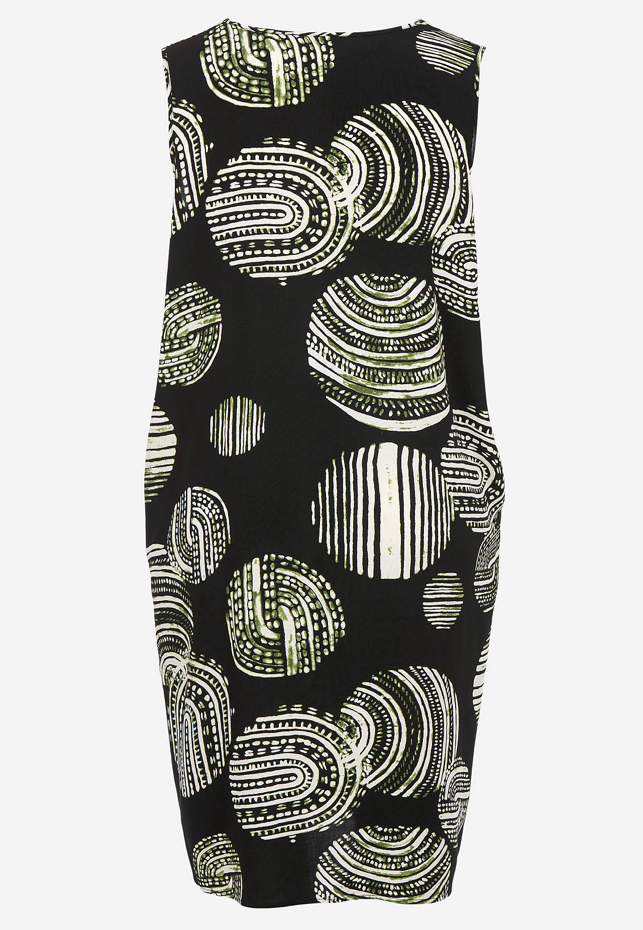 Kudottu, hihaton mekko sileästä, pehmeästä viskoosista. Löysä istuvuus. V-kaula-aukkoinen malli koristeellisella vekillä edessä. Rintamuotolaskos. Hihaton malli mukavalla resorilla kainaloissa. Kätketyt taskut sivuilla. Suora helma. Pituus olkapäästä n. 114 cm koossa M (46/48).