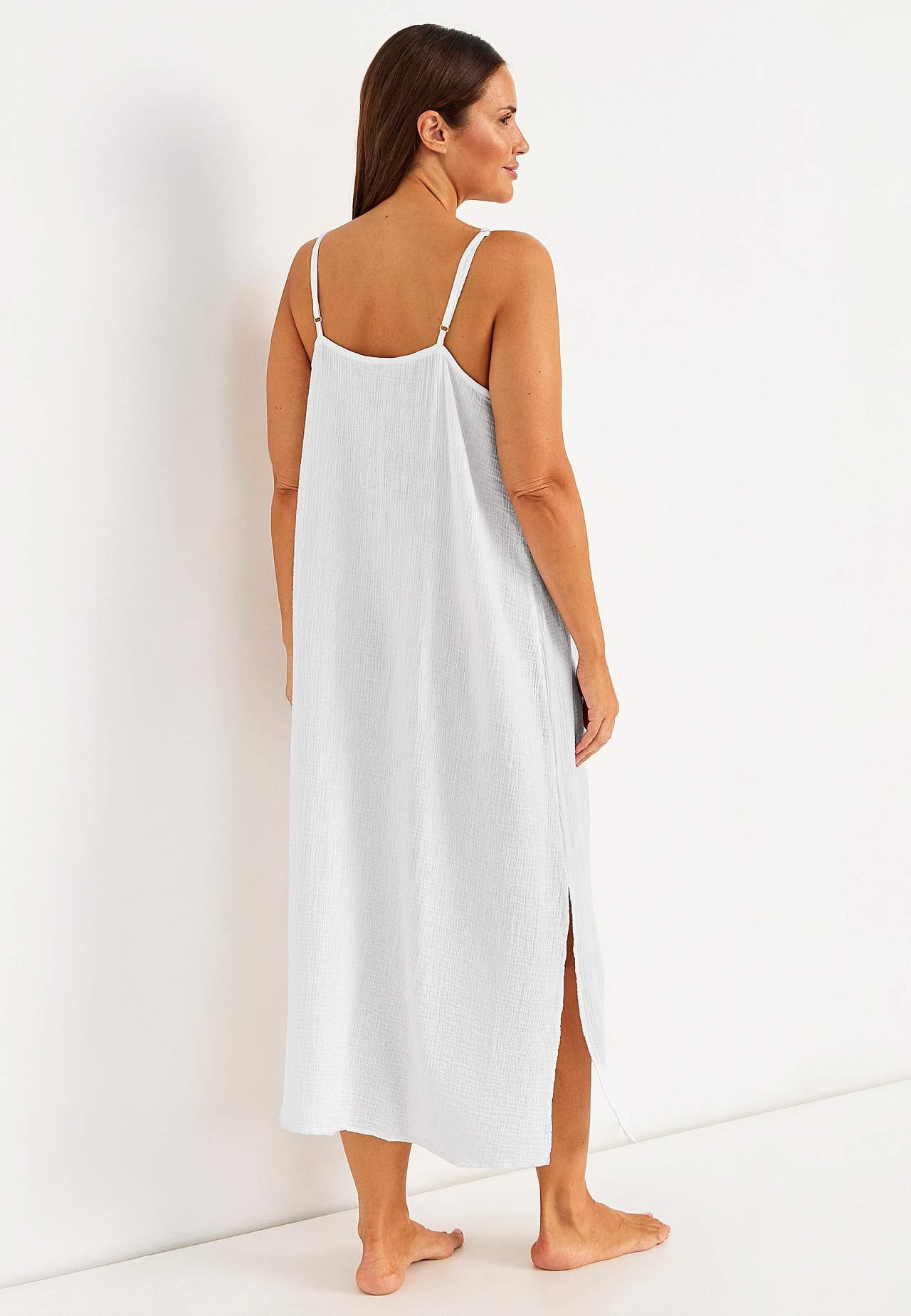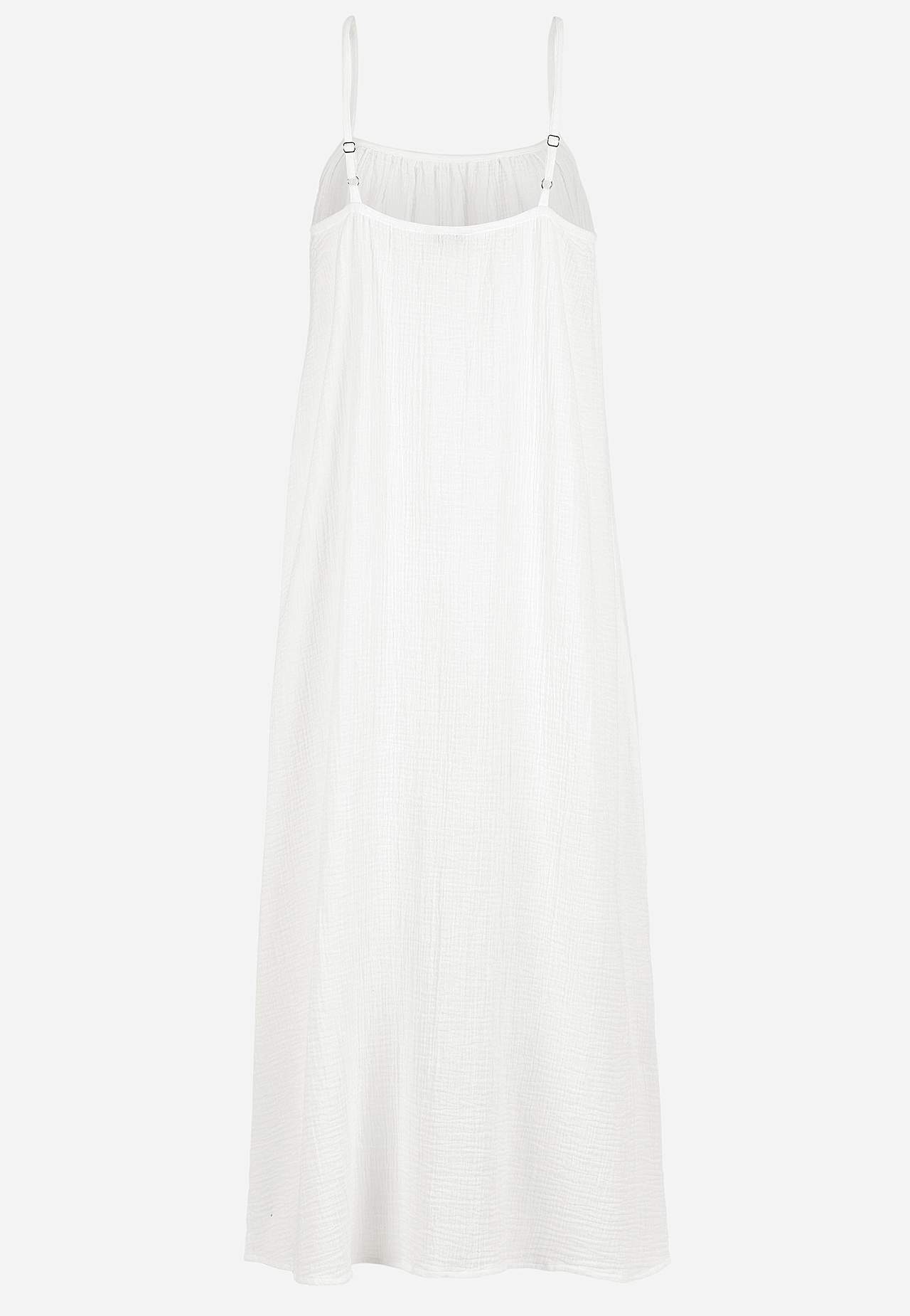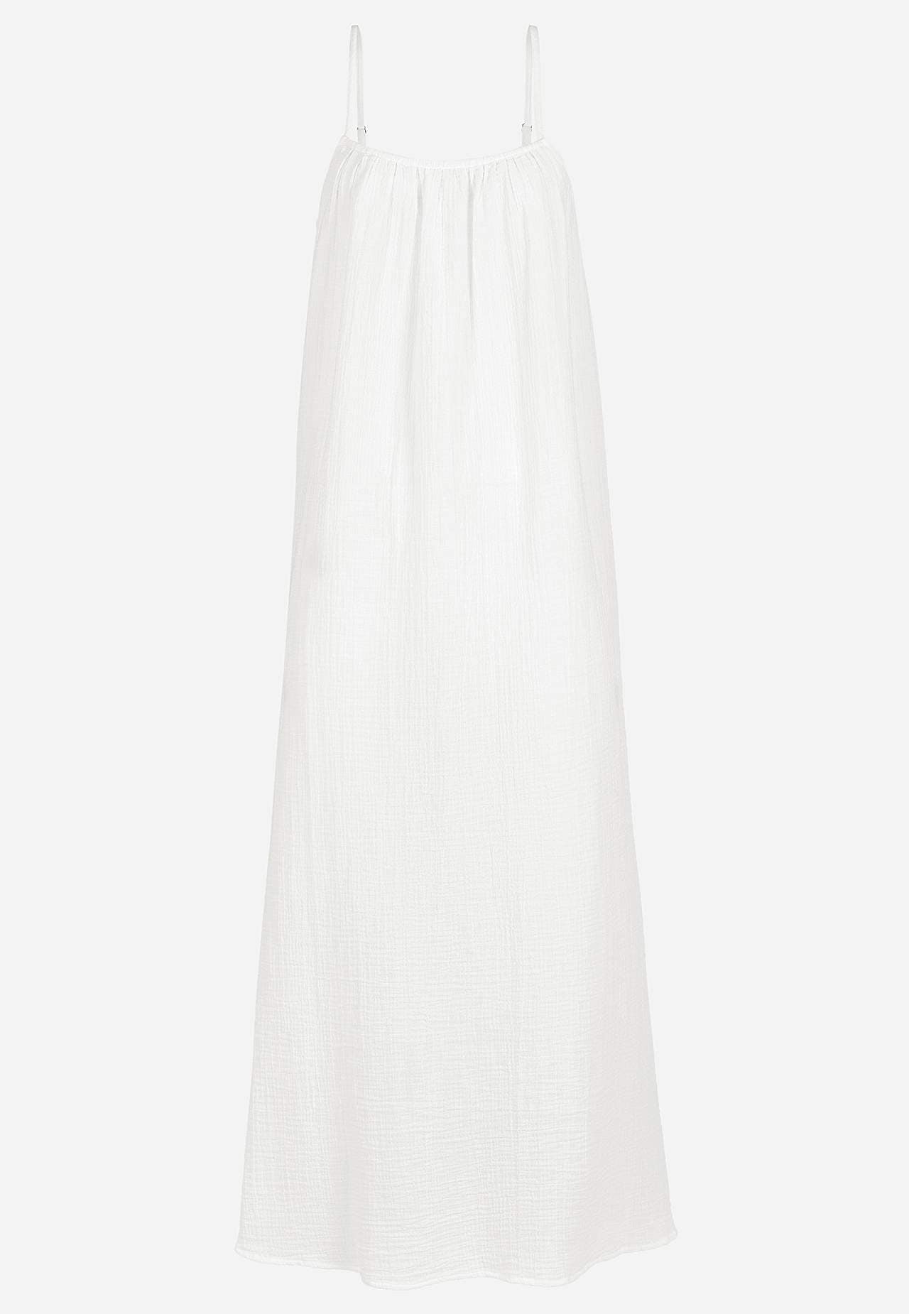 Mekko puuvillamusliinista luonnollisella rakenteella. Kudottu, pehmeä materiaali ilmavalla, viileällä tuntumalla. Tilava, suora istuvuus. Ohuet säädettävät olkaimet. Suora helma korkealla halkiolla sivuilla. Pituus seuraa kokoa n. 114-121 cm keskellä etuosaa.