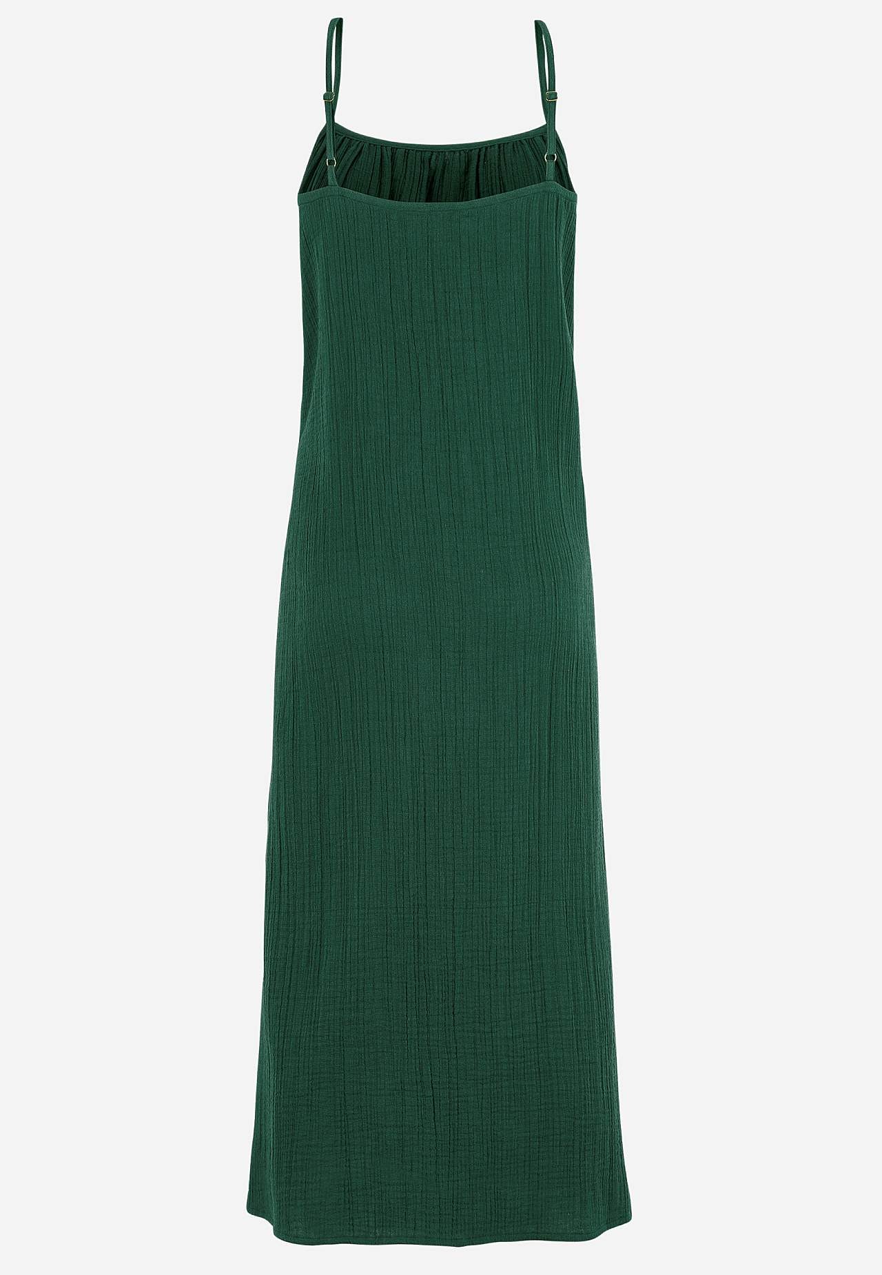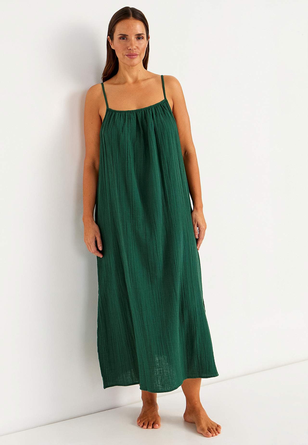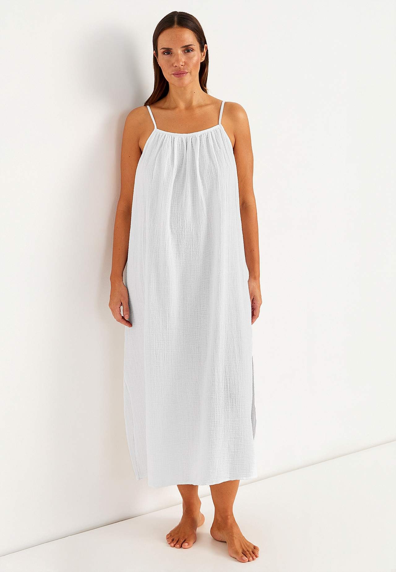 Mekko puuvillamusliinista luonnollisella rakenteella. Kudottu, pehmeä materiaali ilmavalla, viileällä tuntumalla. Tilava, suora istuvuus. Ohuet säädettävät olkaimet. Suora helma korkealla halkiolla sivuilla. Pituus seuraa kokoa n. 114-121 cm keskellä etuosaa.