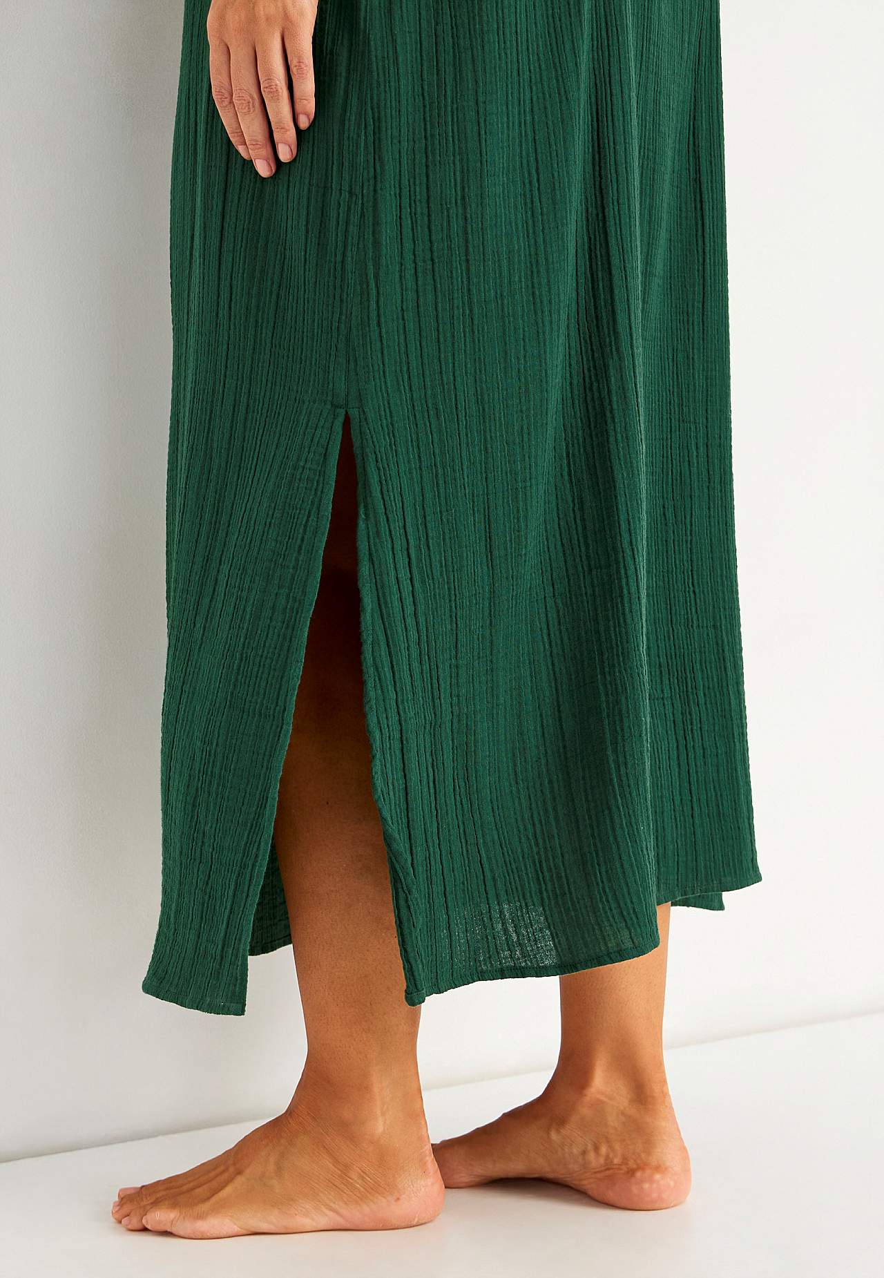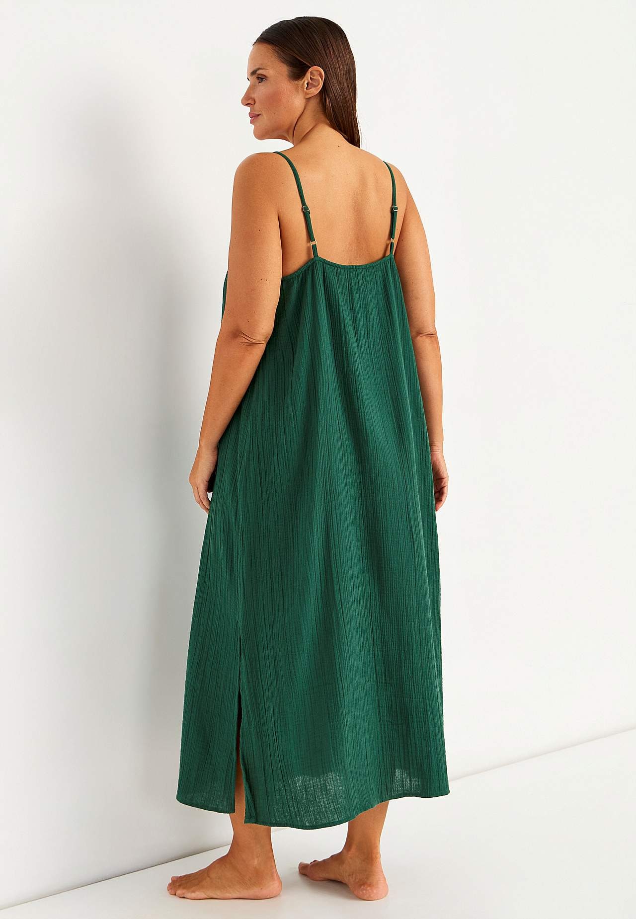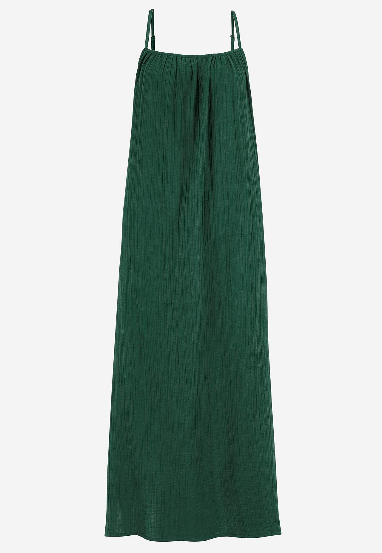 Mekko puuvillamusliinista luonnollisella rakenteella. Kudottu, pehmeä materiaali ilmavalla, viileällä tuntumalla. Tilava, suora istuvuus. Ohuet säädettävät olkaimet. Suora helma korkealla halkiolla sivuilla. Pituus seuraa kokoa n. 114-121 cm keskellä etuosaa.