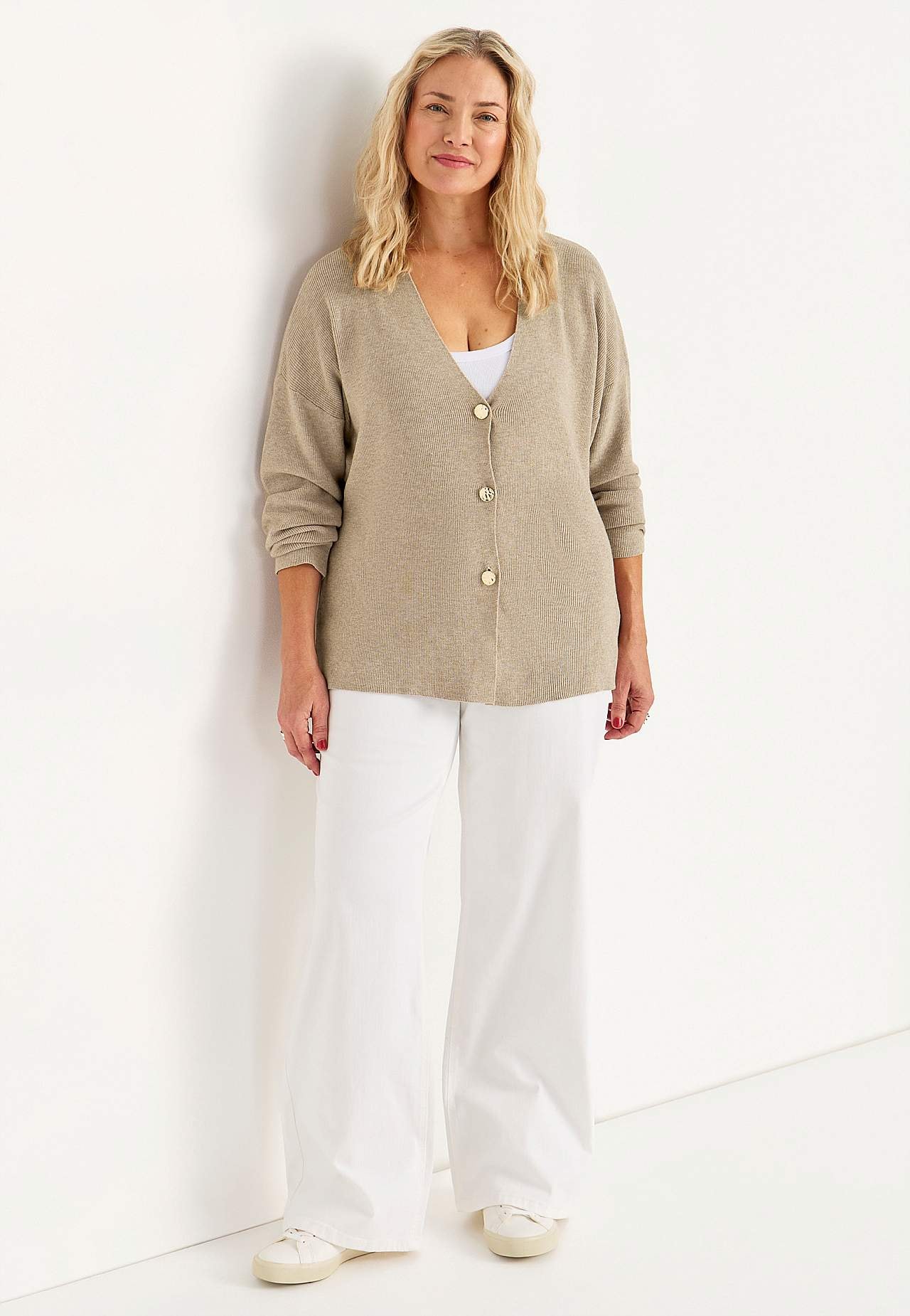 Pehmeä, joustava neuletakki napeilla. Vartaloa hieman myötäilevä istuvuus. Pääntie hieman syvemmällä v-pääntiellä. Koristeelliset napit. Hieman matalaolkainen olkapää. Pitkät, suorat hihat. Kaunis käytettäväksi topin tai hihattoman paidan yllä. Pituus olkapäältä koon mukaan noin 65-73 cm.