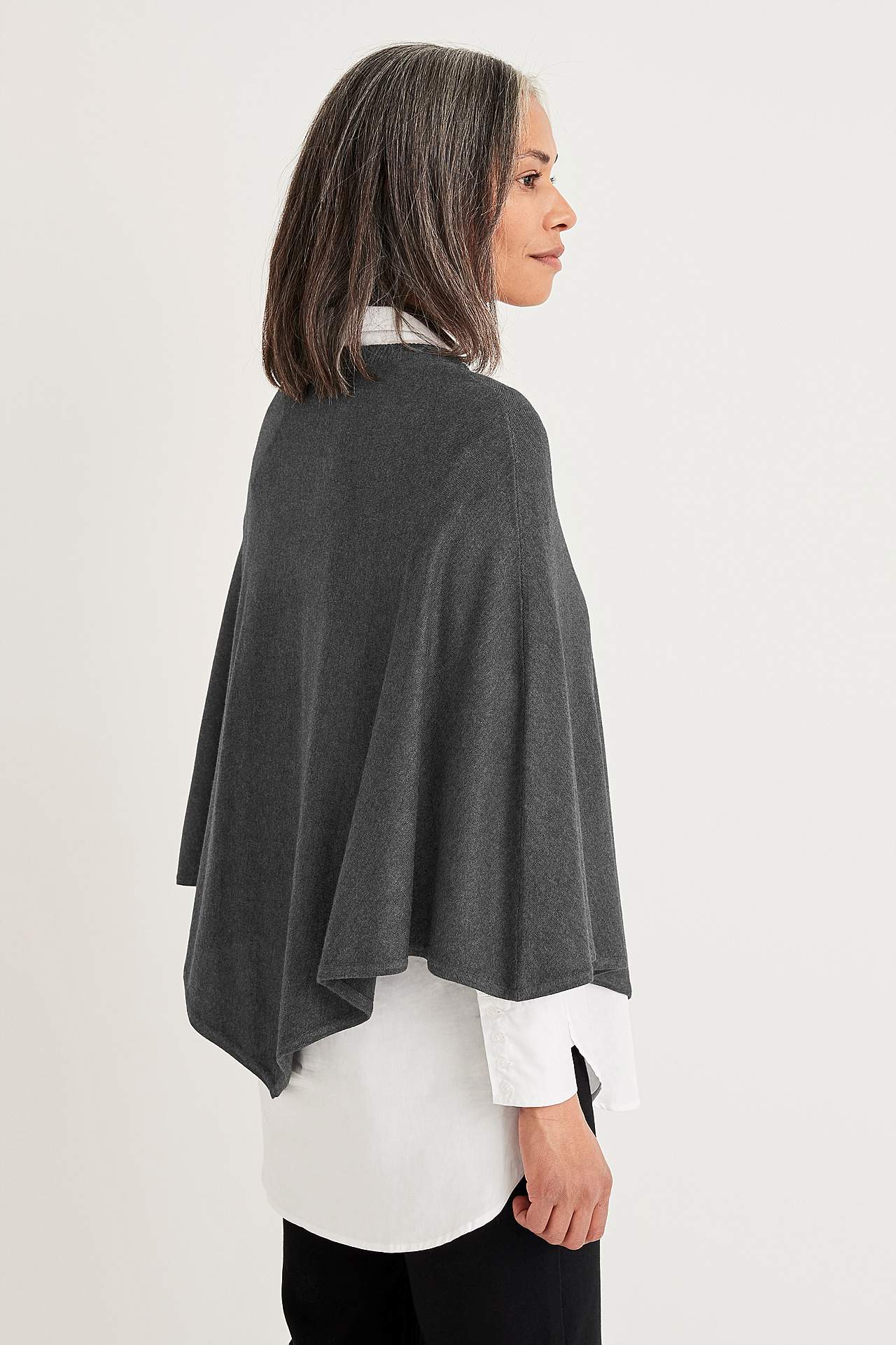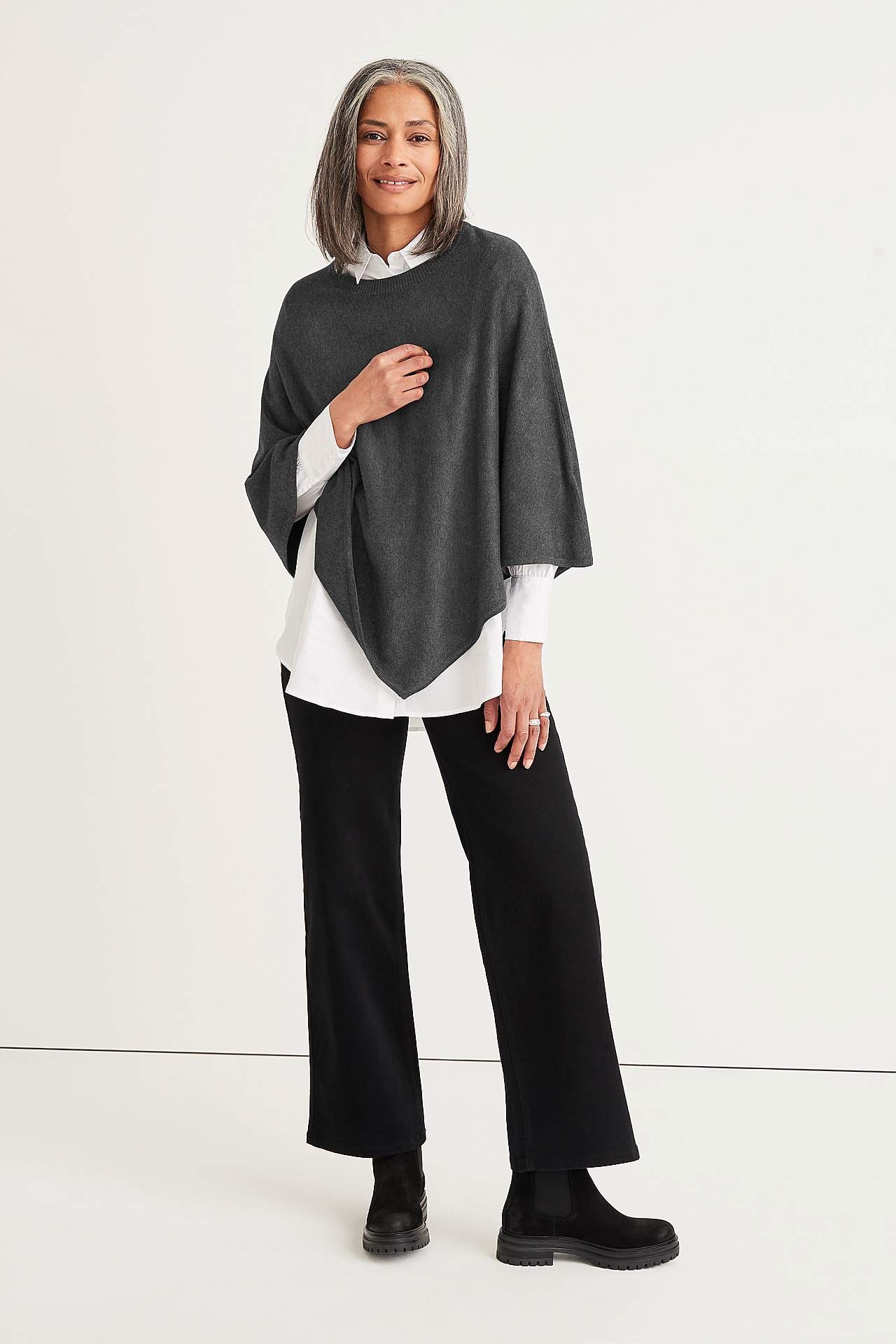 Tiheäsilmukkainen poncho pyöristetyllä, ribatulla pääntiellä. Takapituus keskeltä n. 72 cm koossa 36/44.