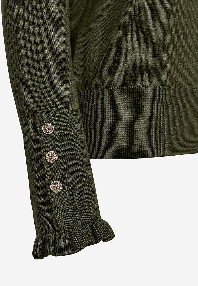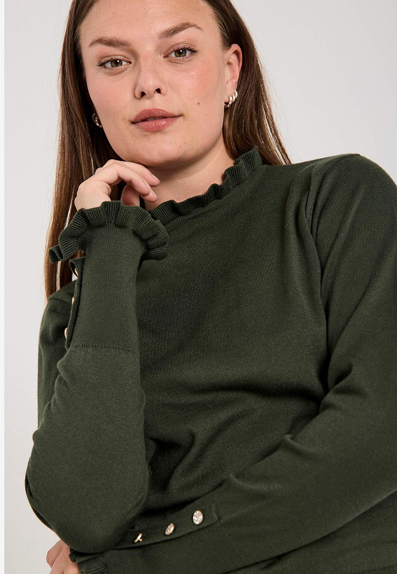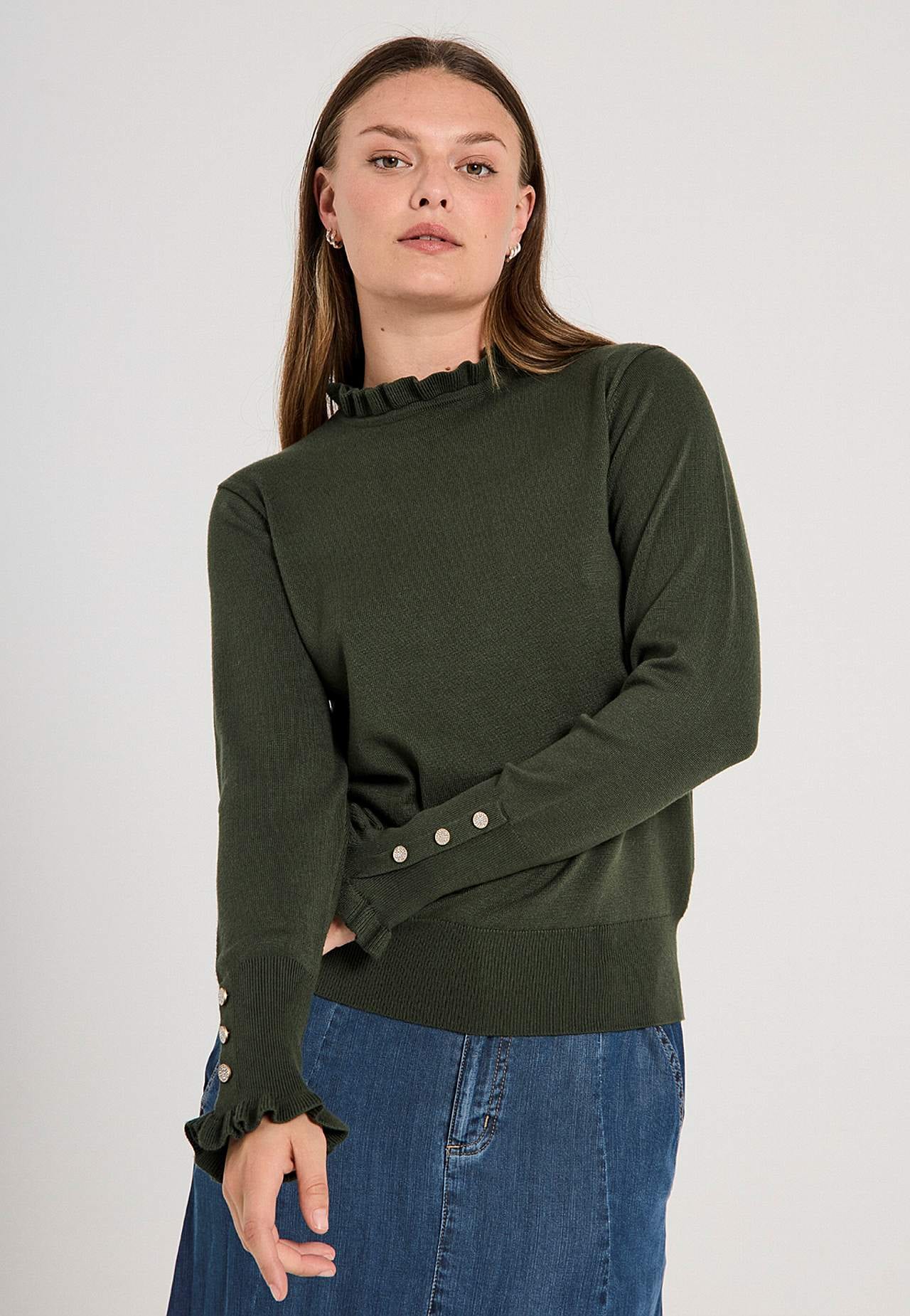Pitkähihainen pusero tyylikkäällä siluetilla. Hyvin leveät kalvosimet koristeellisilla napeilla hienostunutta silausta varten. Sopii yhtä hyvin päivittäiseen käyttöön ja juhlatilaisuuksiin. Pehmeä tiheäsilmukkainen villaneulepusero kevyellä hohdolla. Kapea istuvuus. Pyöreä pääntie aaltoilevalla reunalla. Pitkä hiha kolmella... Lue lisää