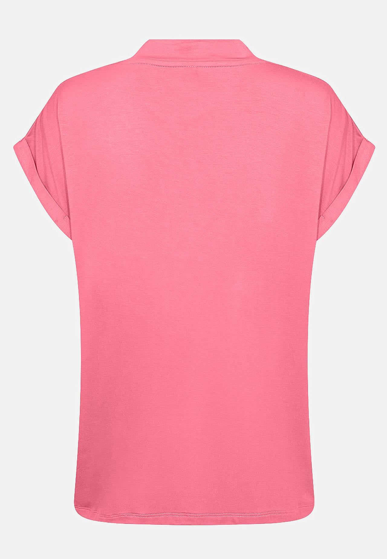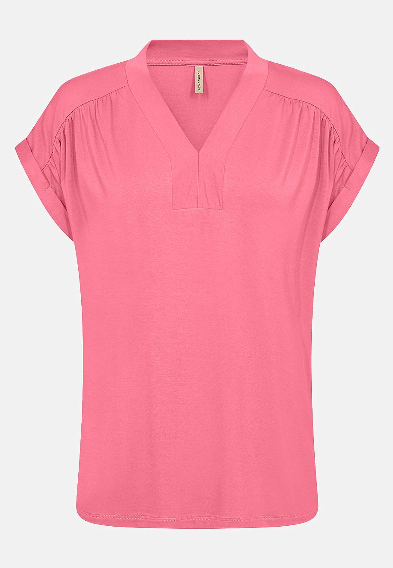 Yksivärinen, hyvin pehmeä trikootoppi lyocellista. Normaali istuvuus. V-kaula-aukkoinen pääntie. Laskos olkapäissä. Taitetut holkkihihat. Suora helma. Pituus olkapäästä n. 62 cm koossa S(38).