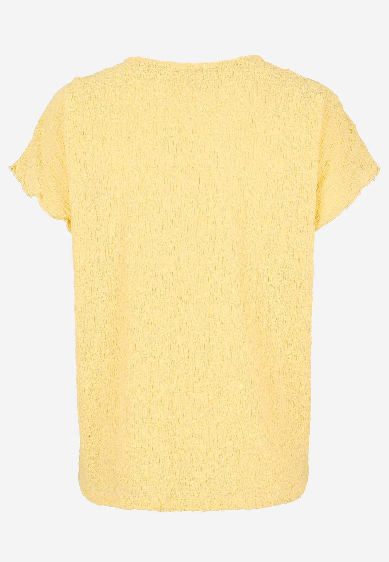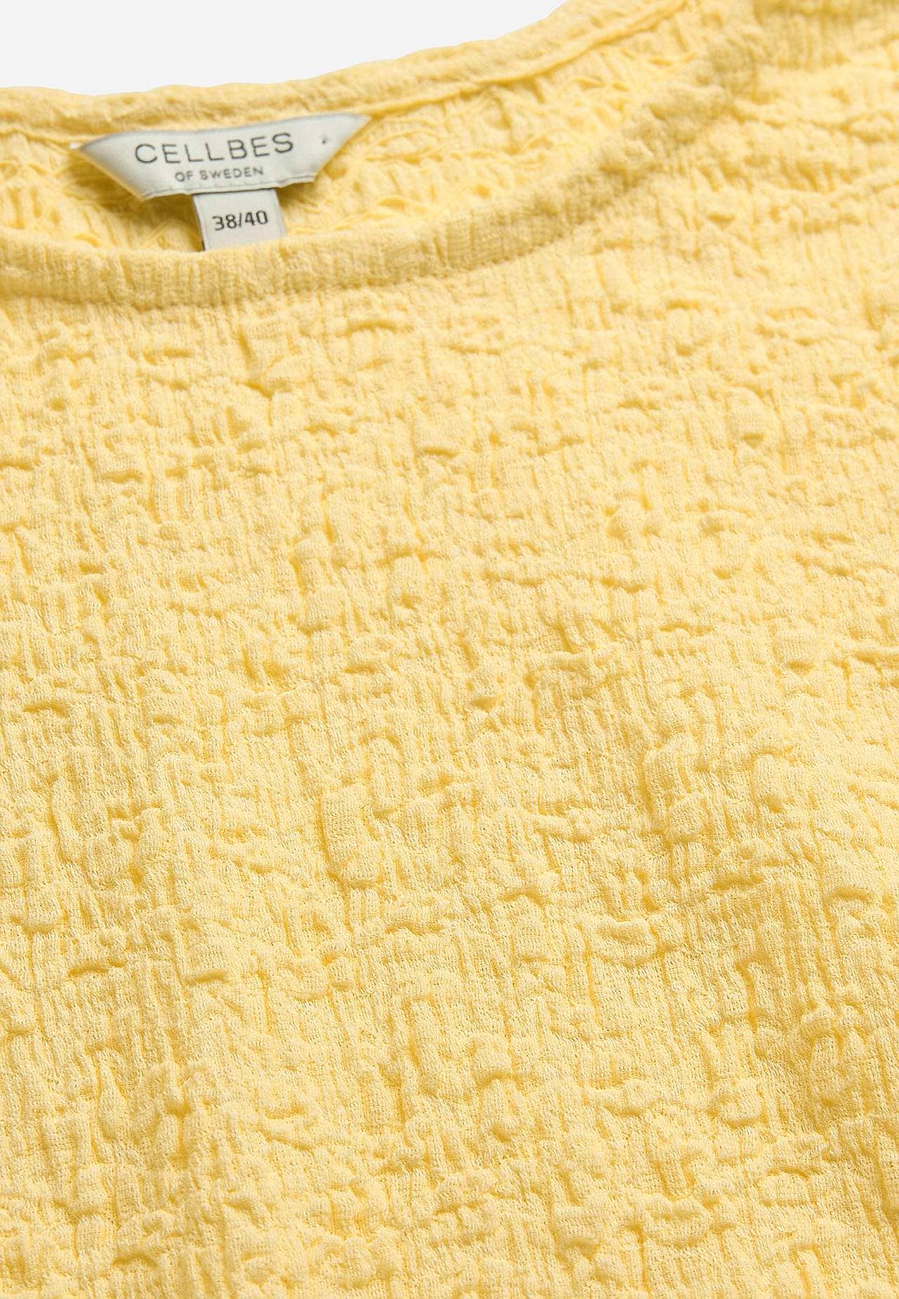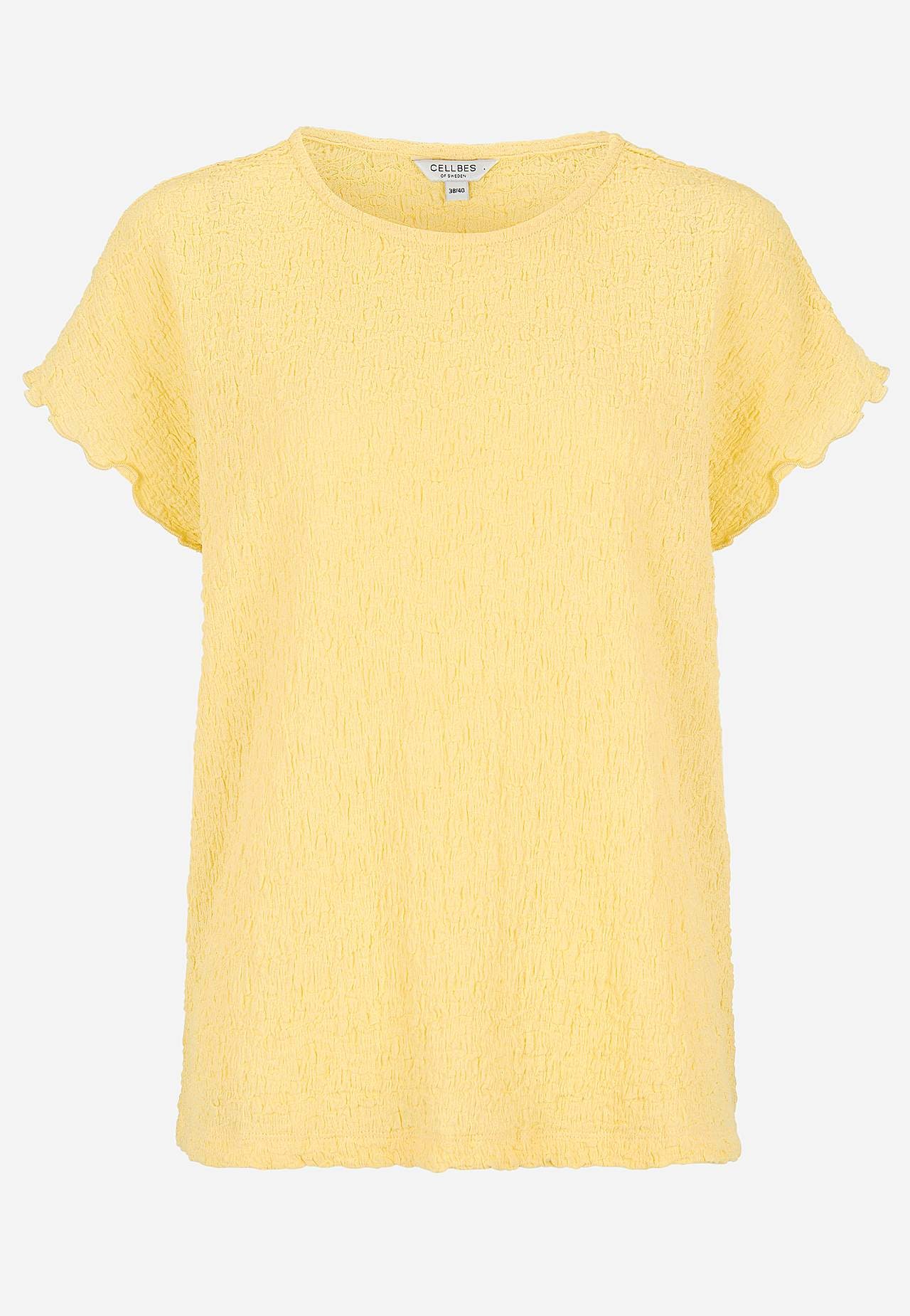 Toppi mukavasta, joustavasta puuvillasekoituksesta sommitelmalla. Normaali istuvuus. Pyöreä pääntie. Lyhyet holkkihihat aaltoilevilla, saumurilla huolitelluilla hihansuilla. Suora helma. Takapituus koon mukaan n. 62-73 cm.