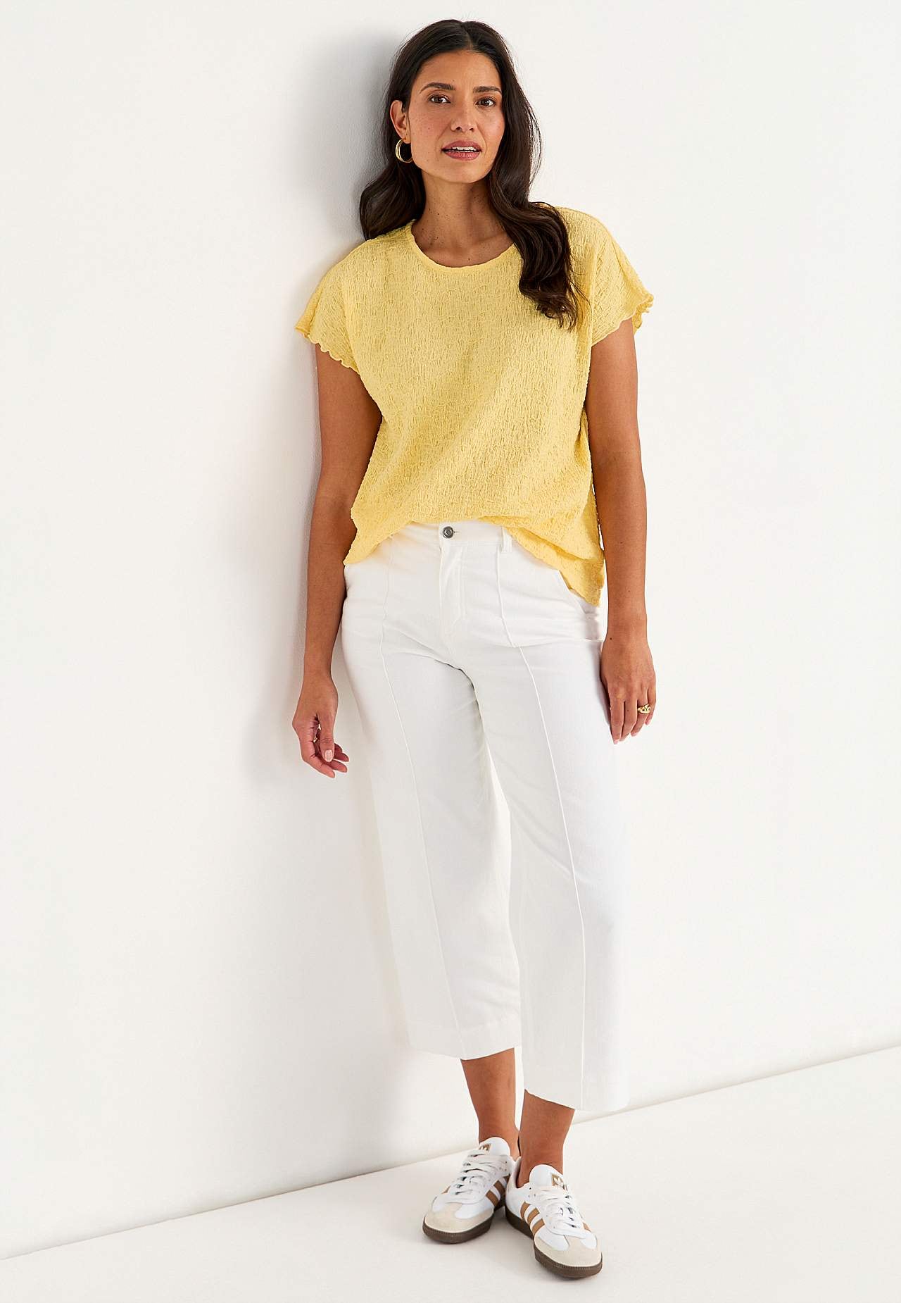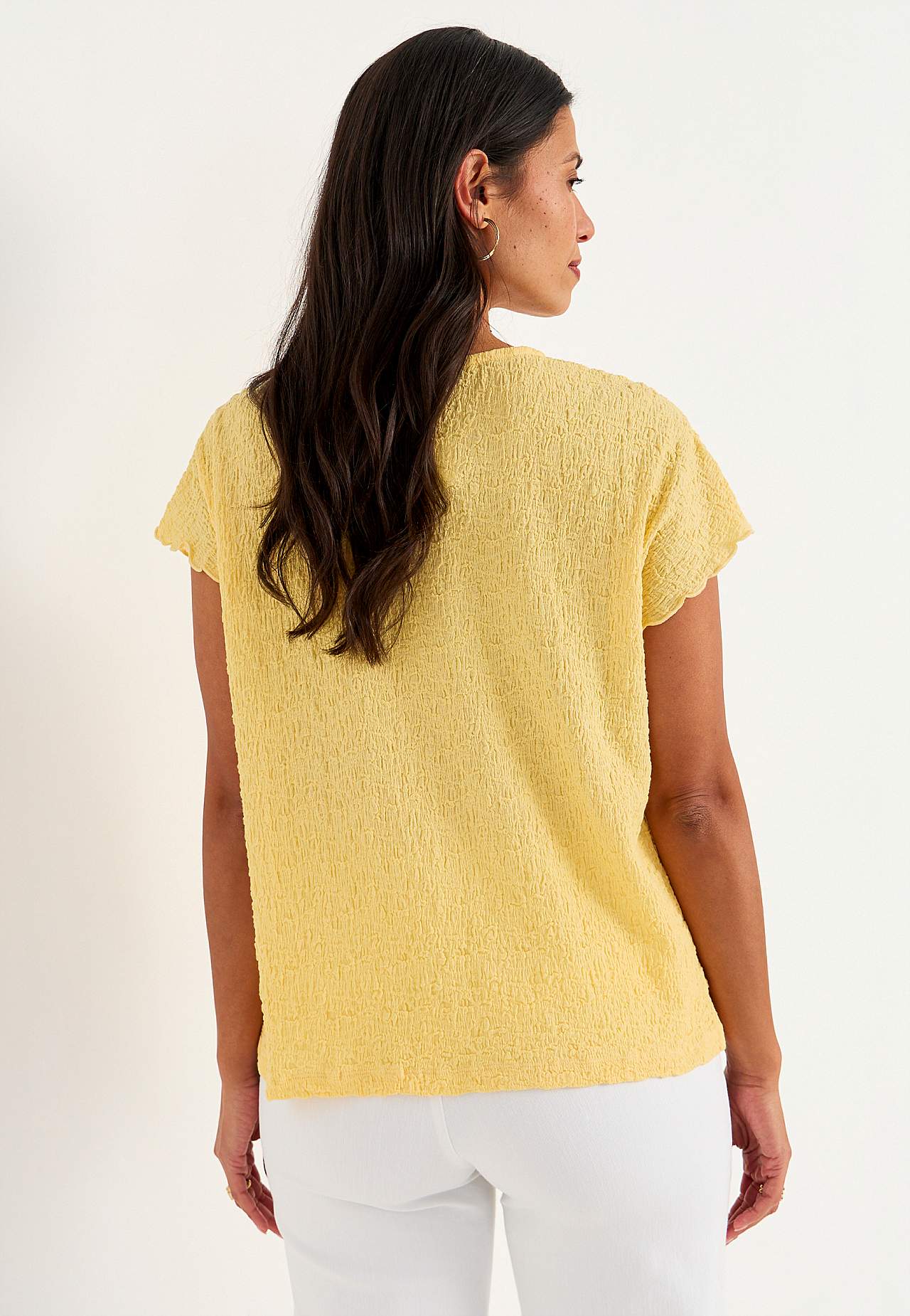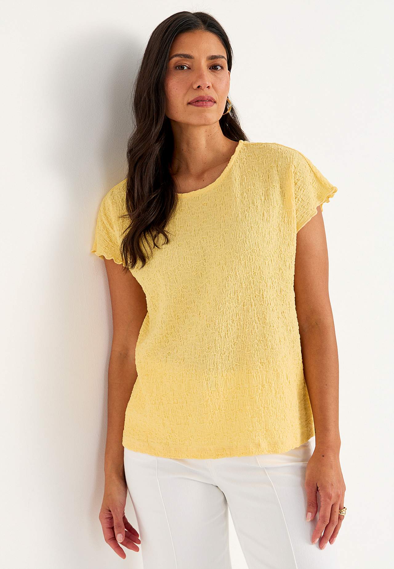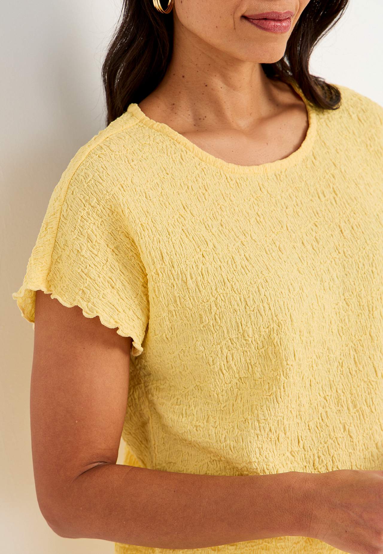 Toppi mukavasta, joustavasta puuvillasekoituksesta sommitelmalla. Normaali istuvuus. Pyöreä pääntie. Lyhyet holkkihihat aaltoilevilla, saumurilla huolitelluilla hihansuilla. Suora helma. Takapituus koon mukaan n. 62-73 cm.