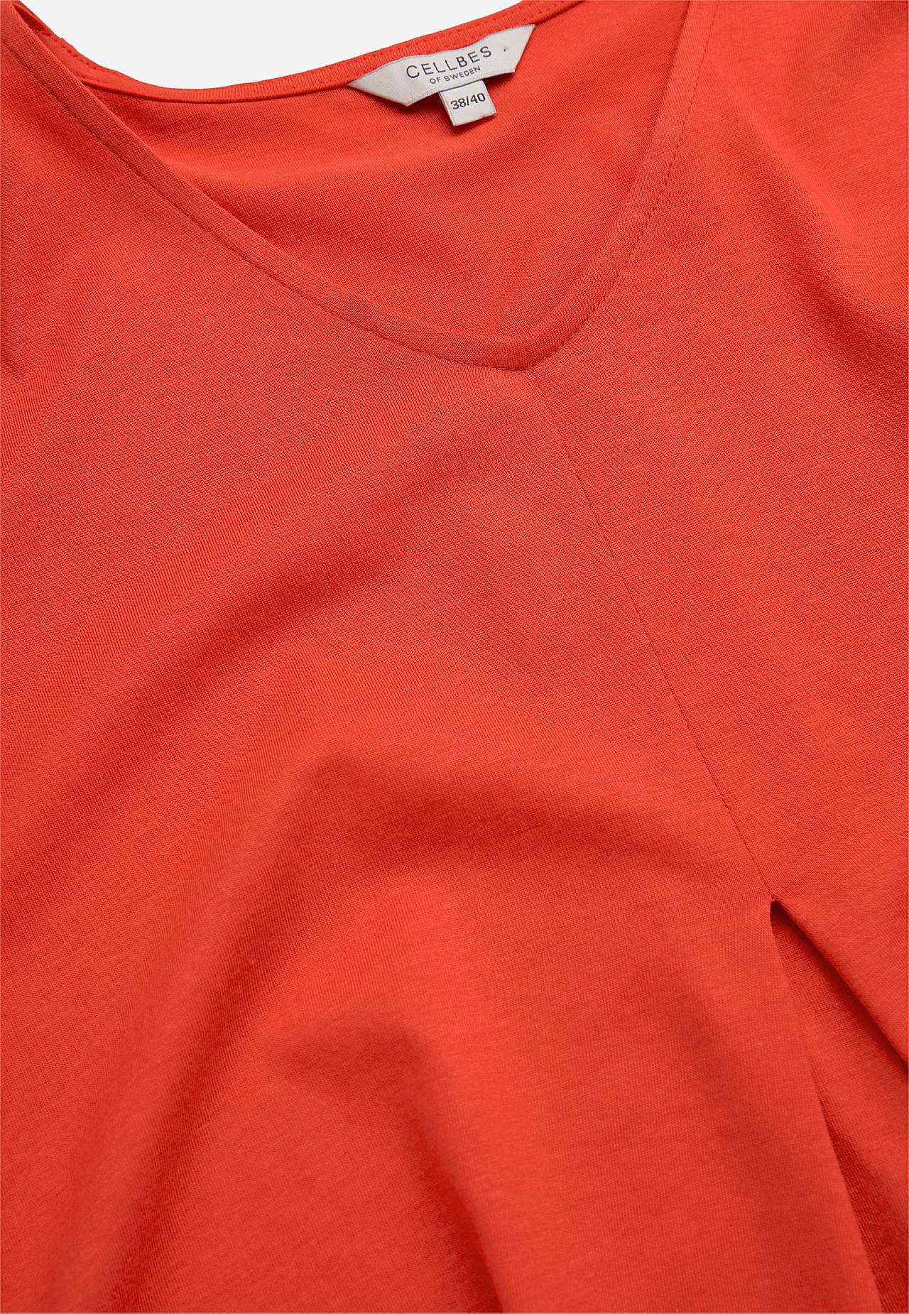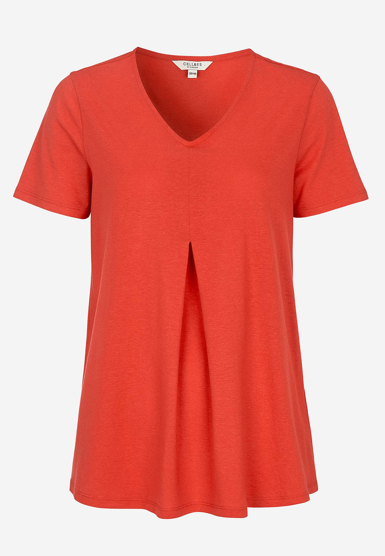Trikootoppi ihanan pehmeästä puuvilla-modaalisekoitteesta. A-linjainen väljä malli pyöristetyllä helmalla. V-kaula-aukkoinen. Imarteleva vastalaskos rinnan yli. Lyhyet hihat. Pituus olkapäältä koon mukaan noin 69-84 cm.