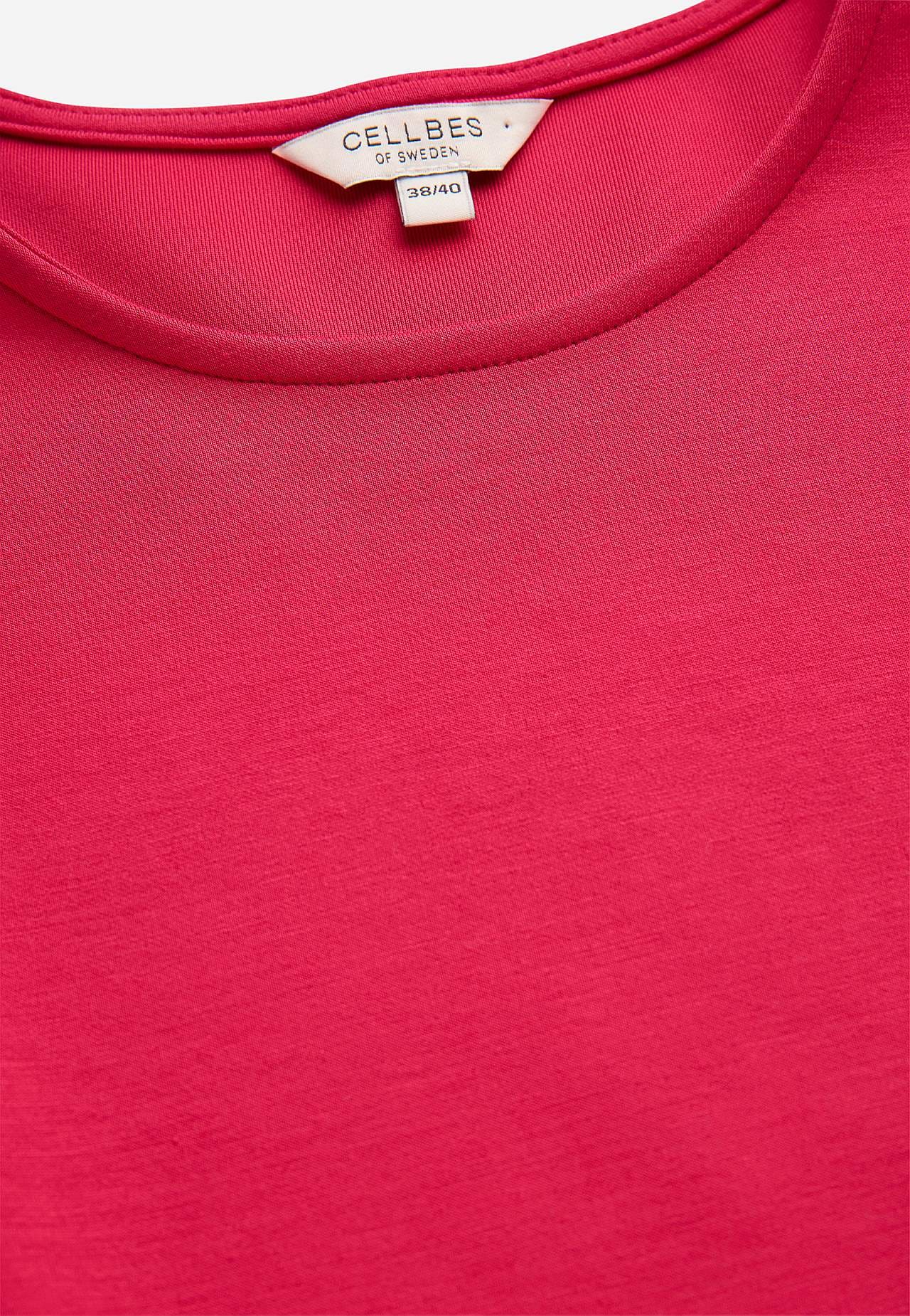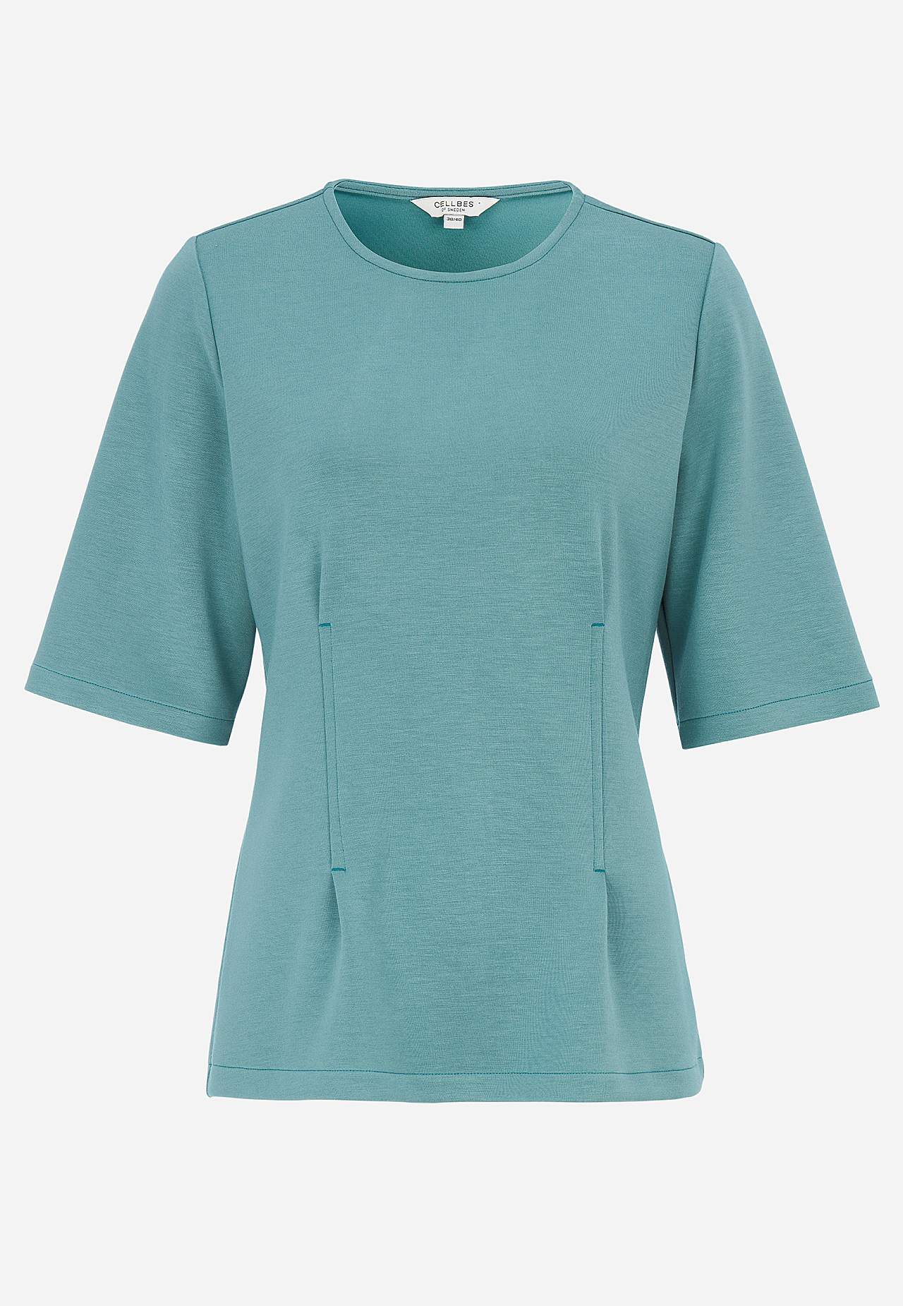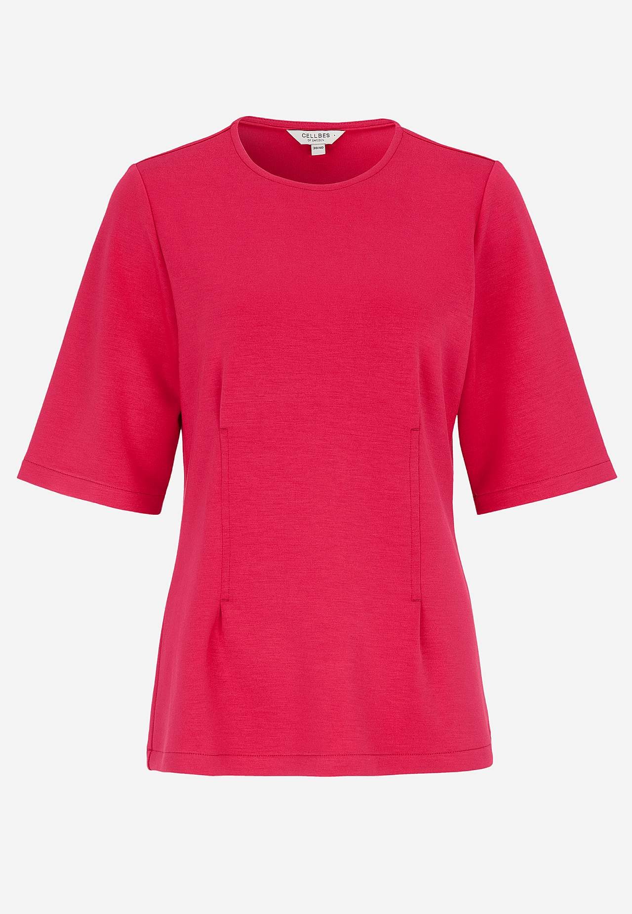 Silkinpehmeä toppi hieman raskaammasta modaalisekoitteesta. Normaali istuvuus imartelevalla laskoksella sekä edessä ja takana. Pyöristetty kaula-aukko. Leveät, puolipitkät hihat. Suora helma. Pituus olkapäältä koon mukaan noin 62-77 cm.