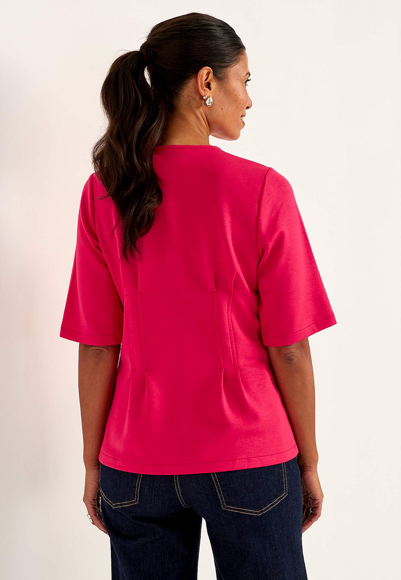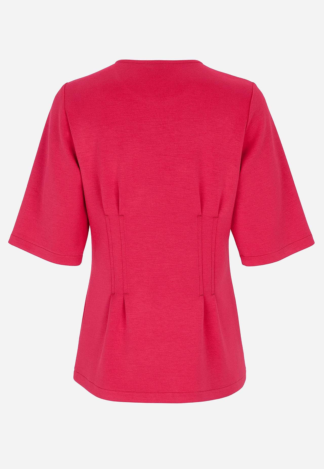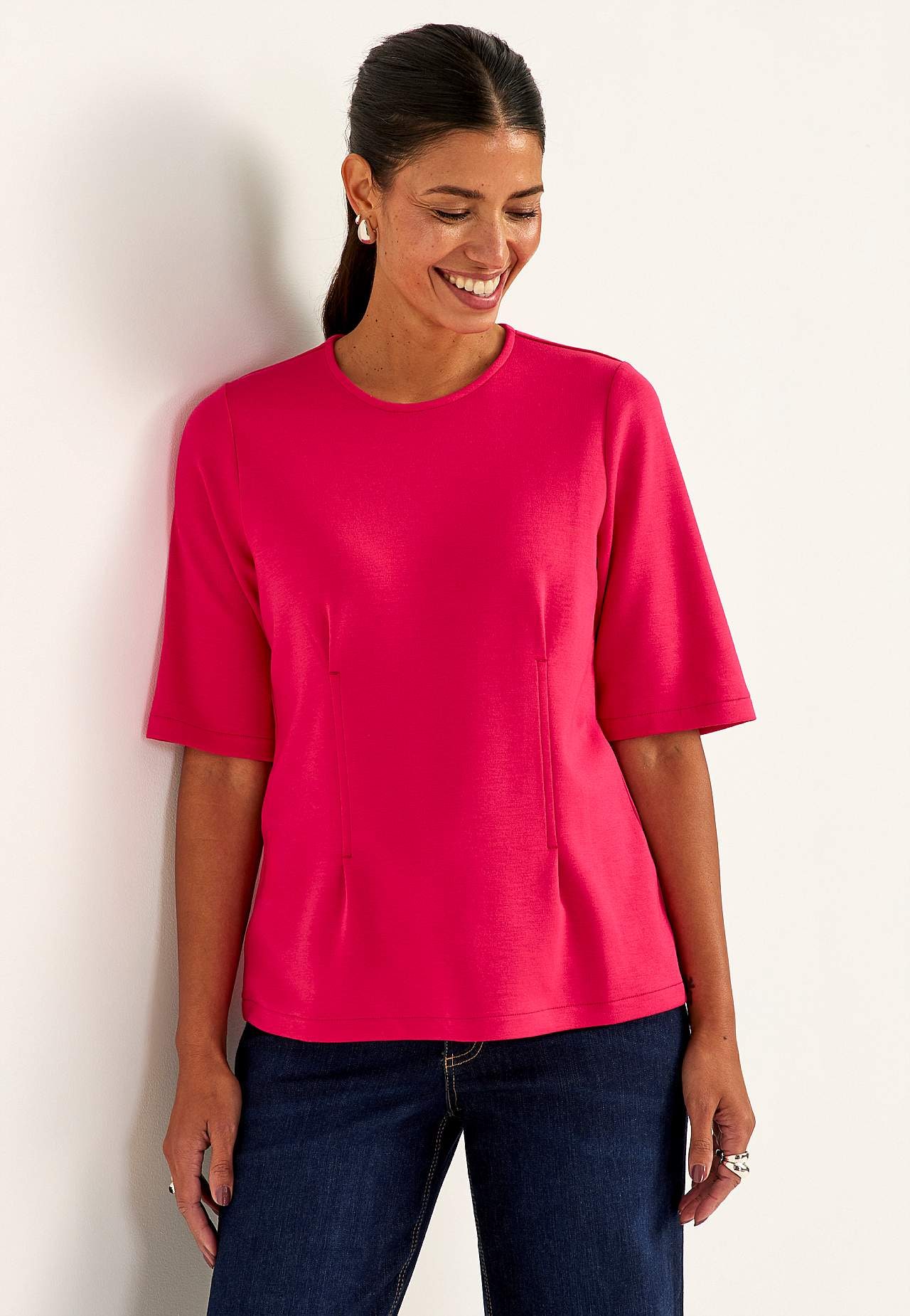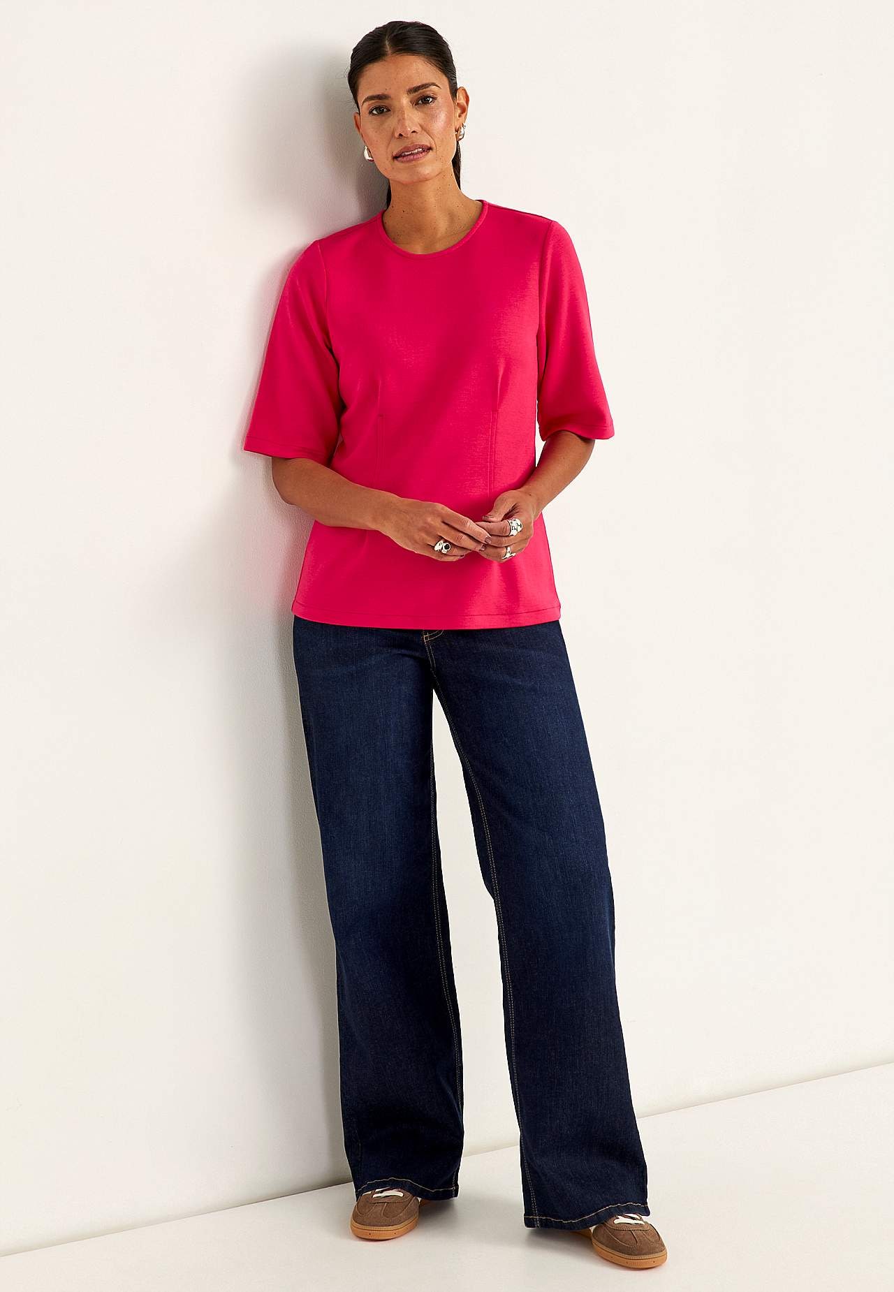 Silkinpehmeä toppi hieman raskaammasta modaalisekoitteesta. Normaali istuvuus imartelevalla laskoksella sekä edessä ja takana. Pyöristetty kaula-aukko. Leveät, puolipitkät hihat. Suora helma. Pituus olkapäältä koon mukaan noin 62-77 cm.