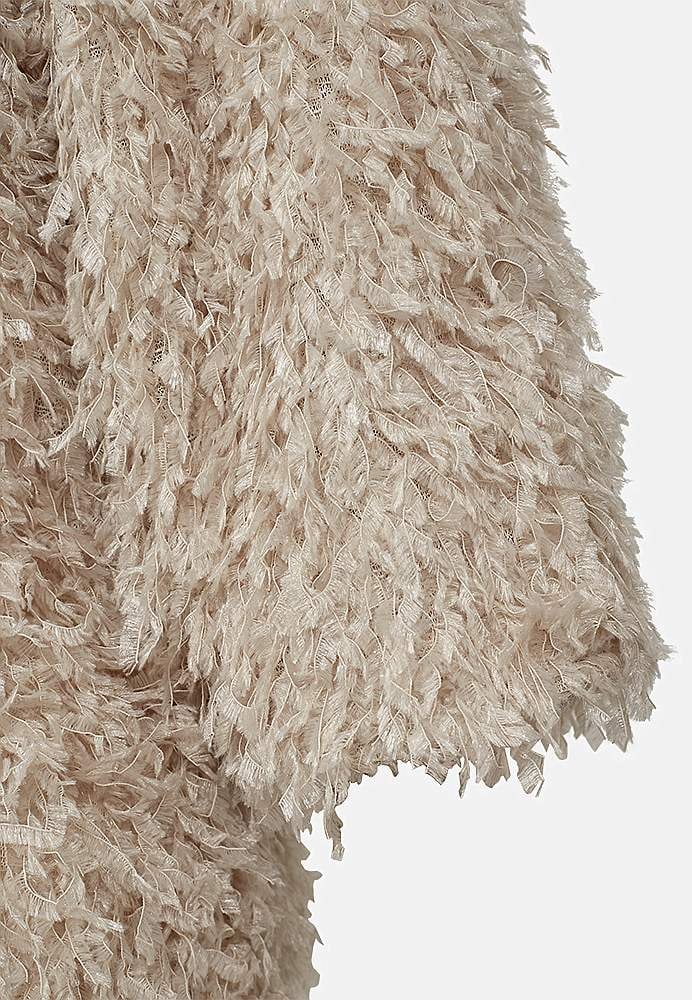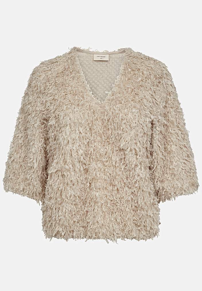 Ylellinen, joustava juhlatoppi. Hyvin pehmeä, pörröinen materiaali höyhenenkaltaisella tekstuurilla. Rento istuvuus. V-kaula-aukko. Leveät 3/4-hihat. Suora helma. Täydellinen joka juhlatilaisuuteen. PItuus noin 59 cm koossa S (38).