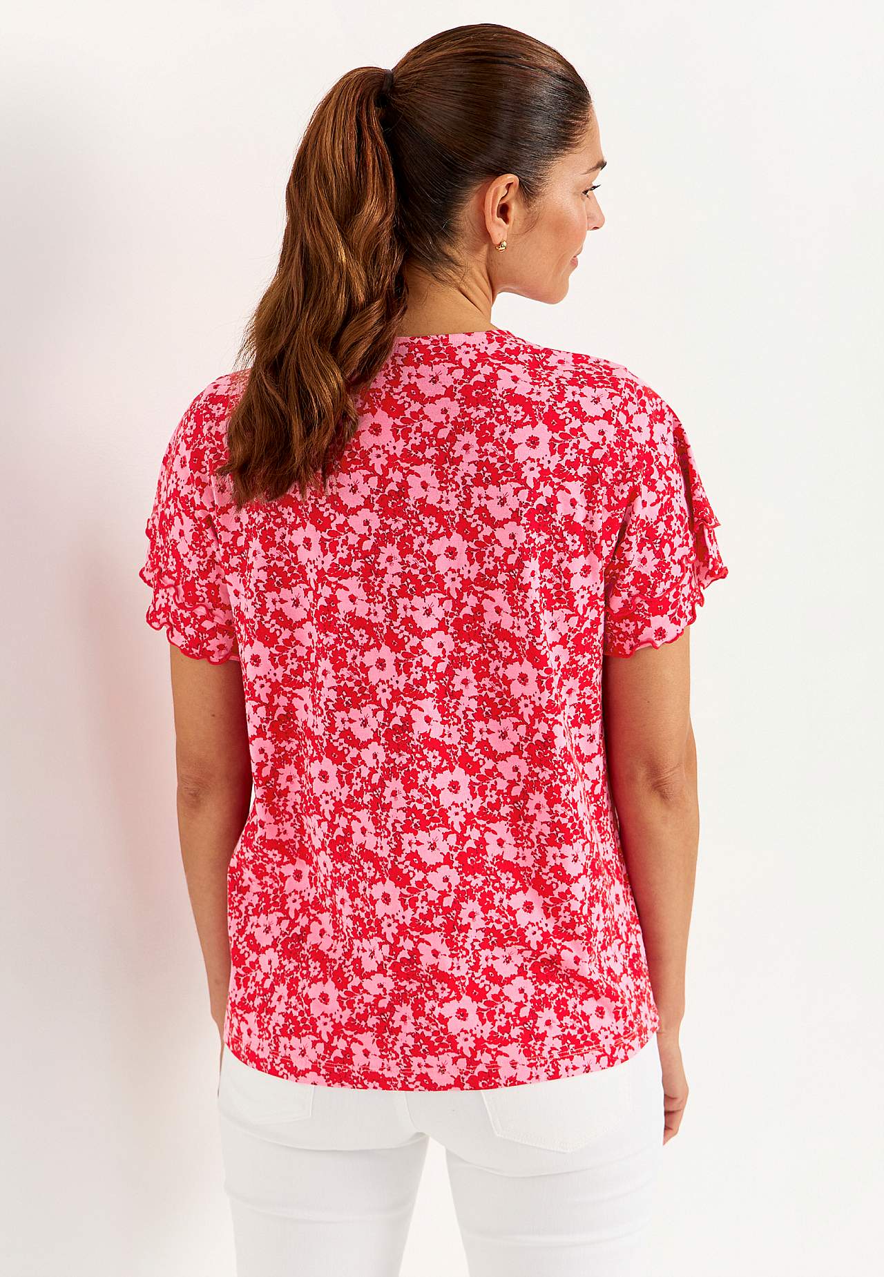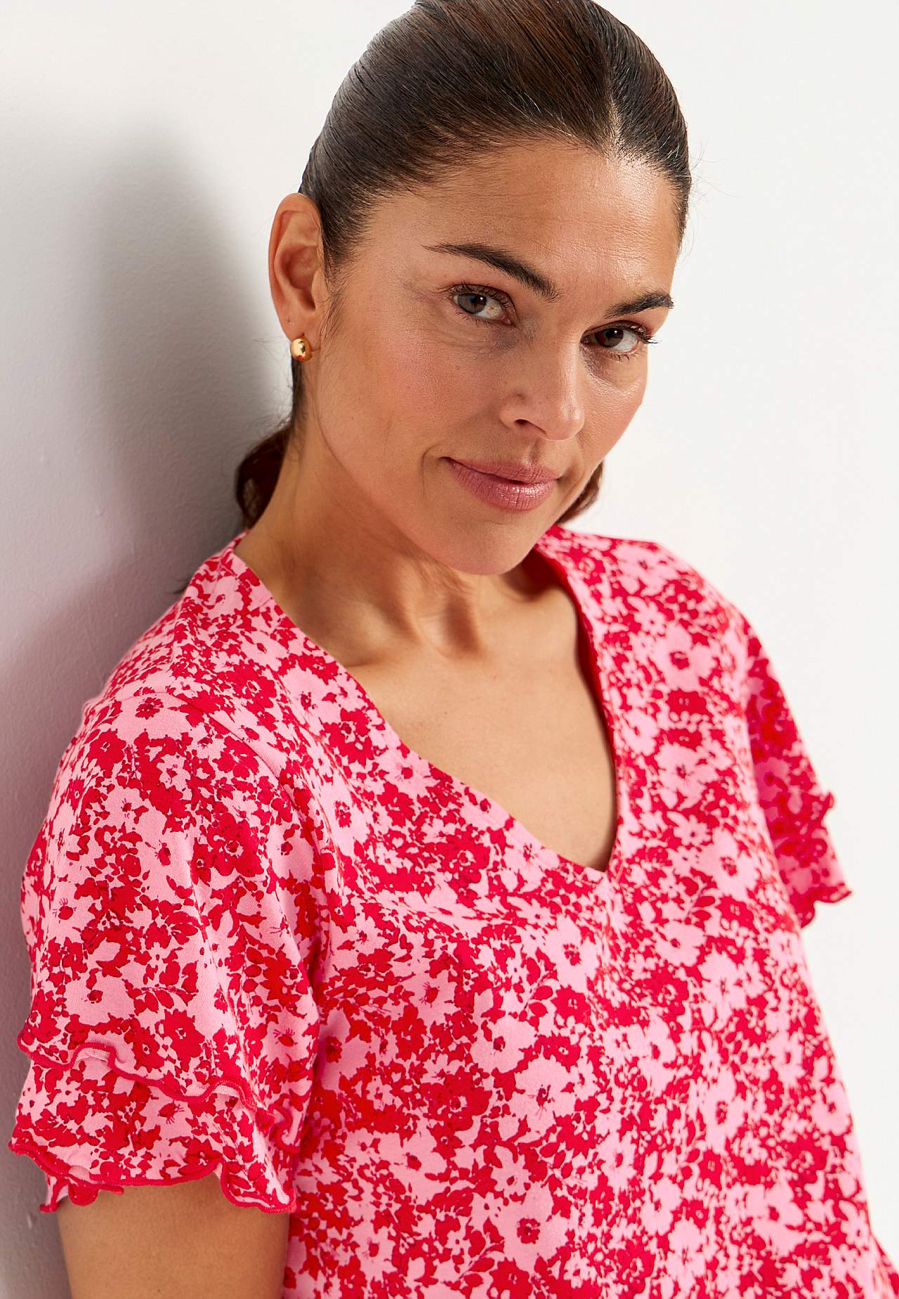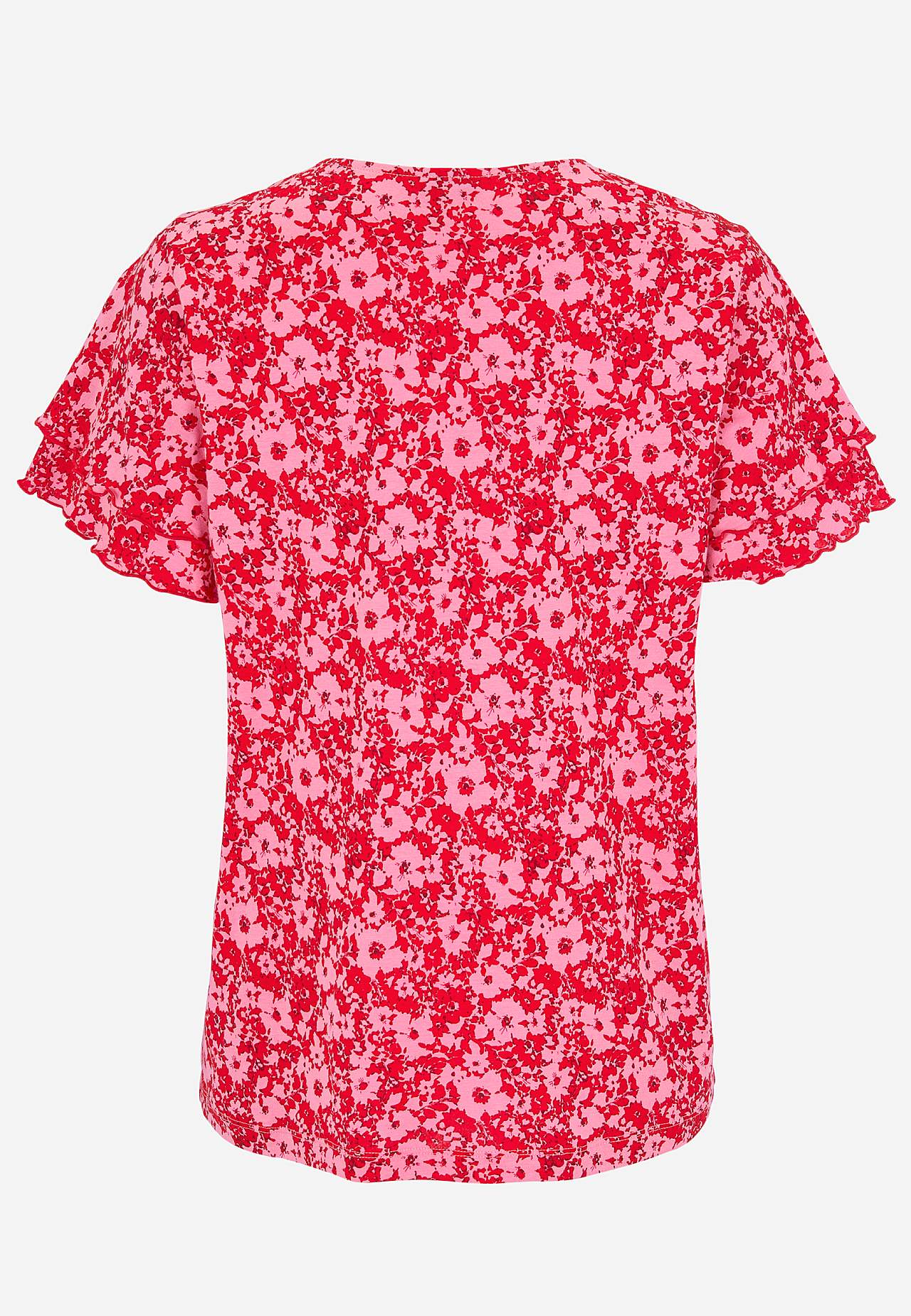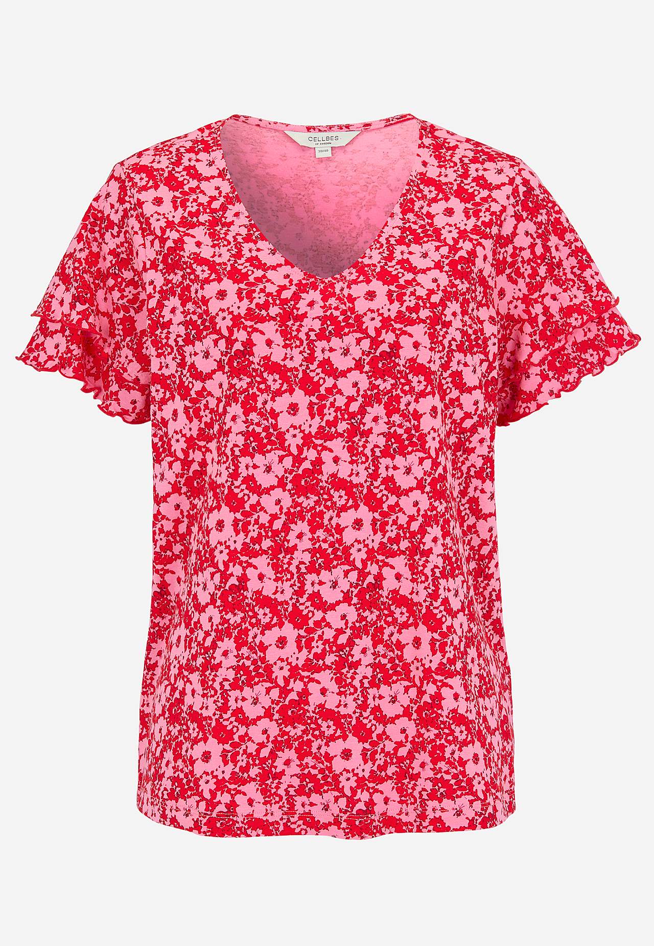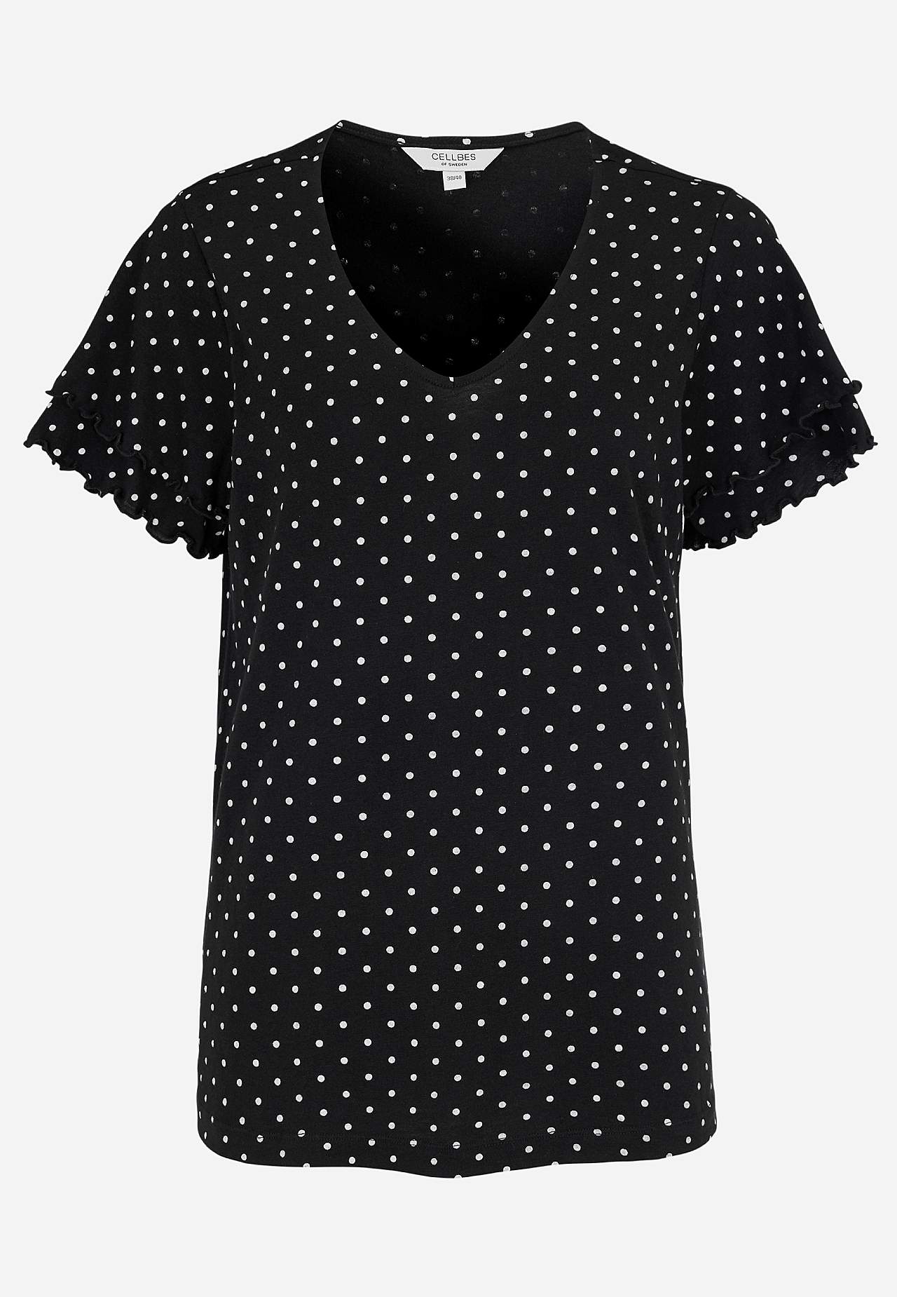 Toppi naisellisilla perhoshihoilla. Pehmeä trikoo puuvillaviskoosisekoitteesta. Hieman A-linjainen istuvuus. V-kaula-aukkoinen kaula-aukko. Lyhyet perhoshihat kaksinkertaisella kerroksella ja saumurilla huolitelluilla, koristeellisilla ompeluilla. Lievästi pyöristetty helma. Takapituus koon mukaan n. 65-73 cm.
