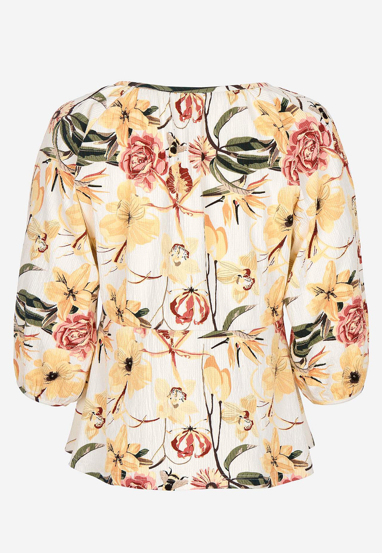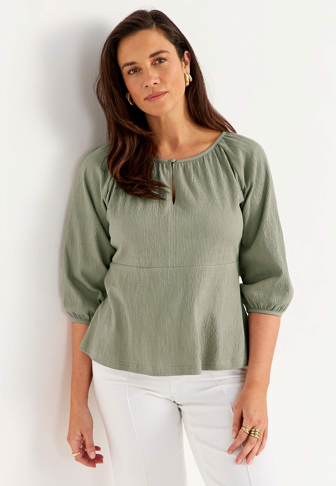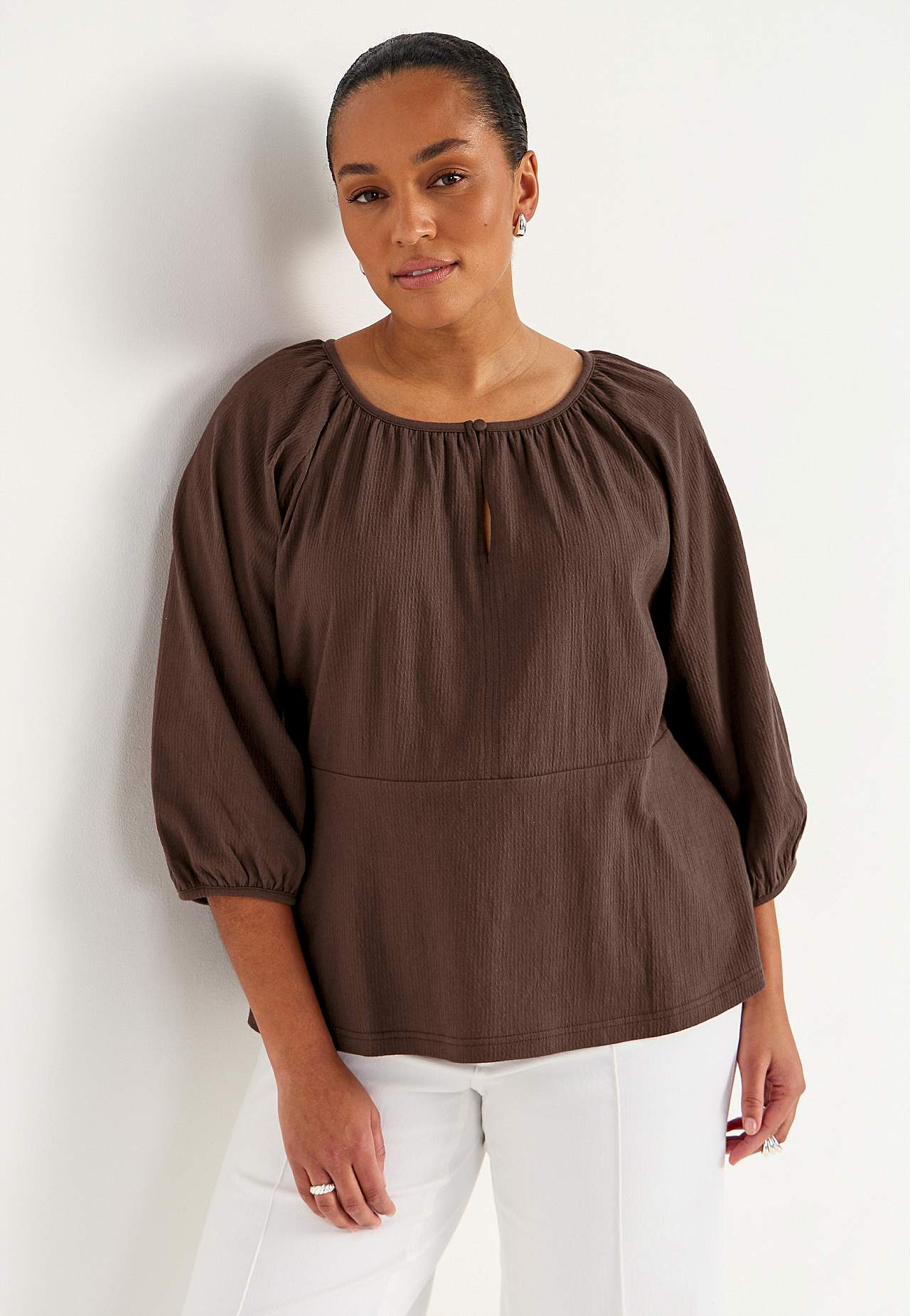 Joustava, pehmeä toppi aaltoilevalla sommitelmalla ja peplum-mallilla. Vartalonmyötäinen istuvuus ylhäällä korostetulla vyötärölinjalla ja levenevällä alaosalla. Pyöristetty pääntie pienellä, päällystetyllä napilla ja halkiolla. 3/4-pituiset, leveät raglanhihat kätketyllä kuminauhalla hihansuissa. Pyöristetty helma. Takapit... Lue lisää