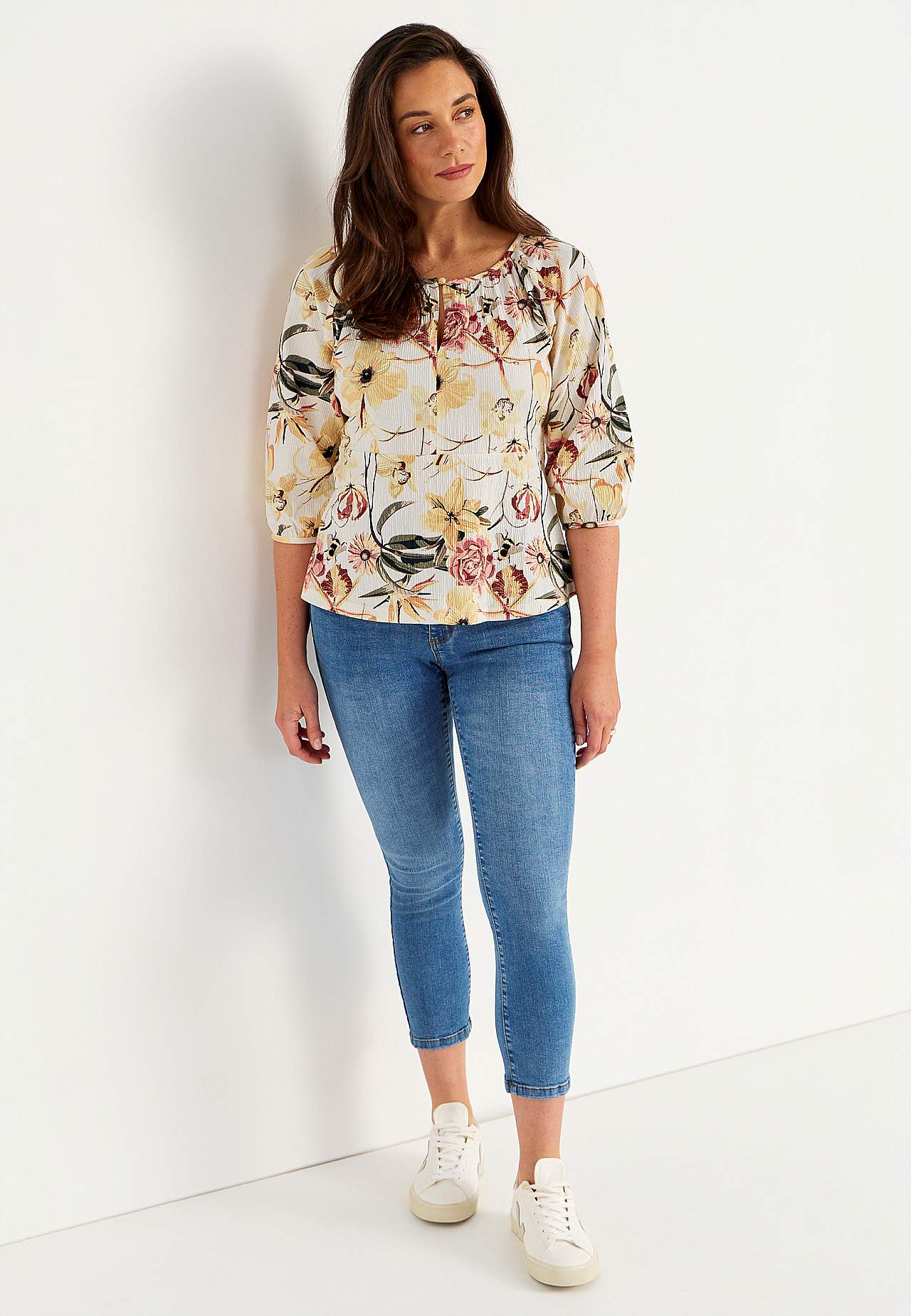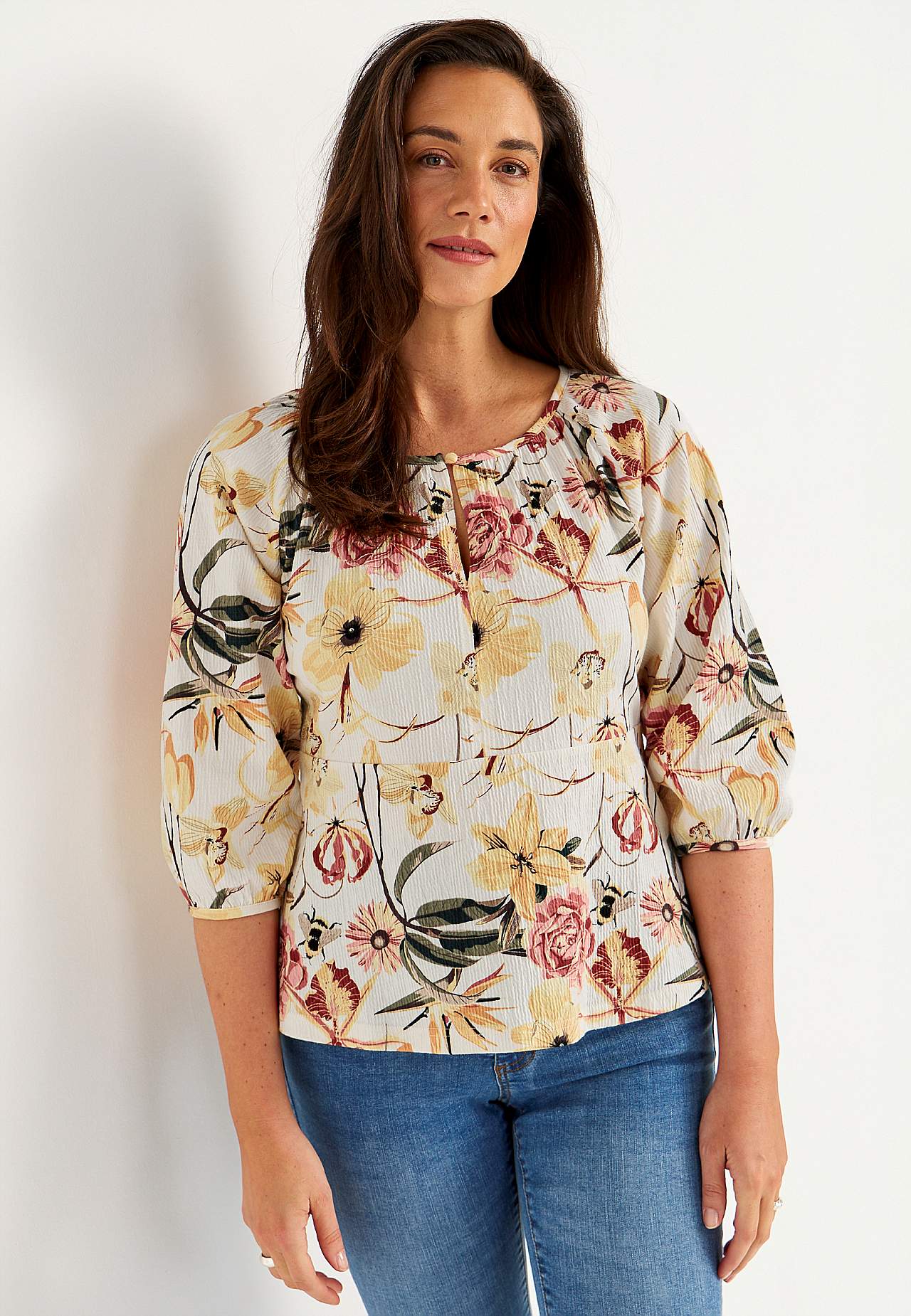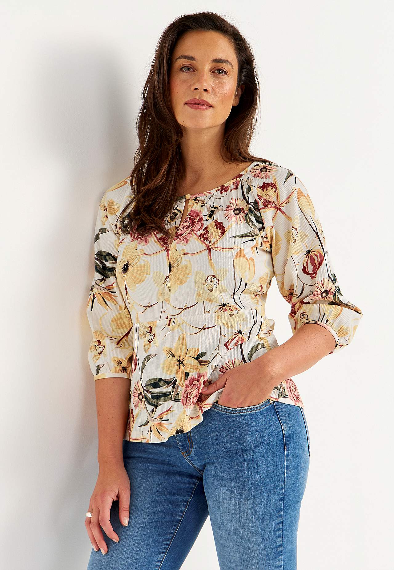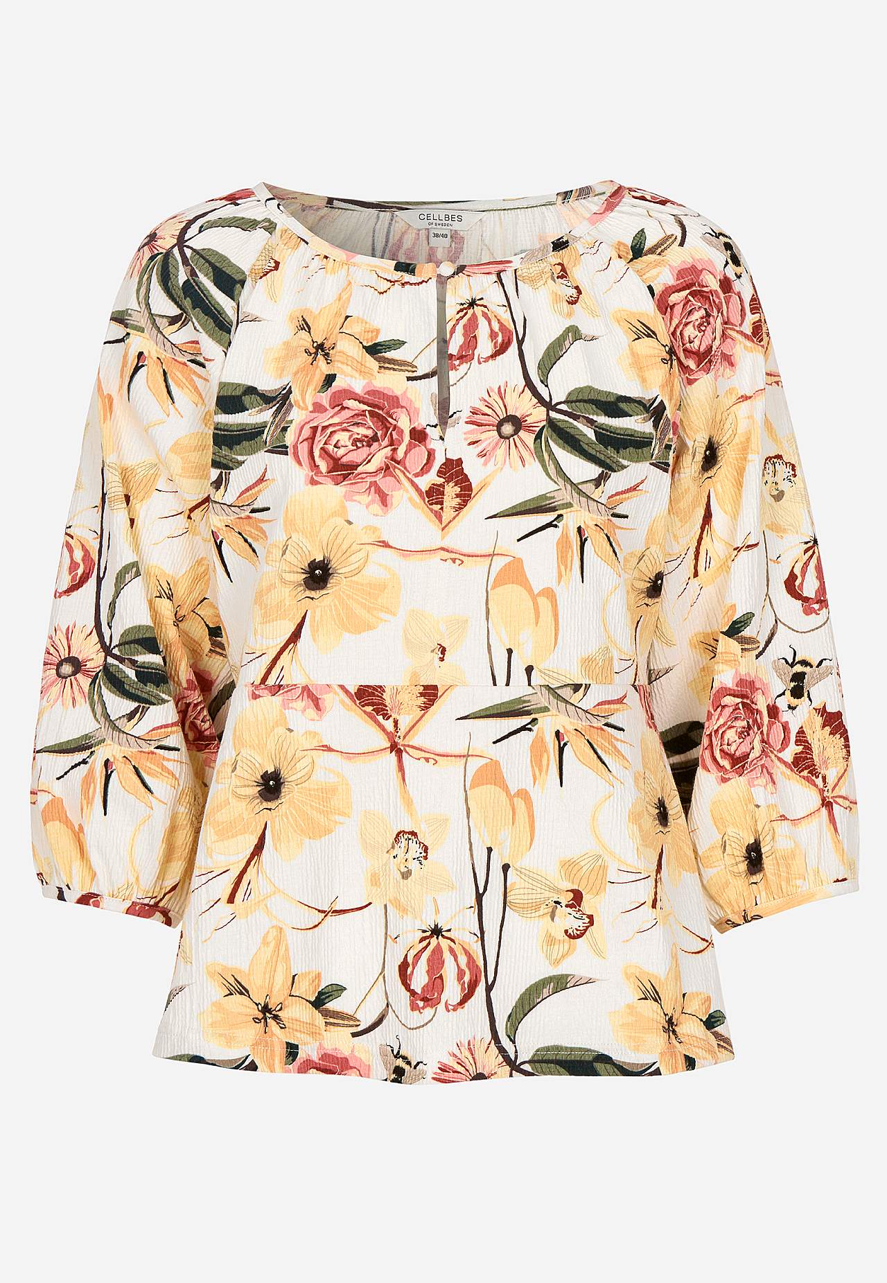 Joustava, pehmeä toppi aaltoilevalla sommitelmalla ja peplum-mallilla. Vartalonmyötäinen istuvuus ylhäällä korostetulla vyötärölinjalla ja levenevällä alaosalla. Pyöristetty pääntie pienellä, päällystetyllä napilla ja halkiolla. 3/4-pituiset, leveät raglanhihat kätketyllä kuminauhalla hihansuissa. Pyöristetty helma. Takapit... Lue lisää