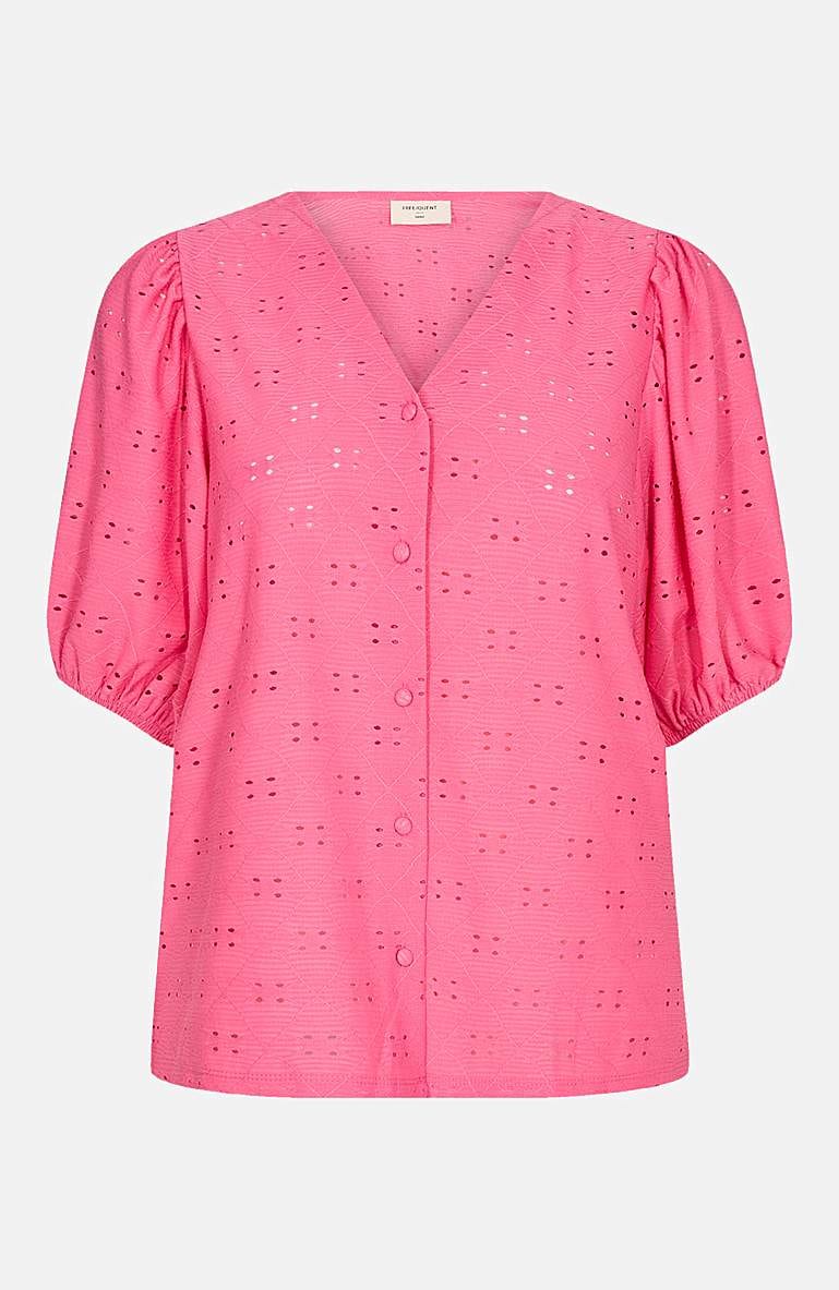 Trikootoppi Freequent-tuotemerkiltä. Femy trikootoppi. Pehmeä, mukava trikoolaatu kauniilla reikäkirjonnoilla. Napitettu malli v-pääntiellä. Lyhyet hihat kevyillä puhvihihoilla ja elastisella hihansuulla. Pituus olkapäästä n. 60 cm koossa S (38).