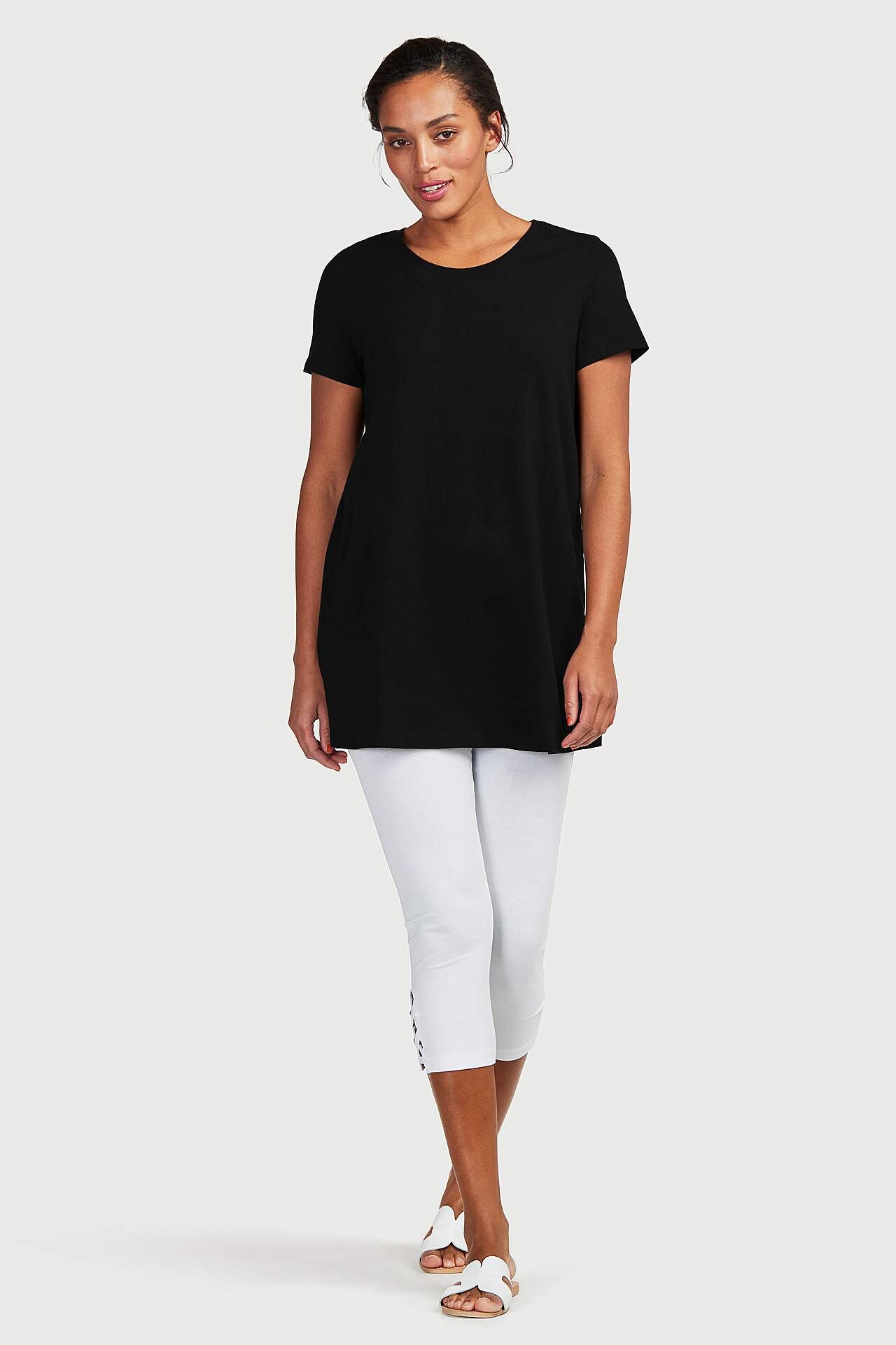 Tunika yksivärisestä trikoosta. A-linjainen istuvuus lyhyillä hihoilla. Pyöreä pääntie. Takapituus olkapäältä koon mukaan noin 79-86 cm. Lyhyet hihat. Imarteleva A-linjainen leikkaus.