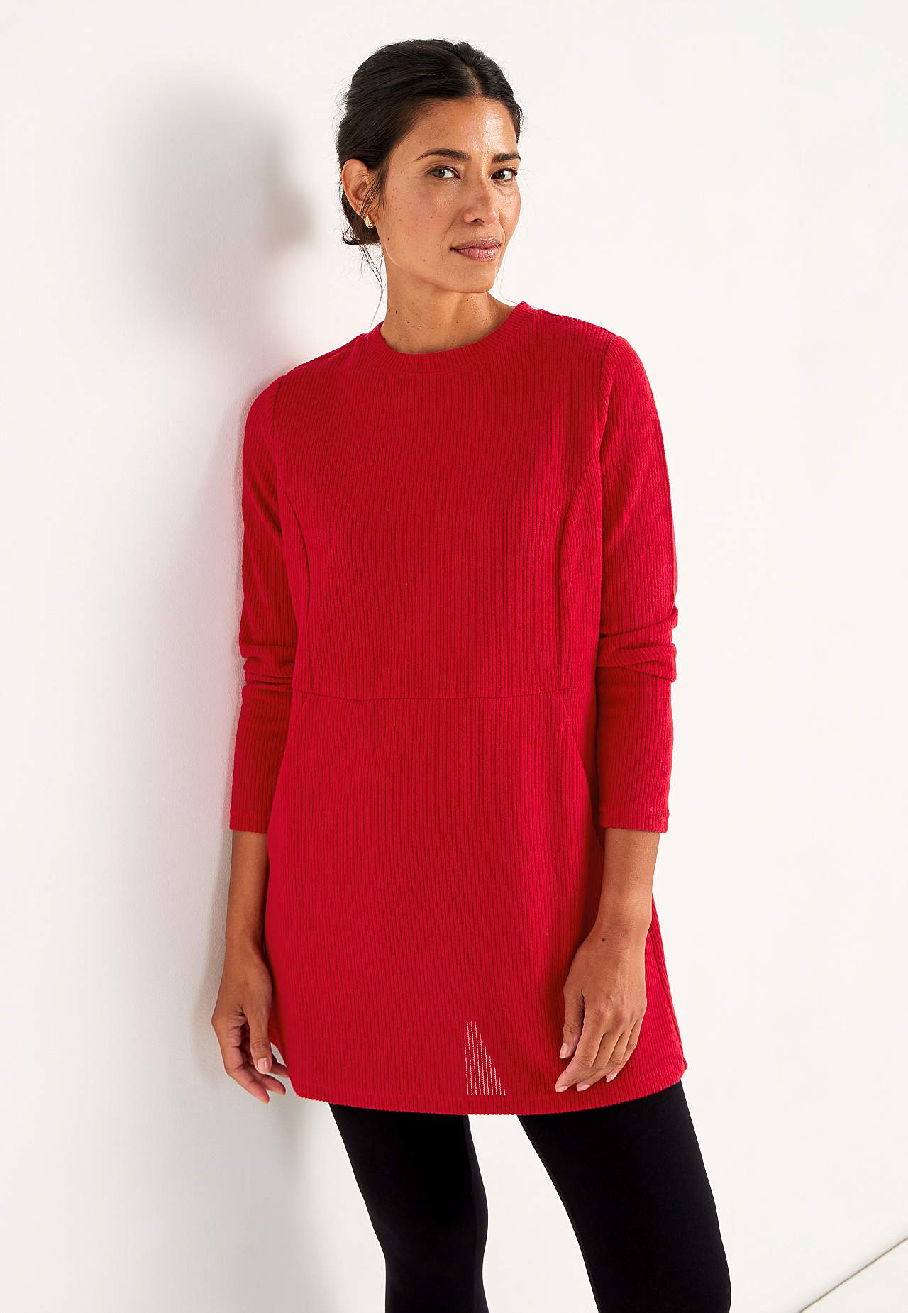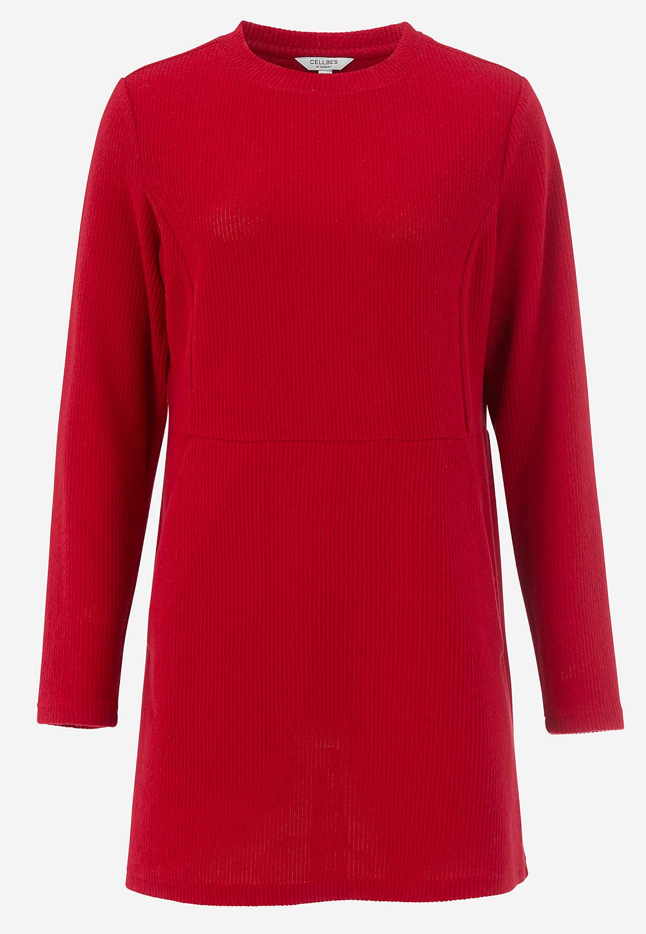 Pehmeä, neulottu tunika. Joustava, ribattu materiaali harjatulla pinnalla. Suora istuvuus. Pyöreä pääntie. Sovitetut saumat edessä sisäänommelluilla, kätketyillä taskuilla. Koristeellinen, vaakasuora keskisauma. Pitkät, suorat hihat. Pyöristetty helma kevyesti. Pituus olkapäältä koon mukaan noin 80-91 cm cm.