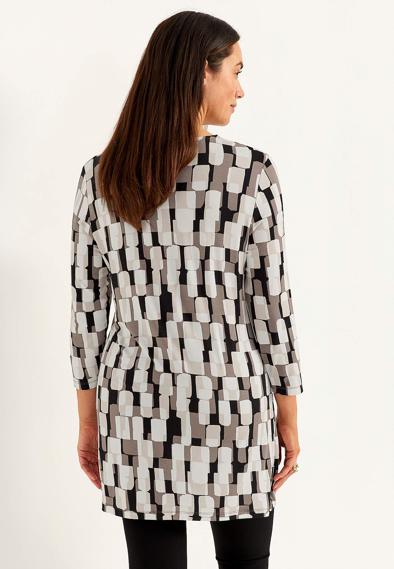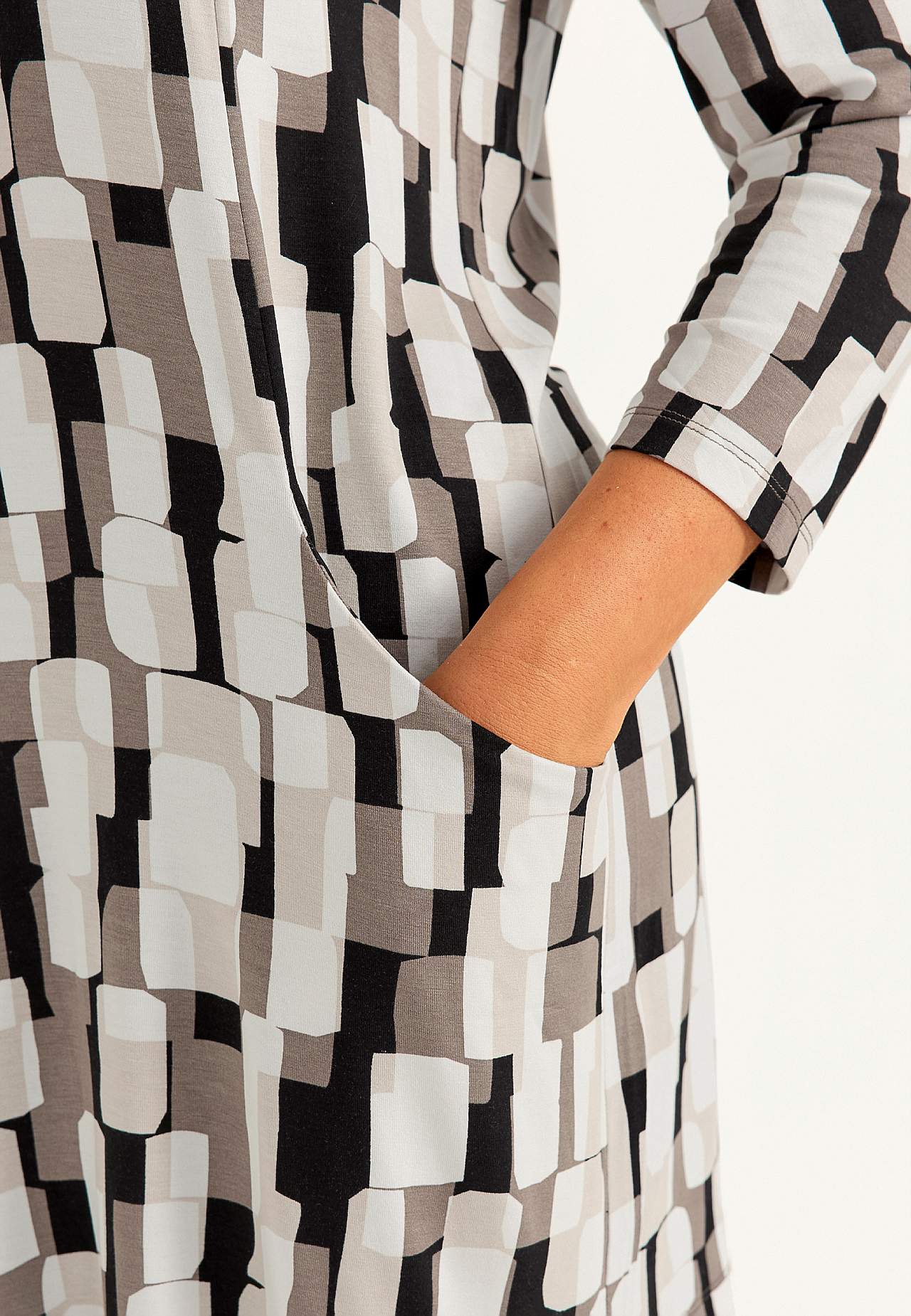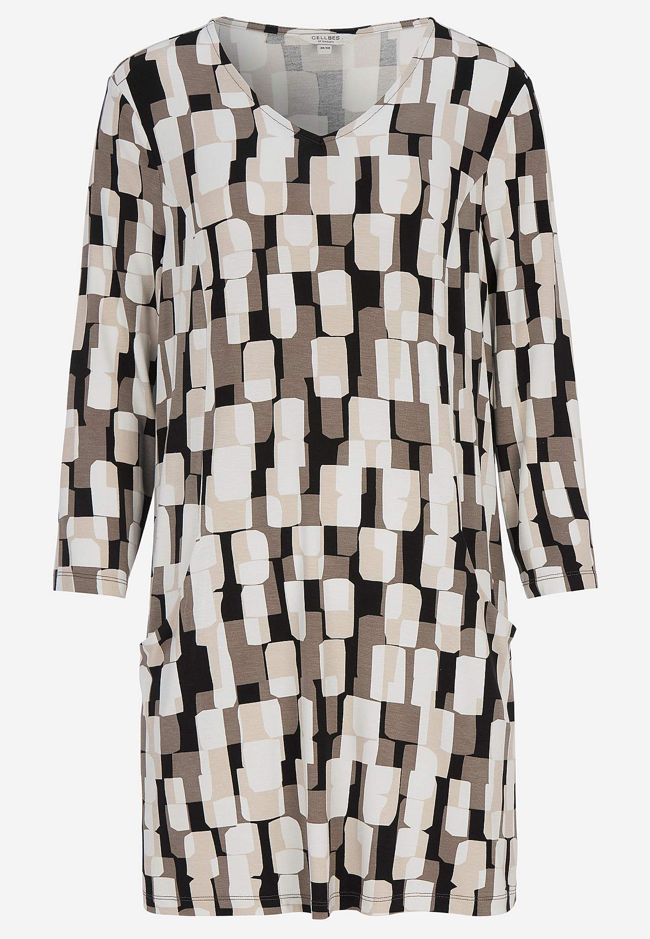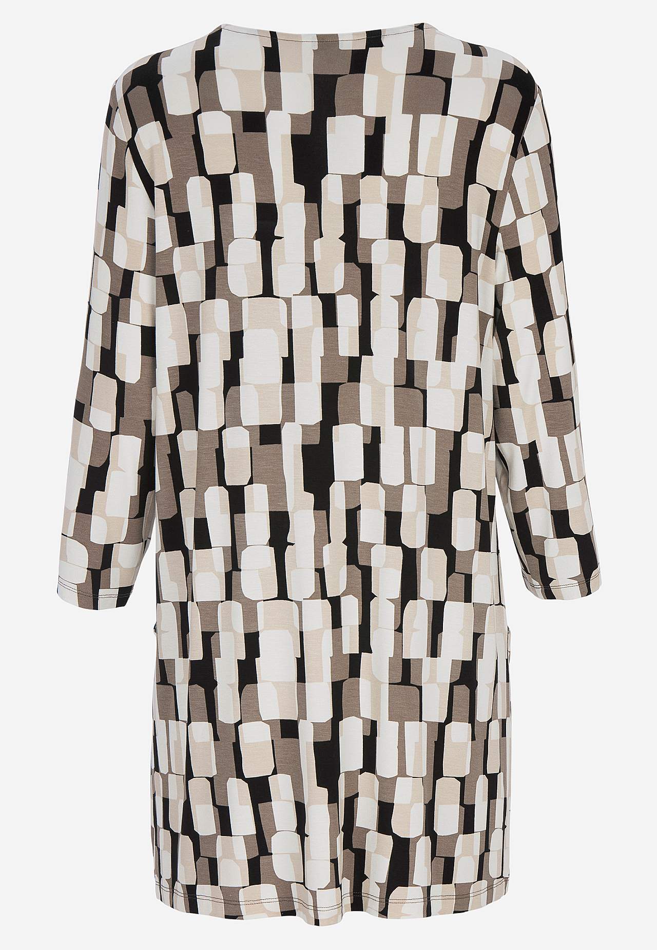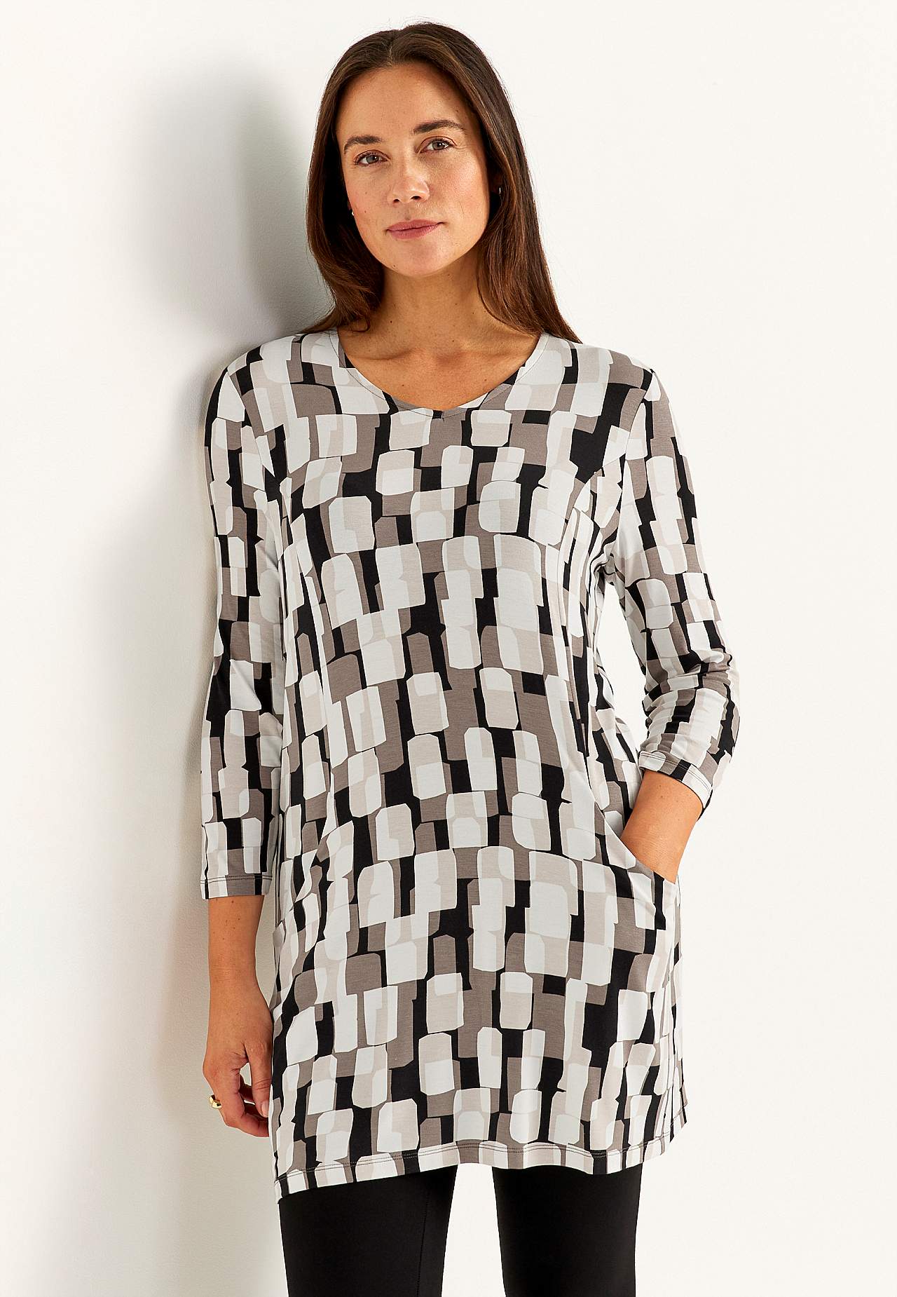 Tunika ihanan pehmeästä, joustavasta viskoosista. Viileä materiaali kivalla laskeutumisella. Normaali istuvuus. V-muotoinen pääntie. Koristesaumat edessä. Taskut edessä. Suorat 3/4-hihat. Suora helma. Pituus olkapäältä koon mukaan noin 82-89 cm.