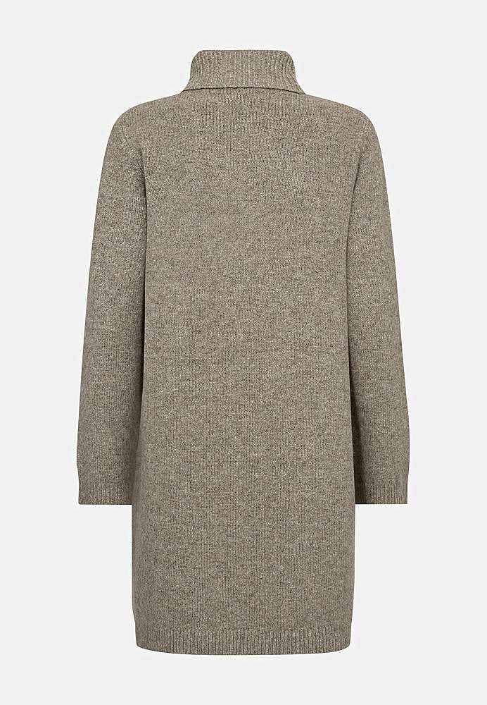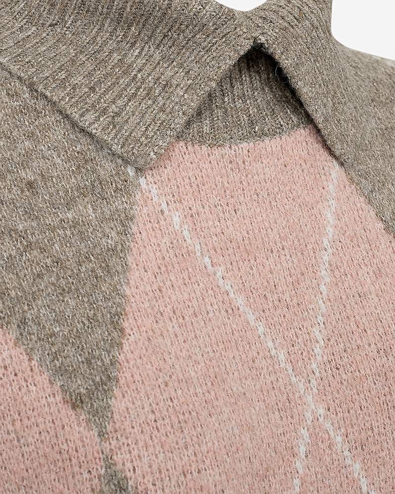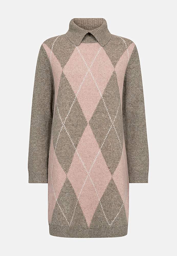Pehmeä, neulottu tunika. Suora, hieman väljempi istuvuus. Diagonaalinen ruutukuvio edessä pinkeillä, beigeillä väreillä. Poolokaulus halkiolla edessä. Pitkät hihat ribbiresorilla ja halkiolla hihansuissa. Suora helma ribbiresorilla. Pituus olkapäästä n. 90 cm koossa S (38).