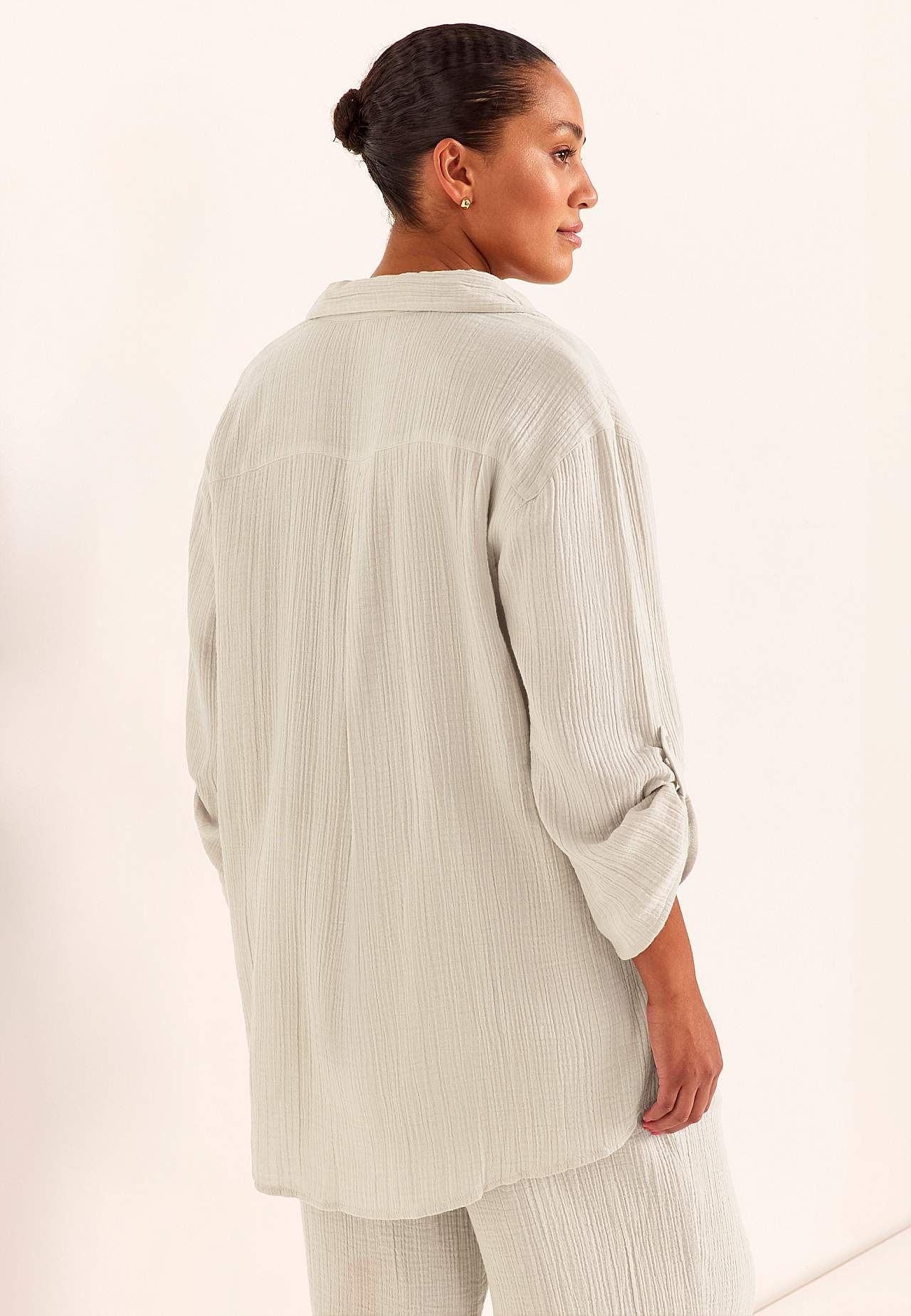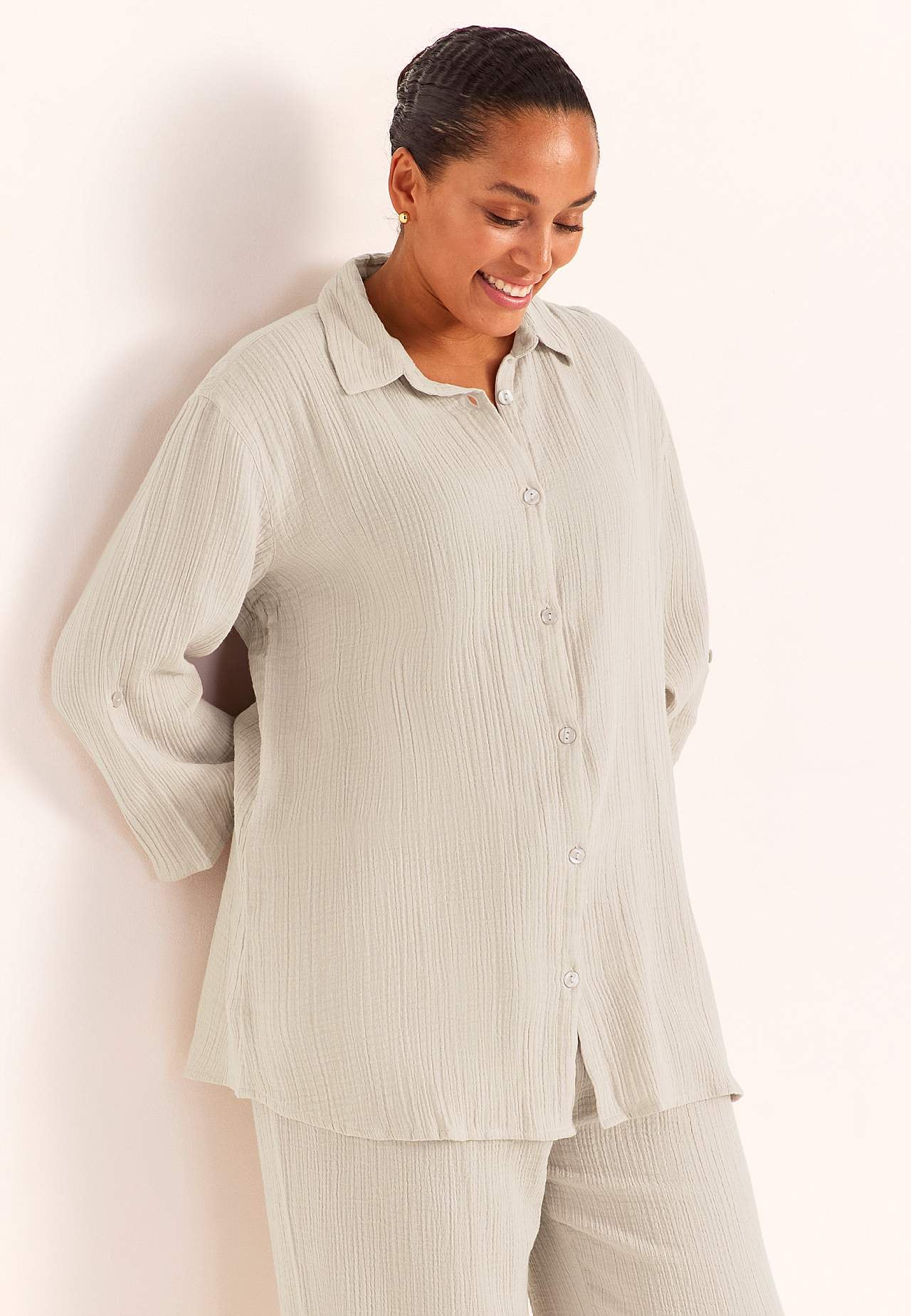 Paita ihanasta, ilmavasta puuvillamusliinista luonnollisella rakenteella. Malli kauluksella ja napeilla. Ylikokoinen istuvuus. Perinteinen kaulus. Pudotettu olkapää. Nappikiinnitys. Kaarroke ja tyylikäs vekki takana. 3/4-hiha napilla hihanauhalla. Pyöristetty, takaa hieman pidempi helma. Pituus olkapäältä koon mukaan noin ... Lue lisää