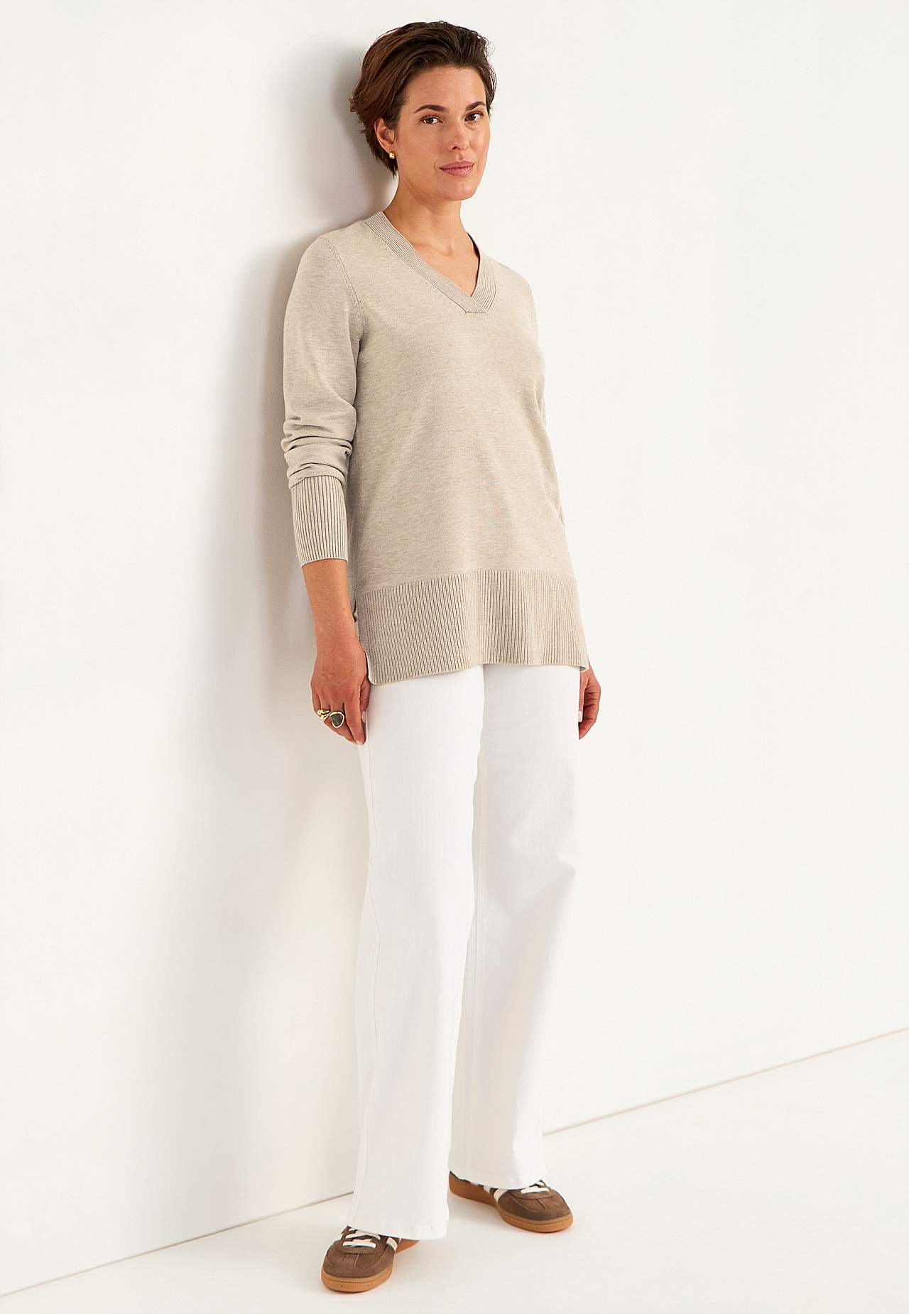 Pehmeä, tiheäsilmukkainen tunikatoppi. Ilmava, mukava laatu. Normaali istuvuus. Syvä v-pääntie. Pitkät hihat leveällä ribbiresorilla. Muotoonneulotut hihanaukot. Suora helma korkeilla halkioilla ja leveällä ribbiresorilla. Pituus olkapäältä koon mukaan noin 75-87 cm.