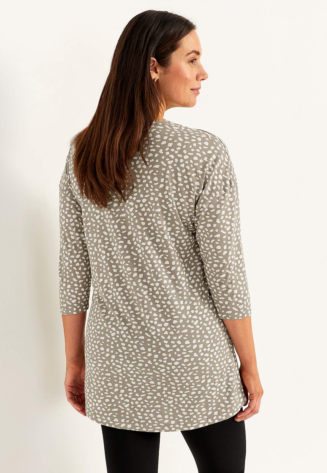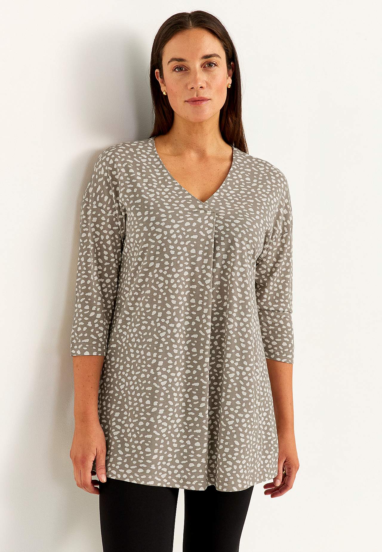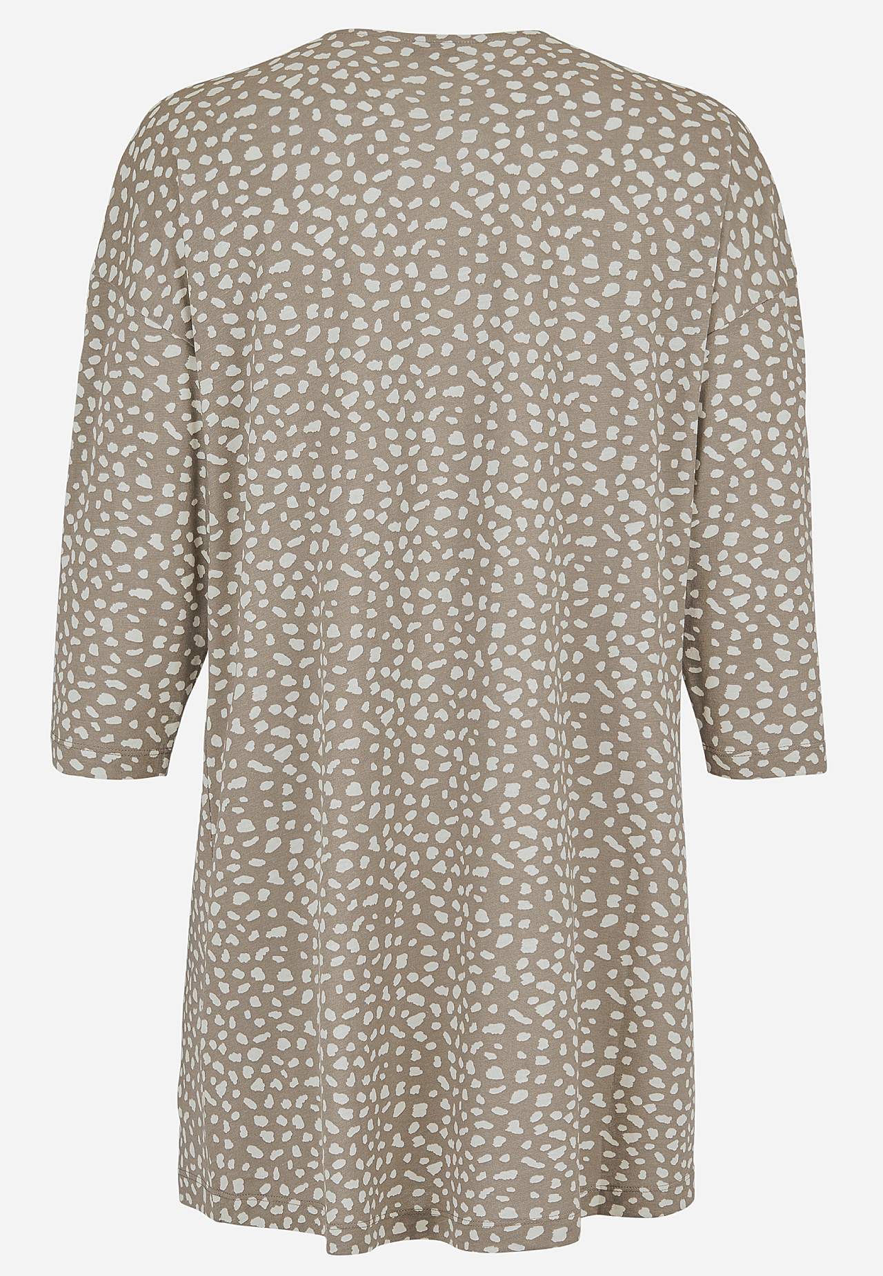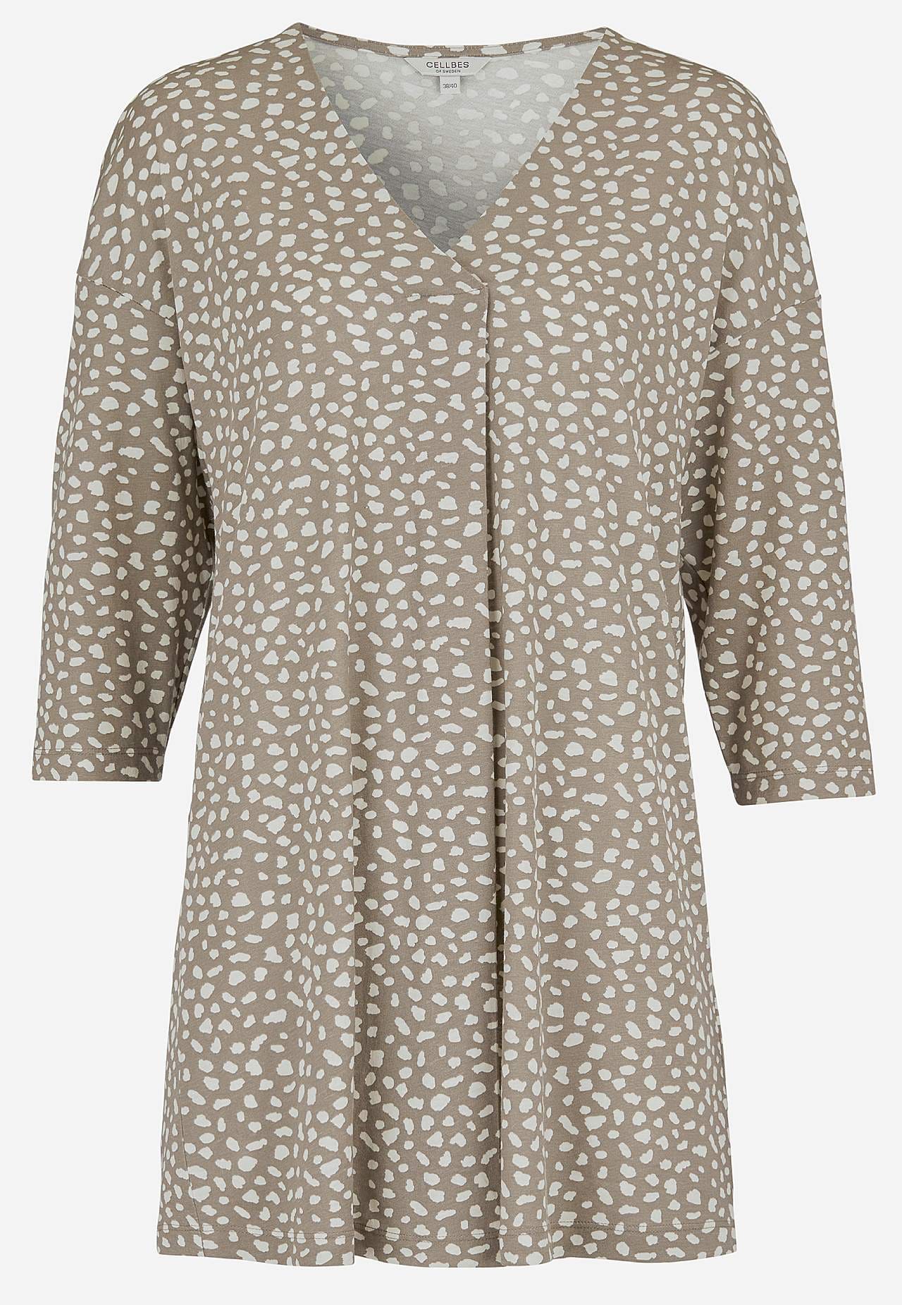 Pehmeä tunika puuvillaviskoosisekoitteesta kivalla istuvuudella. Tilava istuvuus. A-linjainen malli. V-pääntie koristeellisella vekillä. Pudotettu olkapää. 3/4-pituiset hihat. Pyöristetty helma. Takapituus olkapäältä koon mukaan noin 79-89 cm.