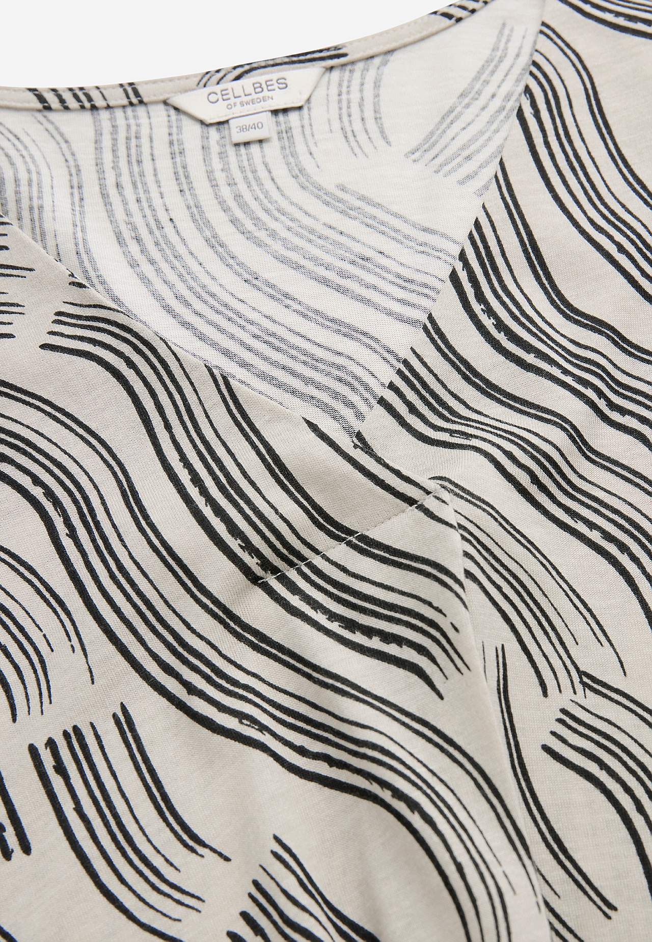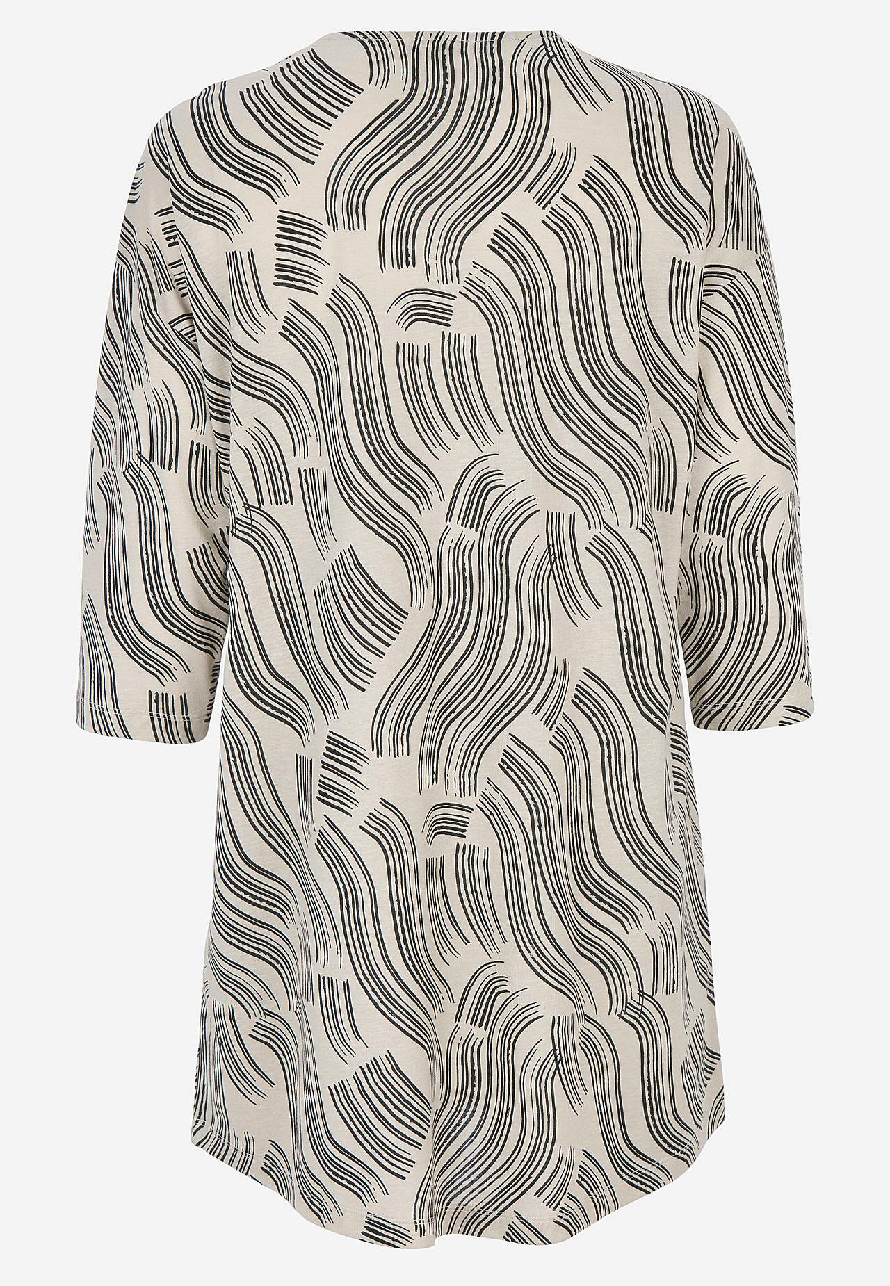 Pehmeä tunika puuvillaviskoosisekoitteesta kivalla istuvuudella. Tilava istuvuus. A-linjainen malli. V-pääntie koristeellisella vekillä. Pudotettu olkapää. 3/4-pituiset hihat. Pyöristetty helma. Takapituus olkapäältä koon mukaan noin 79-89 cm.