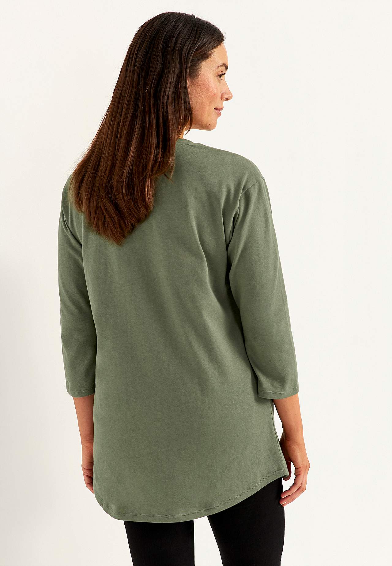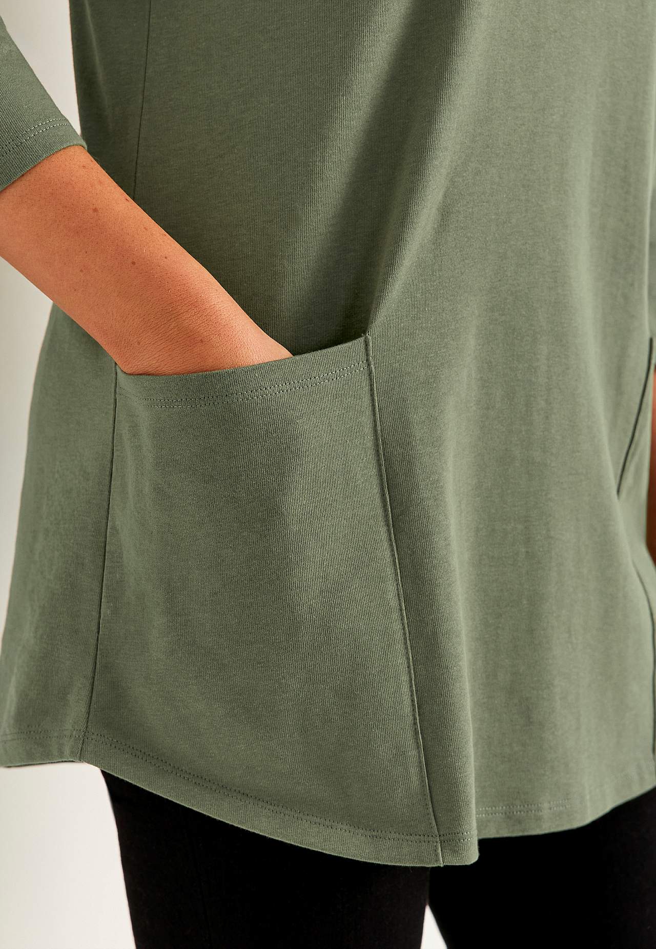 Tunikatoppi mukavilla, suurilla taskuilla. Pehmeä, kestävä, hieman raskaampi laatu. Ylikokoinen istuvuus. Pyöreä, ribattu kaula-aukko. Pudotettu olkapää. 3/4-pituiset, hieman leveämmit hihat. Suuret etutaskut. Pyöristetty helma. Pituus olkapäältä koon mukaan noin 78-92 cm.