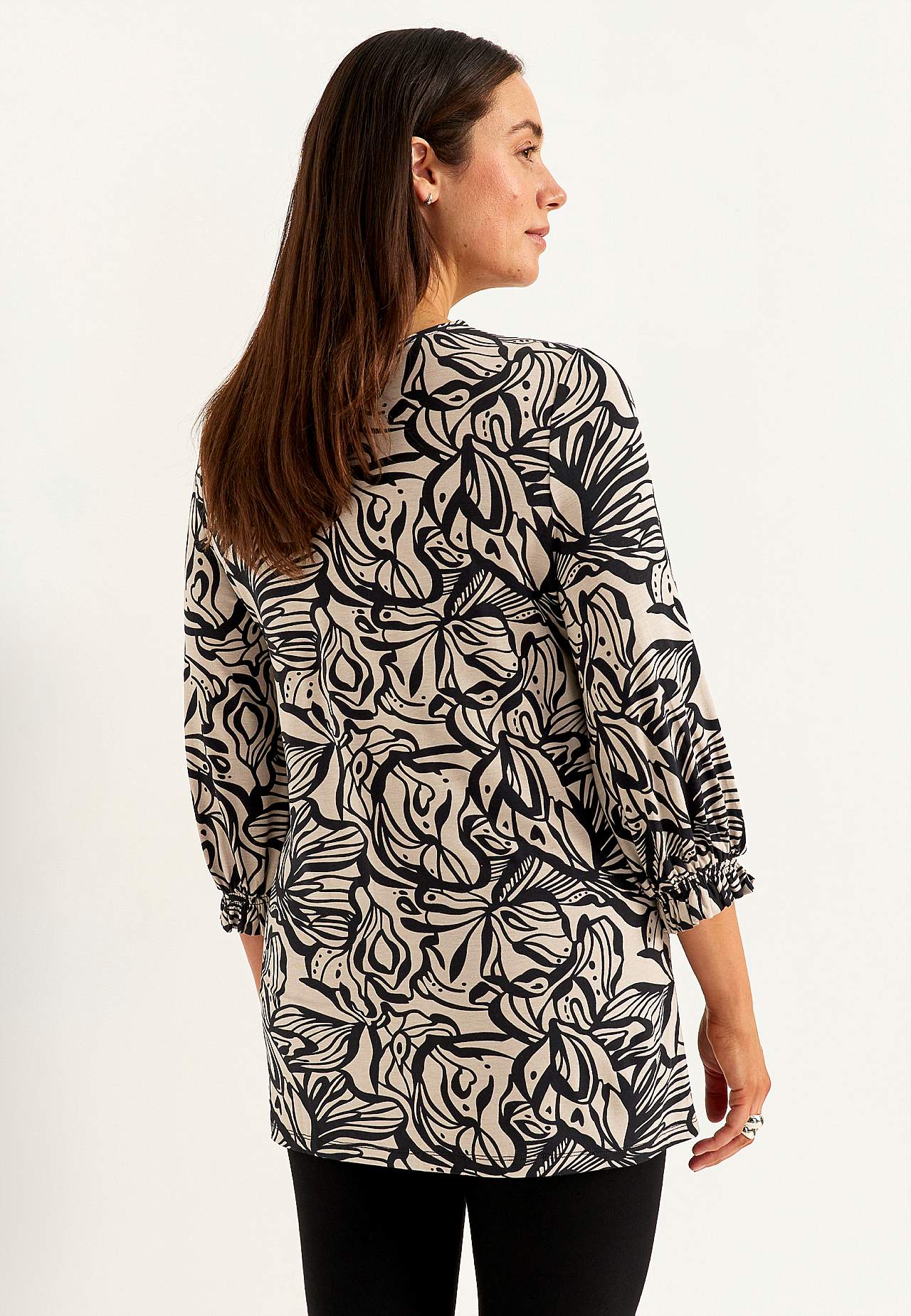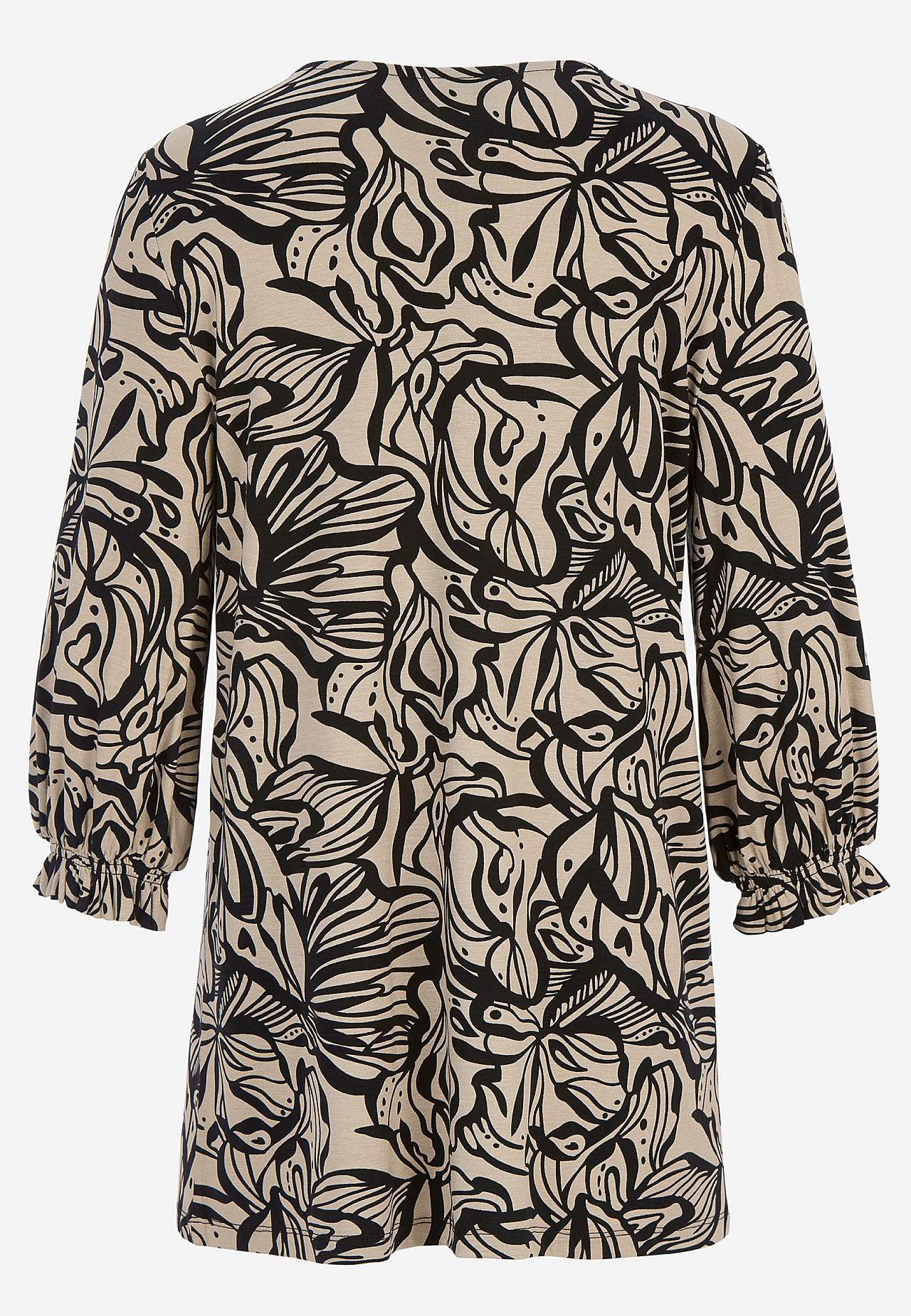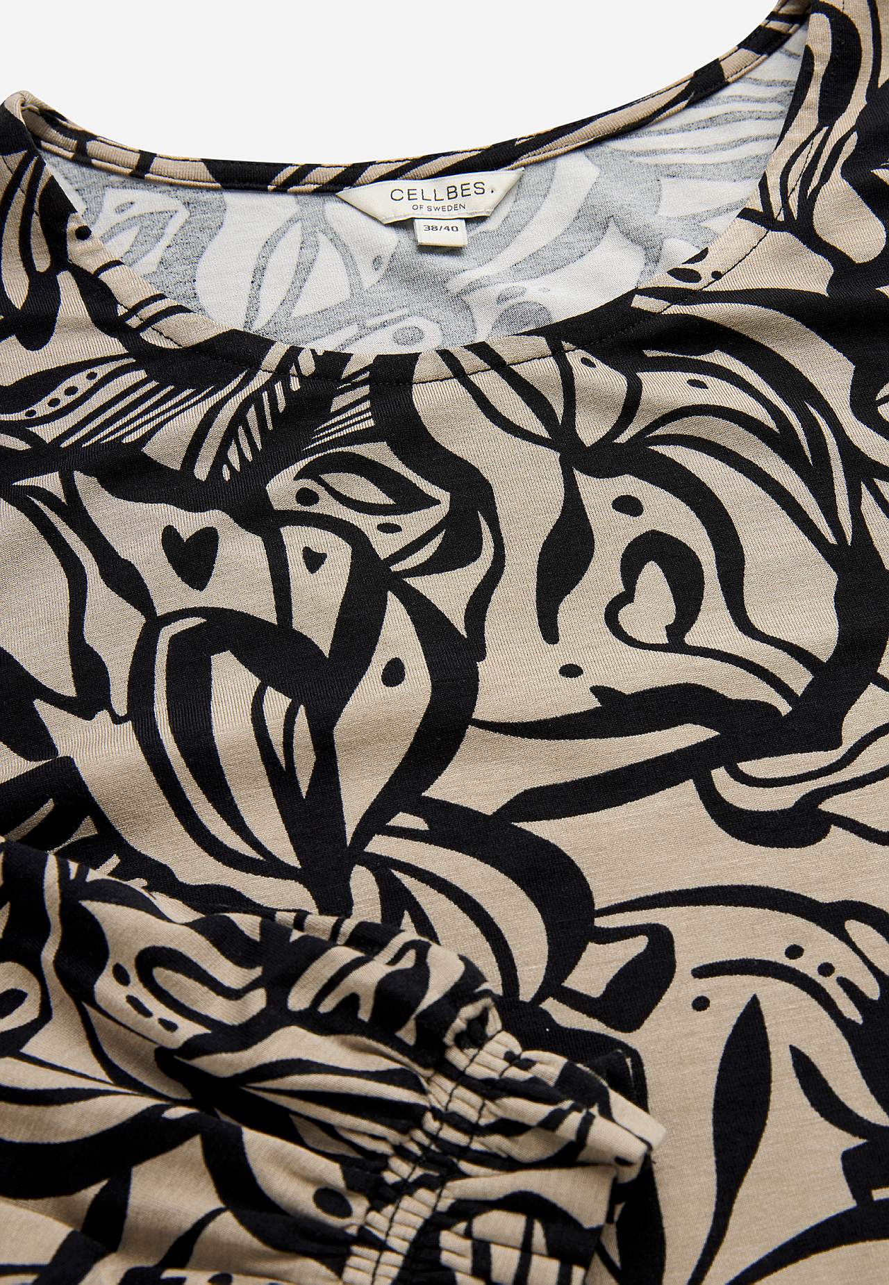 Kiva, raskas laskeutuminen. Normaali istuvuus. Pyöristetty pääntie. 3/4-pituiset, leveät hihat ja rypytys hihansuissa. Pituus olkapäältä koon mukaan noin 73-80 cm.