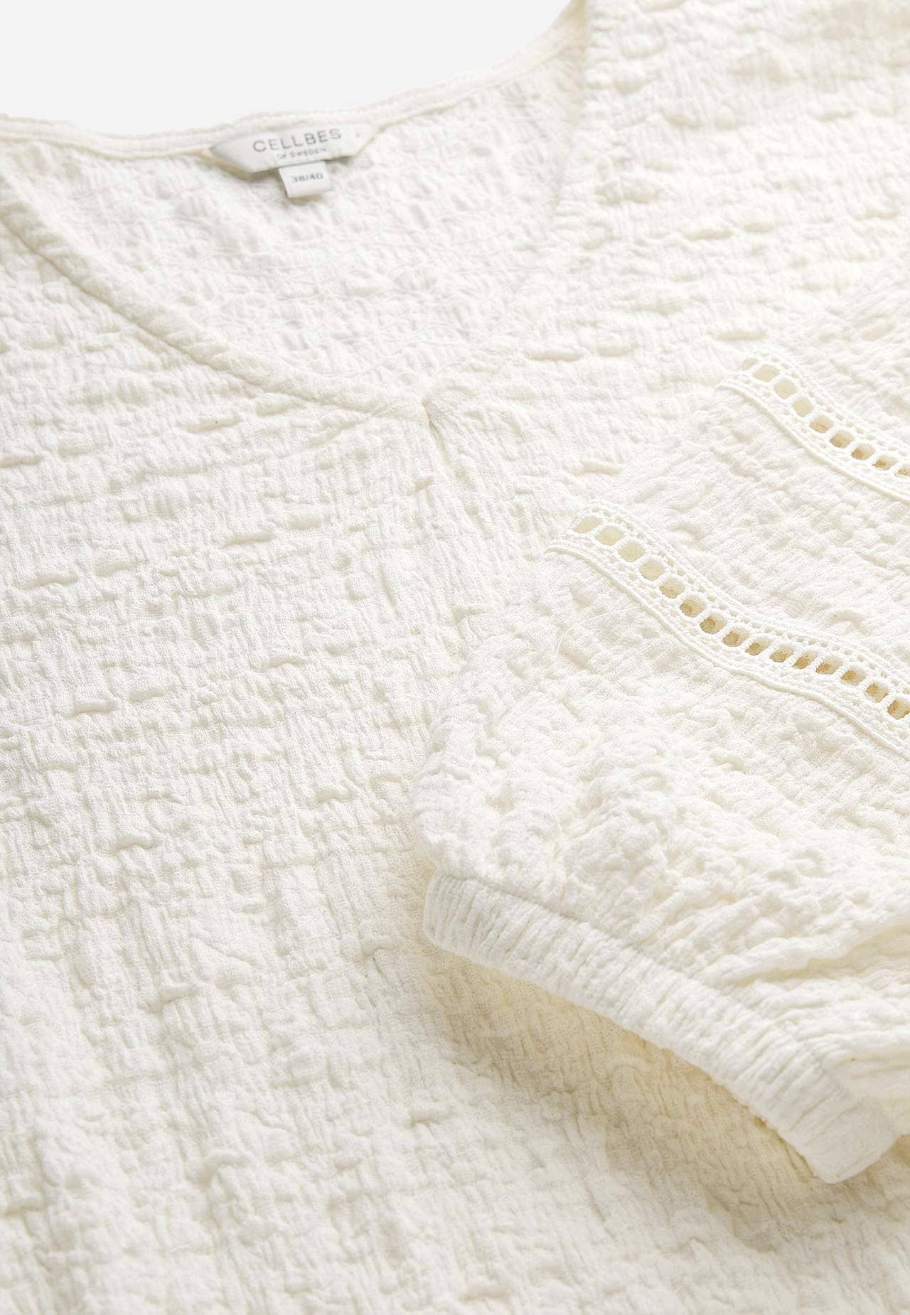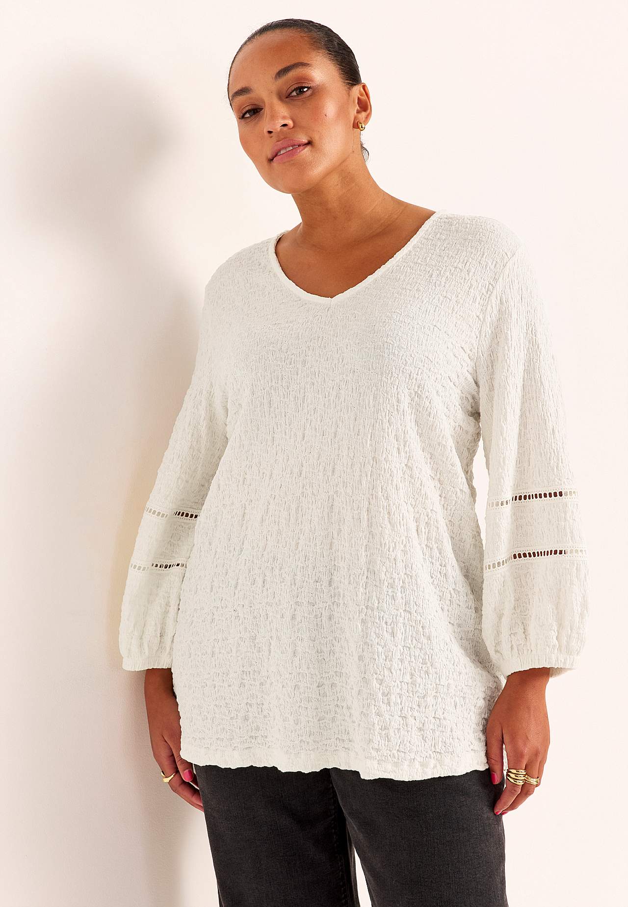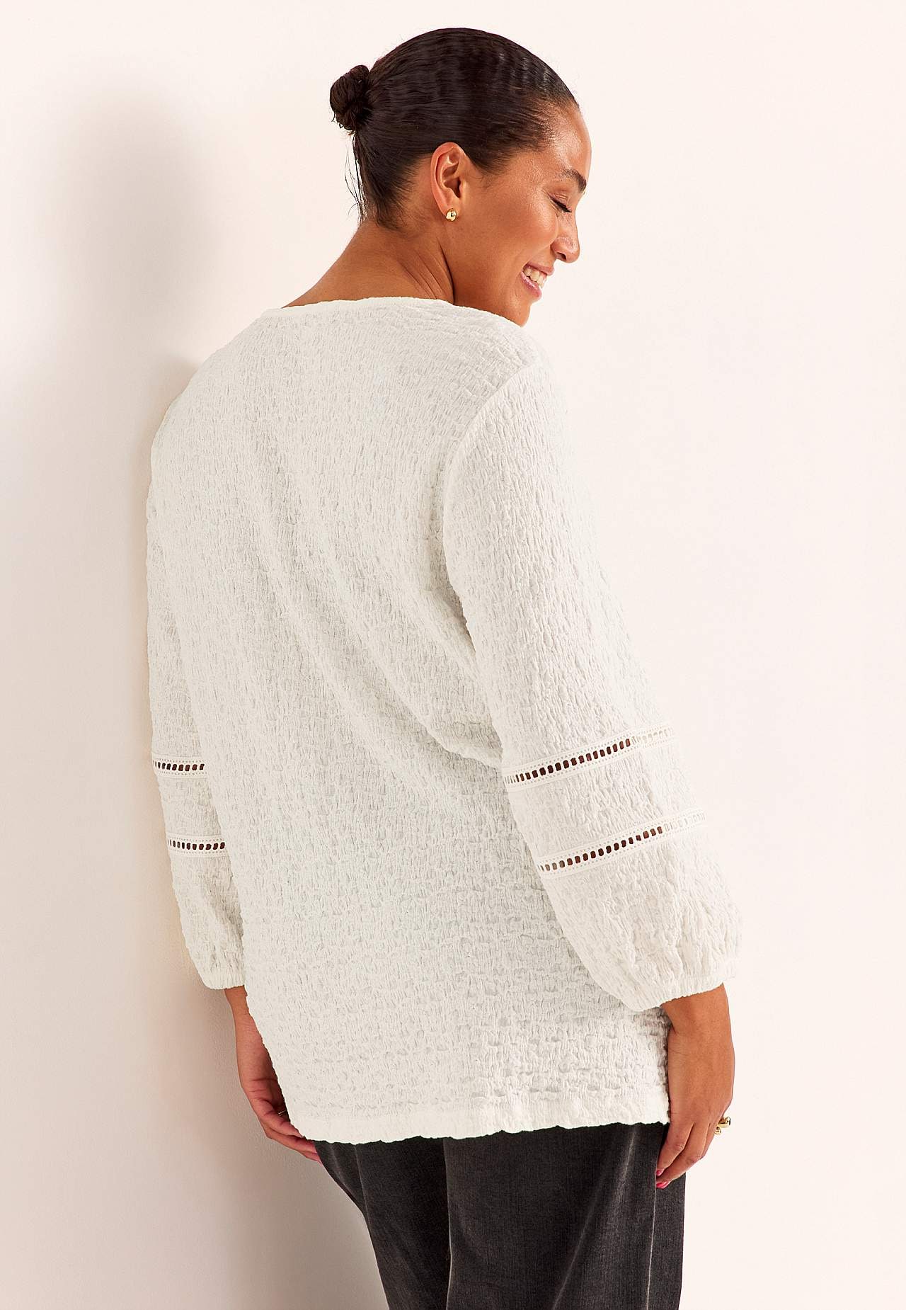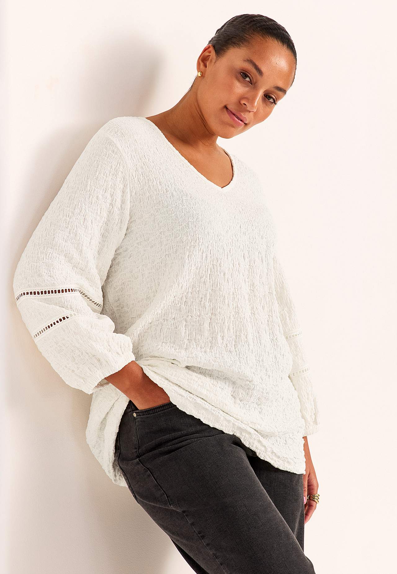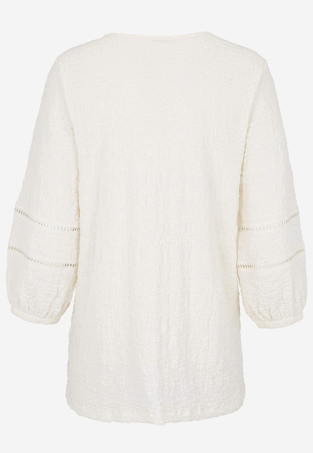 Tunika mukavasta, joustavasta puuvillasekoituksesta sommitelmalla. Kivat yksityiskohdat rei’ityksellä hihoissa. Normaali istuvuus lievästi levenevällä alaosalla. V-kaula-aukkoinen pääntie. 3/4-pituiset, leveät hihat kuminauhalla hihansuissa ja koristeompelilla rei’ityksellä. Suora helma. Takapituus koon mukaan n. 72-80 cm.