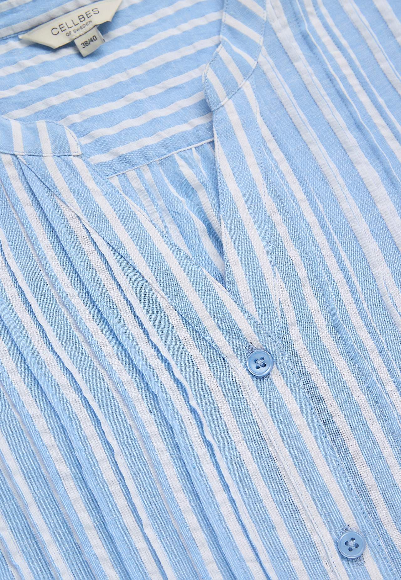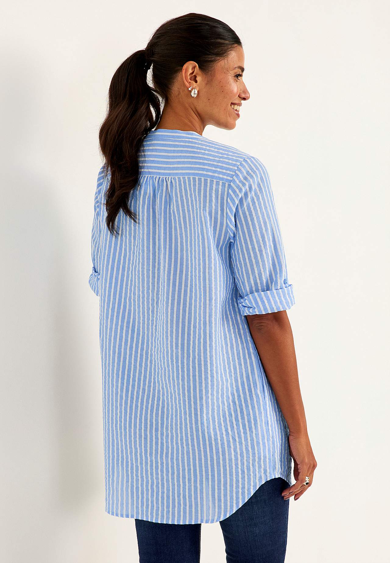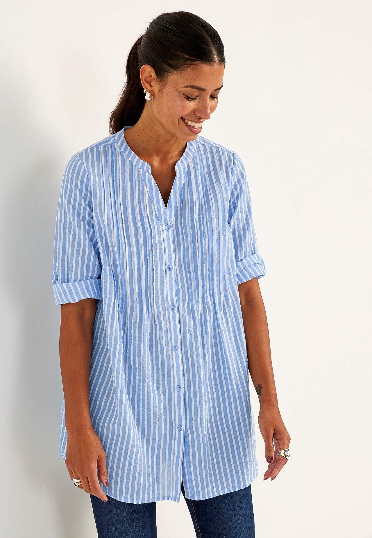 Ilmava pitkä paita koristeellisella laskoksella. Ihana materiaali seersuckerista. Pyöreä kaula-aukko v-muotoisella raolla. Nappikiinnitys. 3/4-pituinen, leveä kääritty nappihiha. Kätketyt taskut sivulla. Kaarroke takana laskoksilla. Pituus olkapäältä koon mukaan noin 82-94 cm.