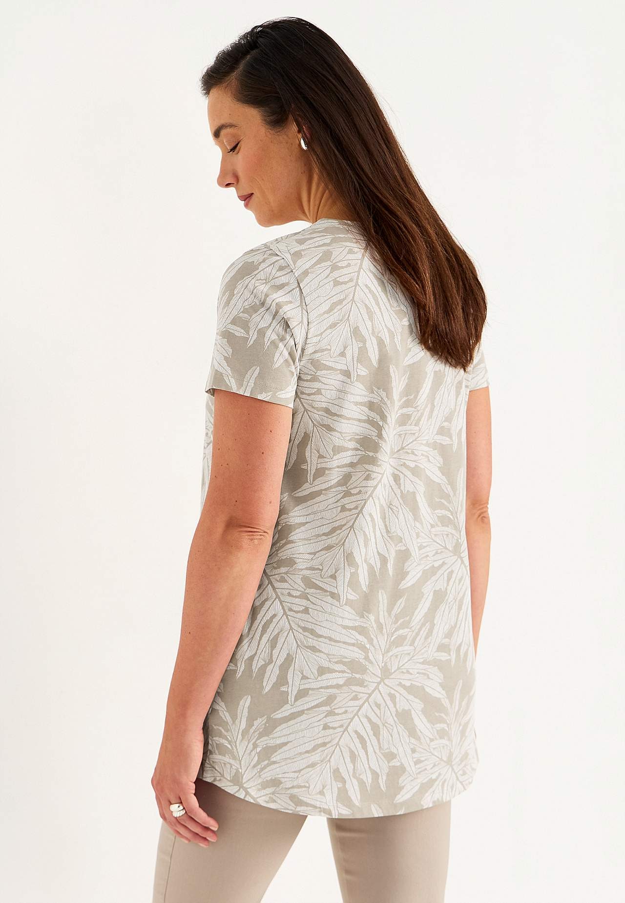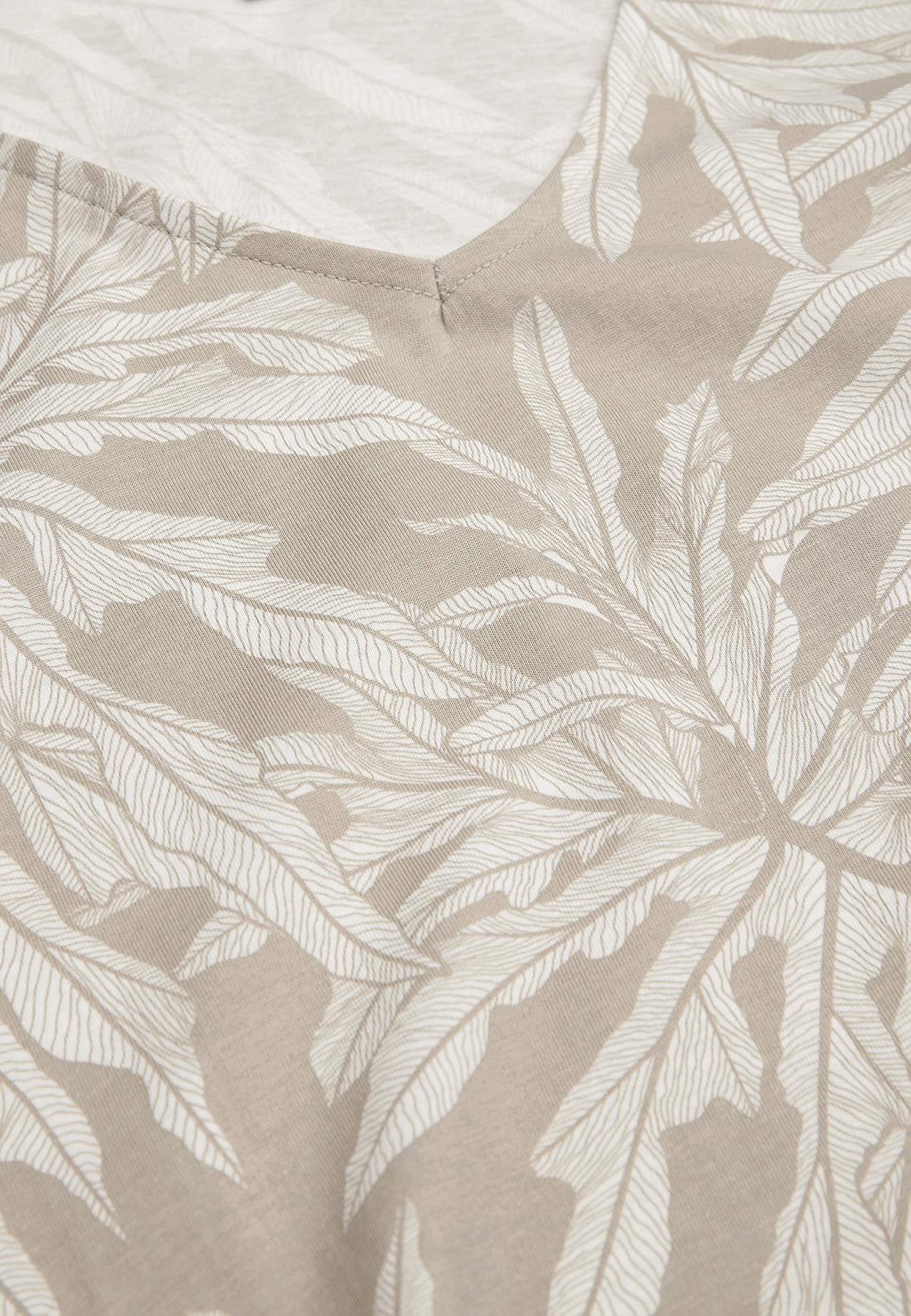 Trikootunika kivalla lehtikuviolla. Pehmeä, orgaaninen puuvilla. A-linjainen, hieman tyköistuvampi istuvuus ylhäällä. V-kaula-aukkoinen pääntie. Lyhyet hihat. Taskut sivusaumassa. Pyöristetty helma. Takapituus olkapäältä koon mukaan noin 78-86 cm.