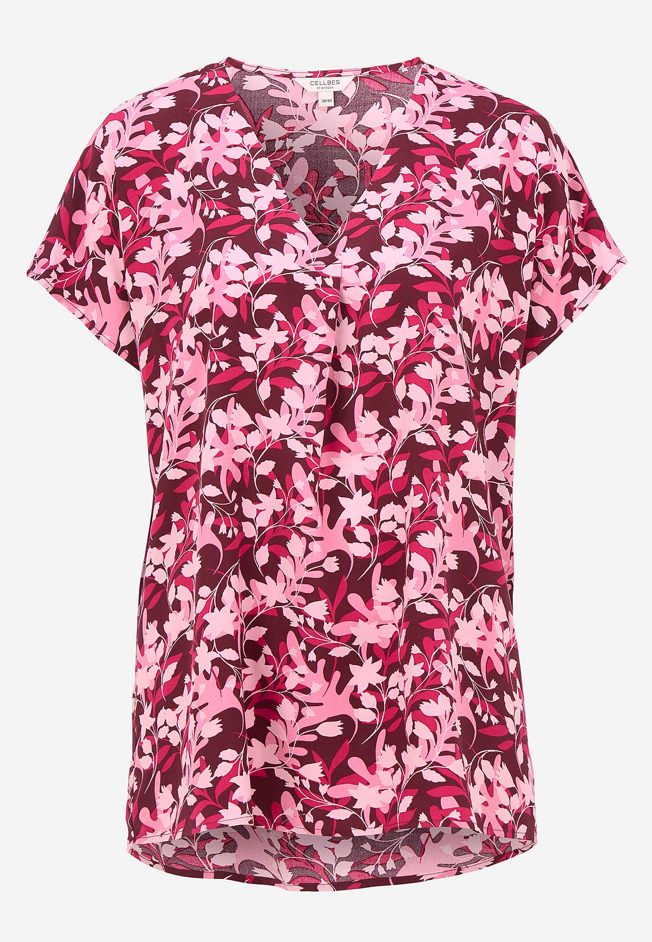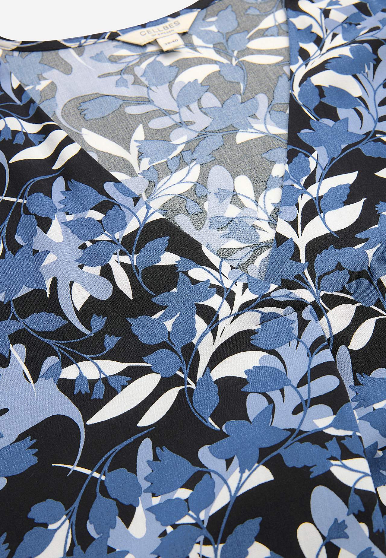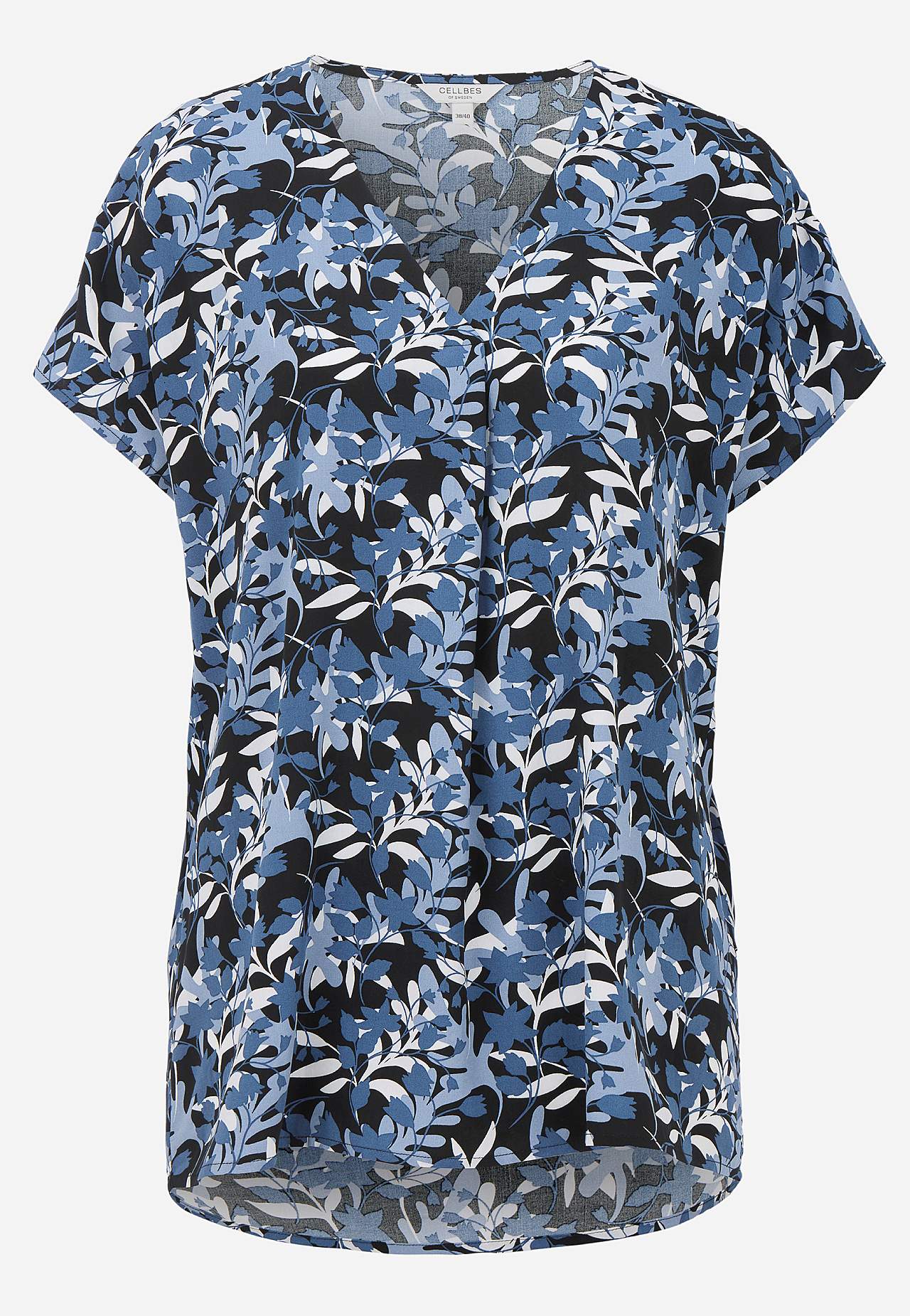 Tunika pehmeästä, sileästä viskoosista. Hieman väljempi istuvuus. V-kaula-aukkoinen kaula-aukko koristeellisella vekillä edessä. Holkkihihat. Lievästi pyöristetty, takaa hieman pidempi helma. Pituus olkapäältä koon mukaan noin 71-83 cm.