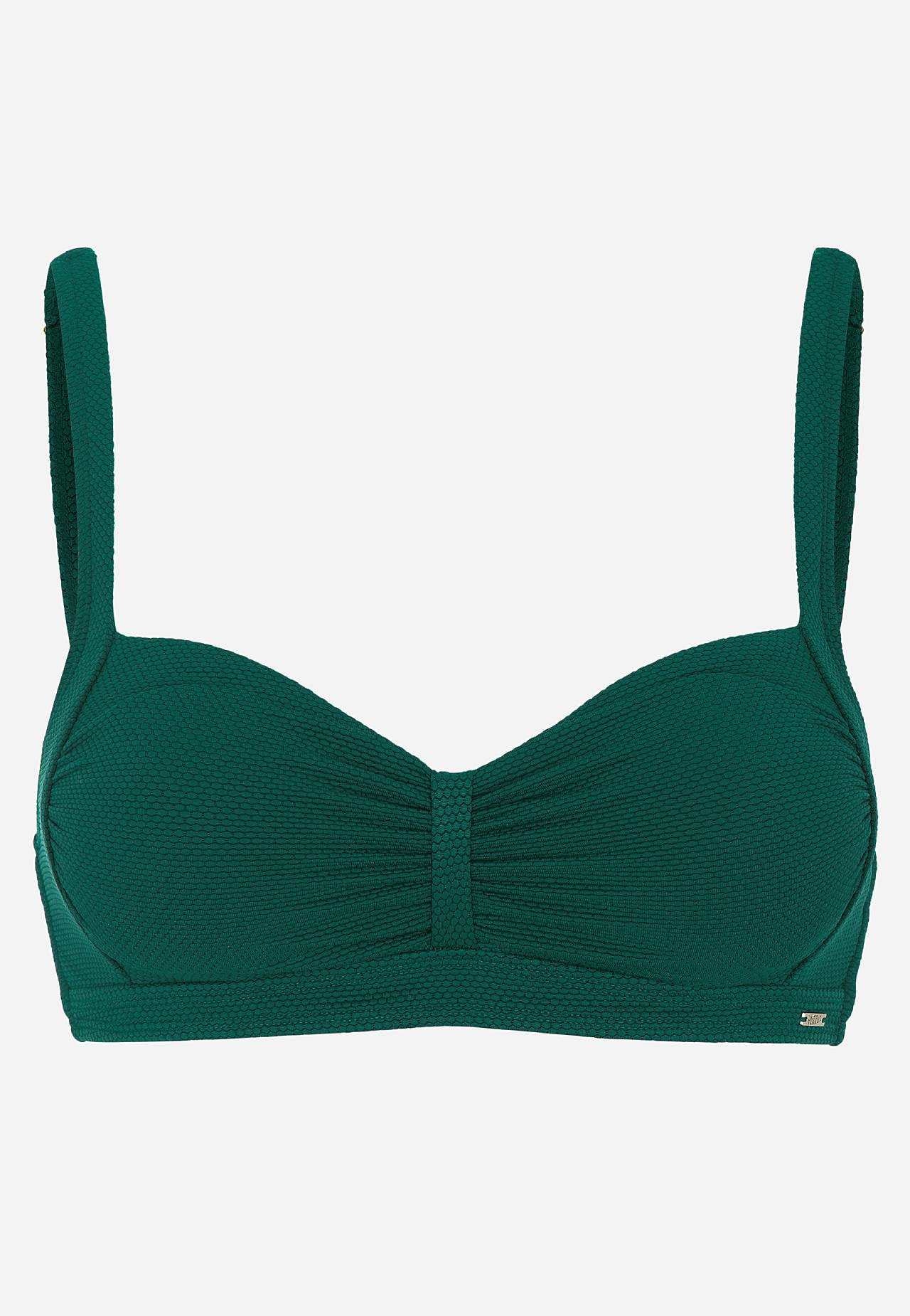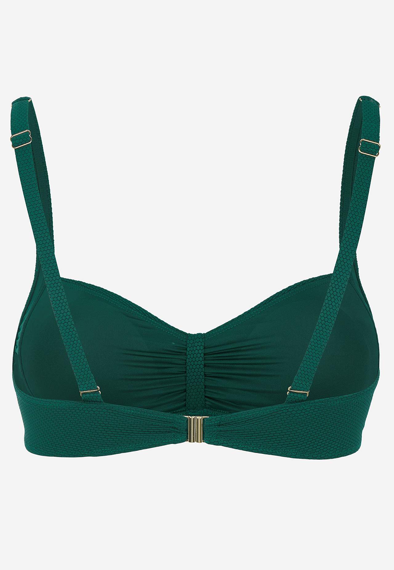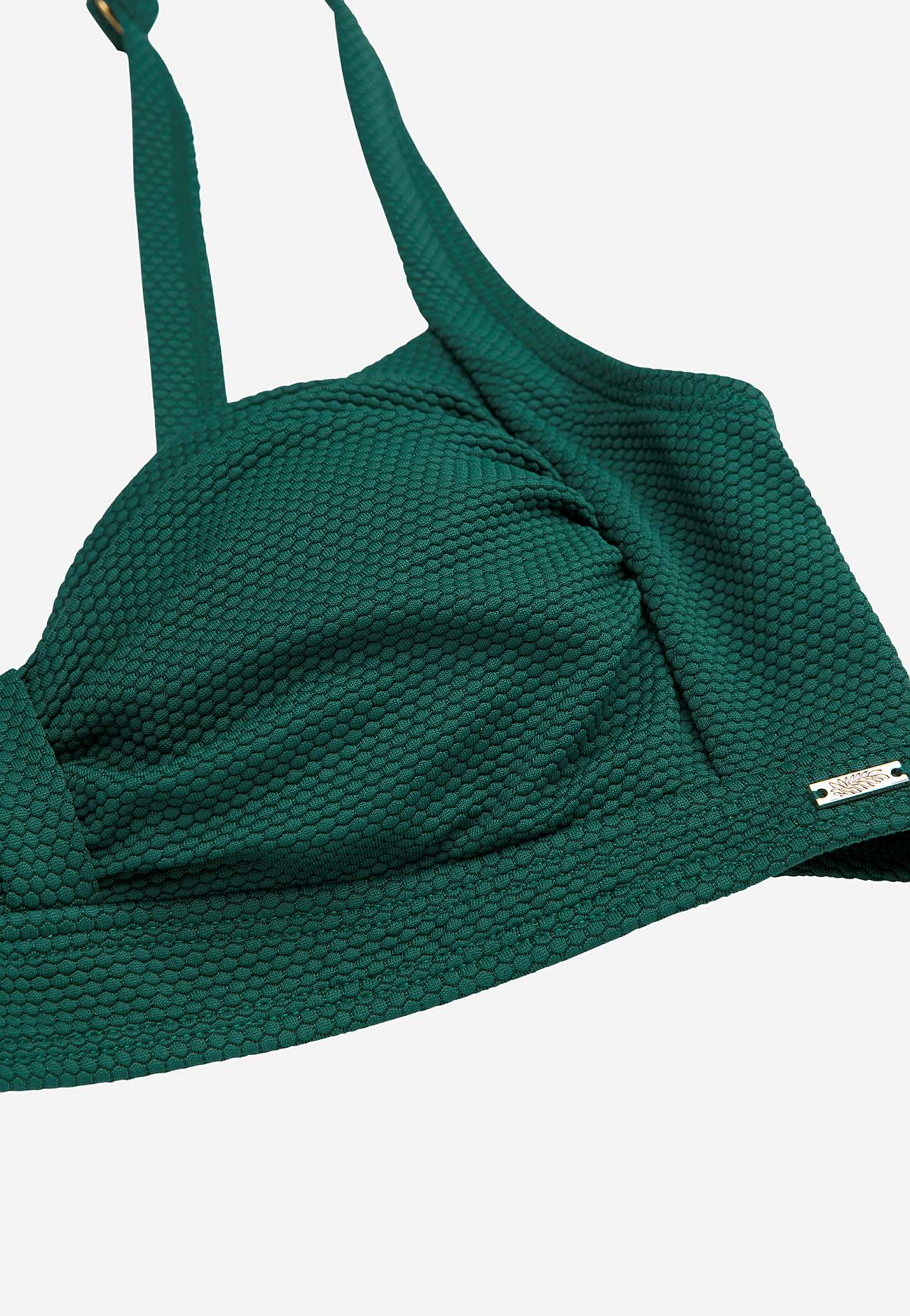Rakennekuvioinen bikiniyläosa poimutuksella rinnan yli. Pehmeä, kaaritueton malli kaarituilla sivuilla. Materiaali kierrätetystä polyesteristä. Kuppi irrotettavalla toppauksella. Säädettävät olkaimet. Helposti suljettava metallikiinnike takana.