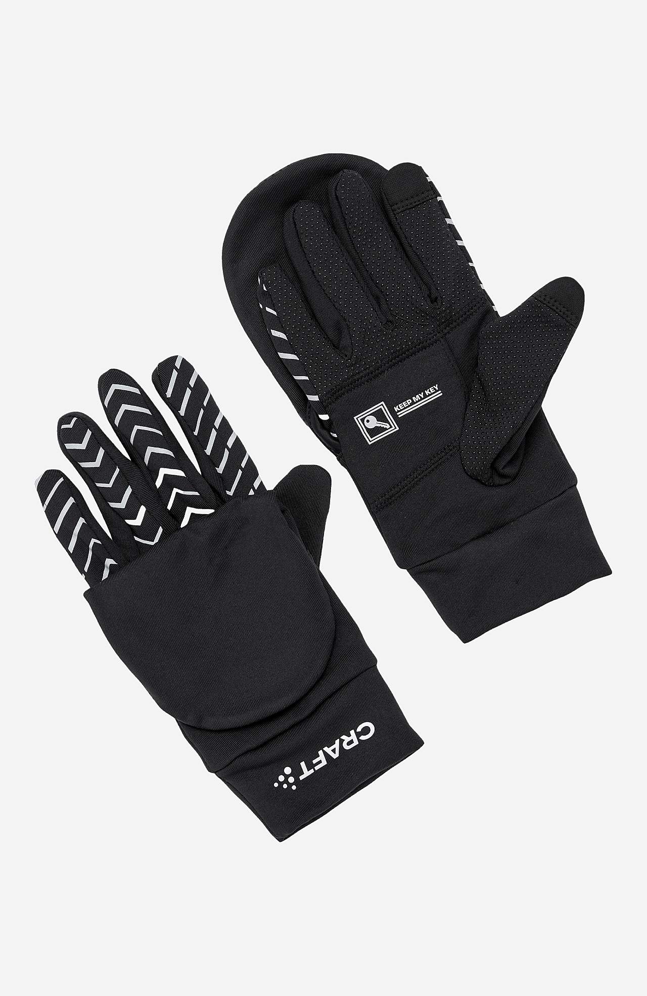 Käsineet heijastavilla yksityiskohdilla. Toiminnallinen, pehmeä trikoo. Fiksu avaintasku. 2-in-1 muotoilu käsineellä ja lisälapasella.