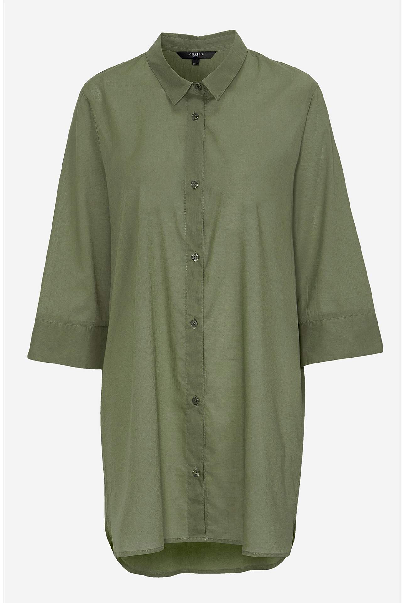 Kudottu, ohut paita mukavasta puuvillasta. Napitettu malli. 3/4-pituiset hihat. Pyöristetty helma. Pituus olkapäältä koon mukaan noin 86-98 cm.
